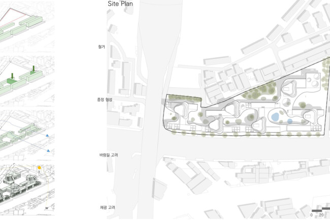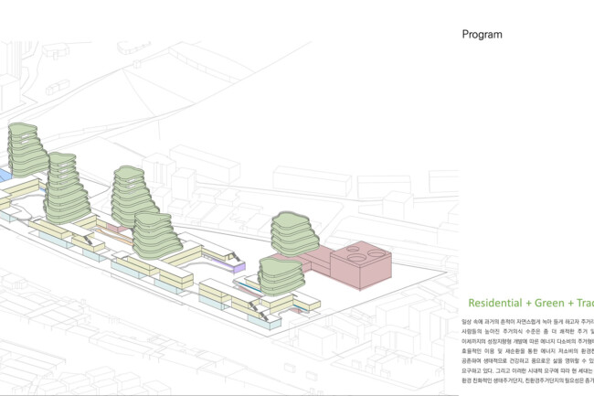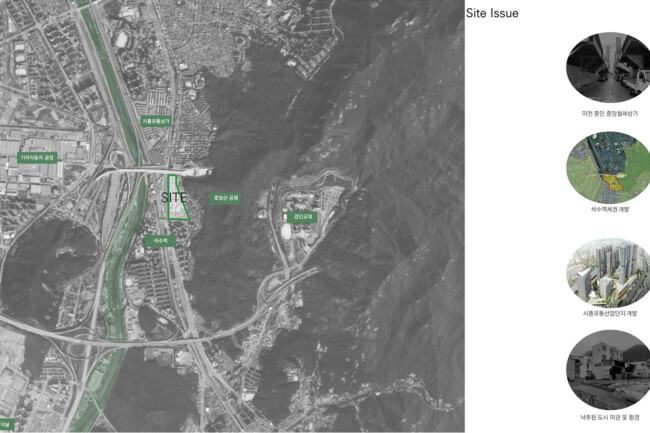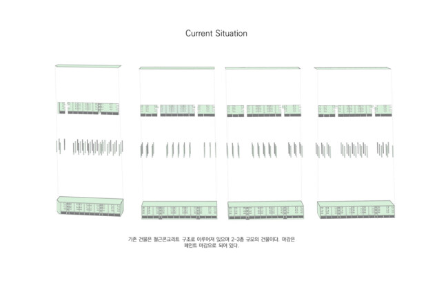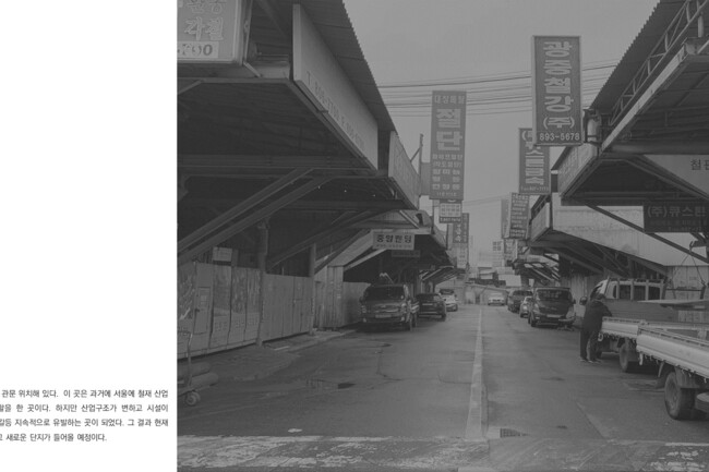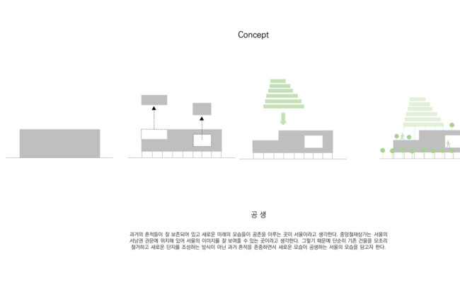 서울은 과거의 흔적과 현재의 모습이 일상 속에서 자연스럽게 공존한다는 매력을 가지고 있는 도시라고 생각한다. 실제로 광화문, 세운상가 등 과거의 흔적들이 우리 일상 속에 어우러져 공존하고 있다. 서울 금천구 시흥대로에는 철재중앙상가가 위치해 있다. 이 곳은 서울의 서남권 관문 위치에 놓여 있으며 과거 1970년대 산업사회 때 서울에서 철재 생산, 유통 및 제조의 중심지 역할을 했다. 많은 사람들은 이 곳에서 땀을 흘리며 일을 했고 경제 발전에 막대한 영향을 미쳤다. 하지만 현재 산업구조가 변화하고 시간이 지나 이 곳은 낙후되고 노후화 되었다. 더불어 이 곳에서 철재를 생산 및 제조할 때 발생되는 소음과 오염물질들은 주변 주민들에게 피해를 주고 있다. 그 결과 중앙철재상가는 이전 중에 있으며 조만간 완벽하게 이전이 완료될 것이라고 한다. 금천구에서는 중앙철재상가를 이전하고 남은 건물은 철거하고 새로운 주거 복합 단지를 형성할 것이라고 한다. 과거의 흔적과 현재의 모습이 공존하고 있는 서울에서 과거의 흔적을 말끔히 지워버리고 보편화된 새로운 모습을 형성하는 방향의 개발이 과연 옳은 방향의 개발일까? 더욱이 서울 서남권 관뭔에 위치한 중앙철재 상가에 대해 우리는 이에 대해 좀 더 신중하게 생각할 필요가 있다. 더불어 중앙철재상가 주변으로 주거단지들이 지속적으로 들어오고 있고 개발이 될 예정이다. 이런 시대의 변화에 따라 중앙절재상가 또한 대응이 필요하다고 생각한다. 금천구의 도시 환경은 여러 산업단지들로 인해 소음, 악취, 오염 등이 발생하고 그로 인하여 이 곳에서 살아가는 주민들에게 악영향을 미치고 있다. 반면 사람들의 높아진 의식수준은 인간과 자연이 공존하면서 생태적으로 건강하고 쾌적한 환경친화적 주거 환경을 요구하고 있다. 그렇기에 단순히 기존 건물을 철거하고 새로운 모습을 조성하는 방향의 개발이 아닌 서울의 과거 흔적을 존중하면서 시대가 필요로 하는 생태적 주거 환경을 계획하여 과거와 현재가 일상 속에 자연스럽게 공생하는 프로젝트를 제안하고자 한다.