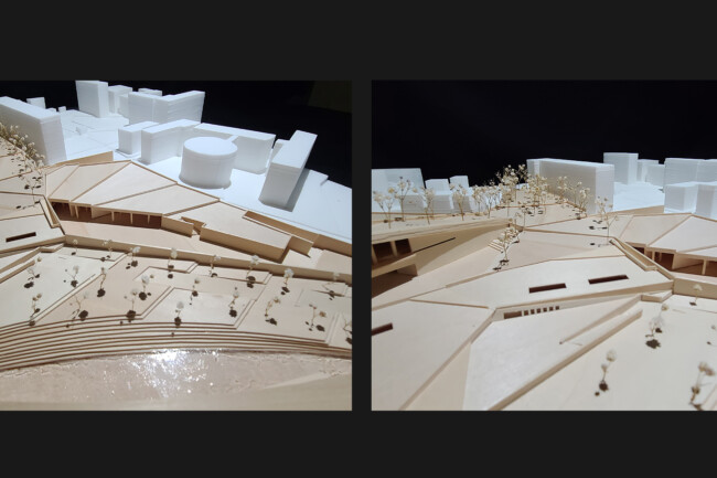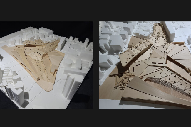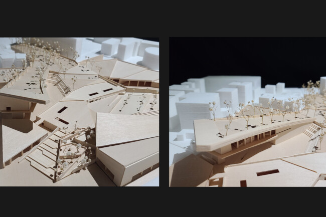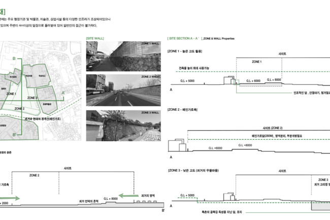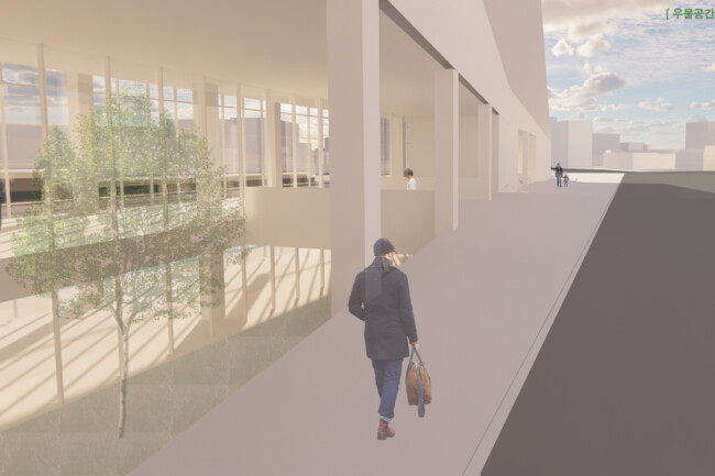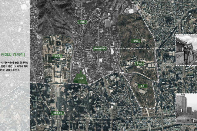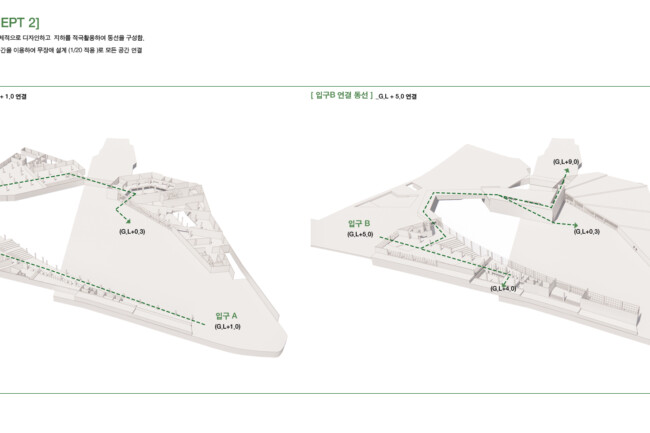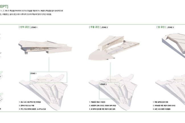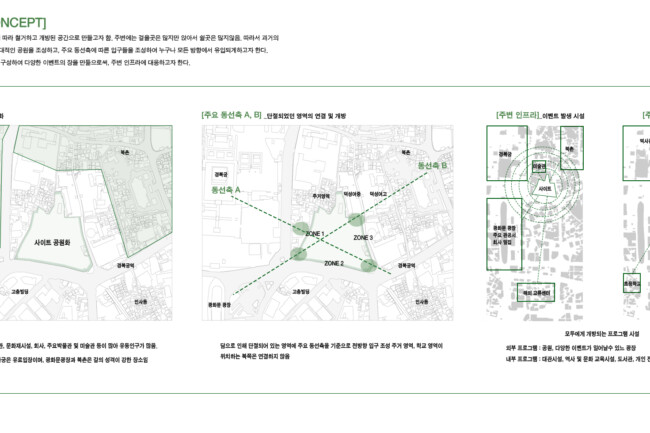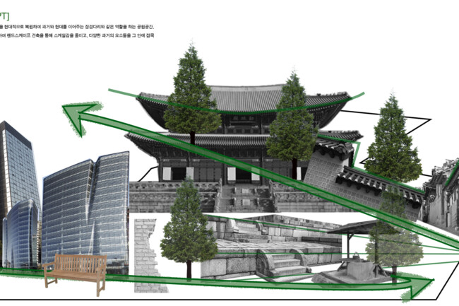 이러한 단절을 해결하기 위해 과거의 영역과 현대의 영역의 조화로운 뒤섞임이 필요하다고 생각했다. 사이트에 과거의 영역을 담기 위하여 소나무언덕을 재현하고자 하였으며, 단순한 복원이 아니라 현대의 영역에 대응하여 랜드스케이프 건축을 통해 위로는 과거의 영역, 아래로는 현대적인영역이 어울릴 수 있게 구성하였다. 이 뿐만 아니라 단절되었던 사람들의 발자국이 다시 한번 이 땅 위에 새겨지는 만큼 모든 사람들이 이용할 수 있는 외부로는 개방적인 영역인 공원 프로그램을 도입하였으며, 내부는 사람들이 만들어가는 다양한 이벤트가 발생되는 공간들, 주변의 학생들과 연계하는 교육프로그램 등의 시민참여 프로그램들로 구성하였다. 형태뿐만 아니라 프로그램들도 과거와 현대를 연결해주는 징검다리 역할을 한다.
