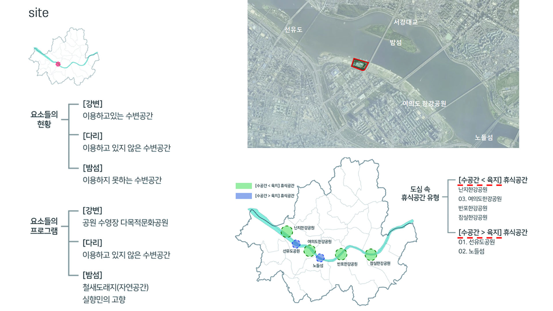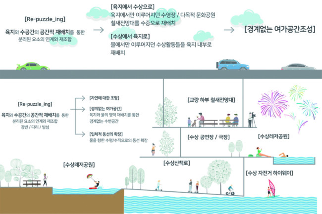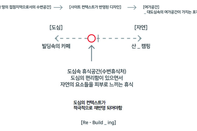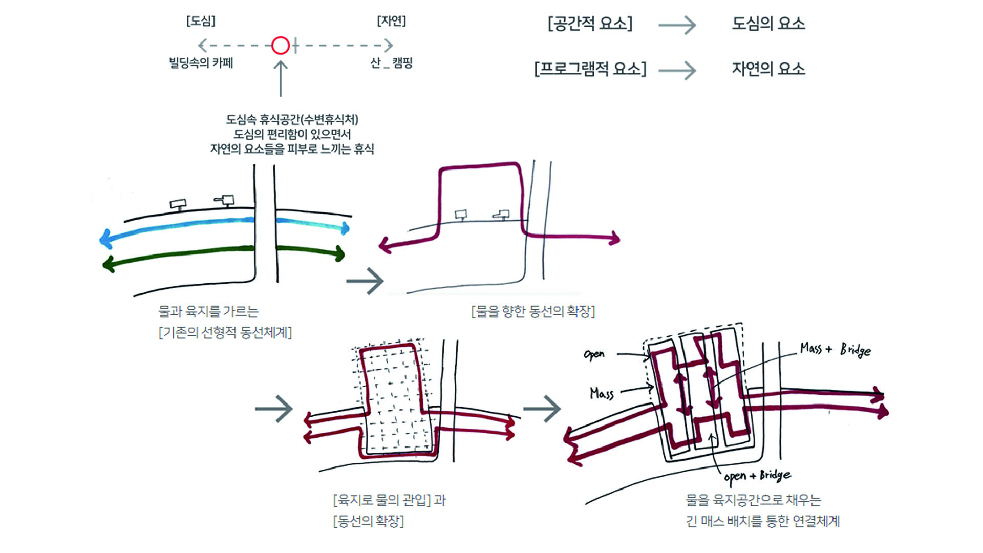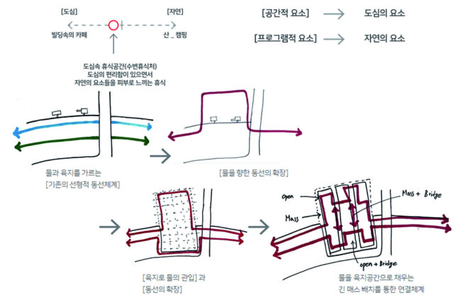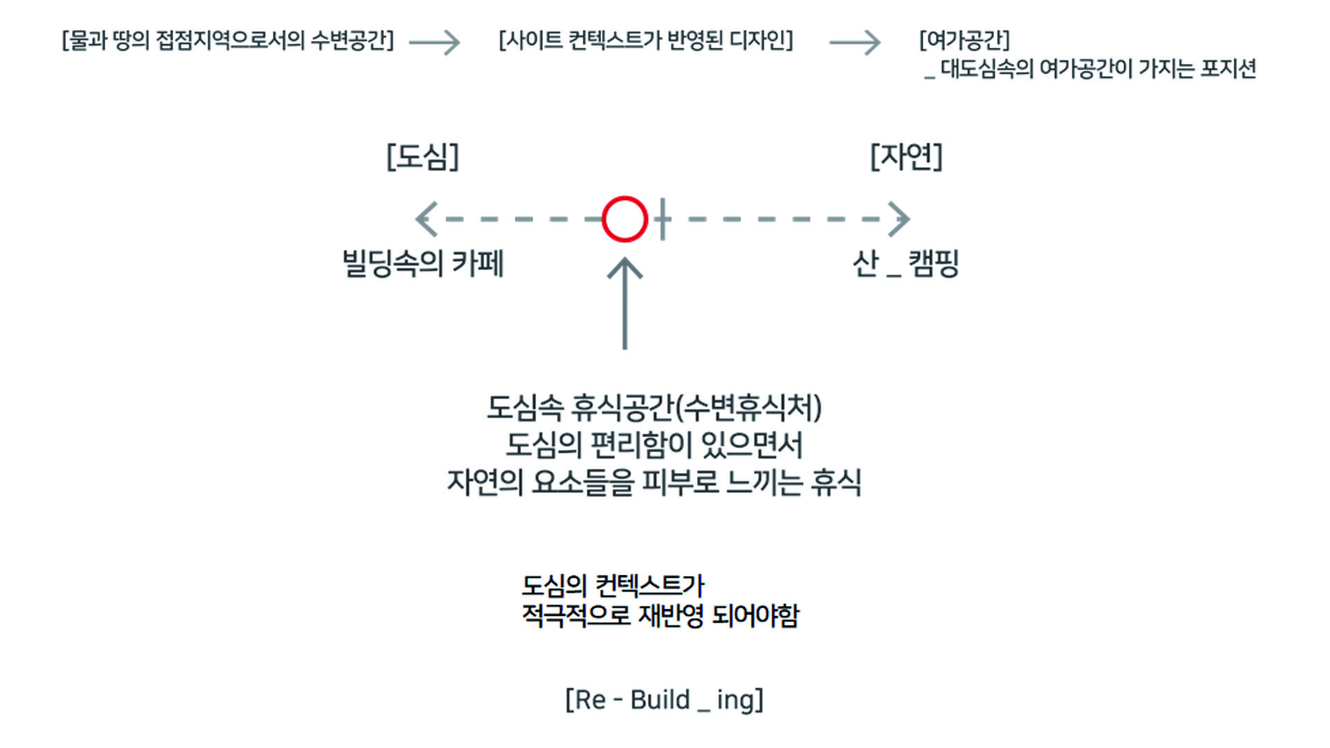 육지와 수공간의 공간적 재배치를 통해 수변공간에 대해 더욱 적극적으로 다가가는 수변휴식공간을 제안하고자 한다.