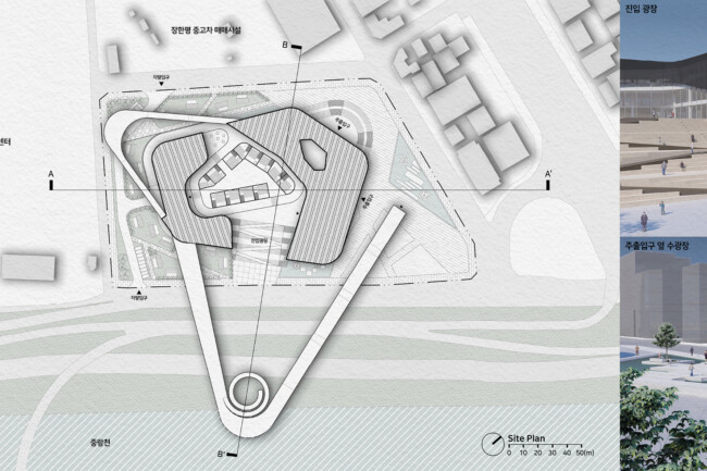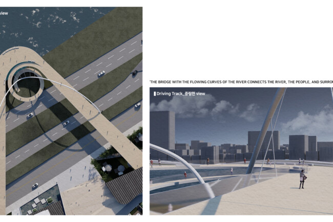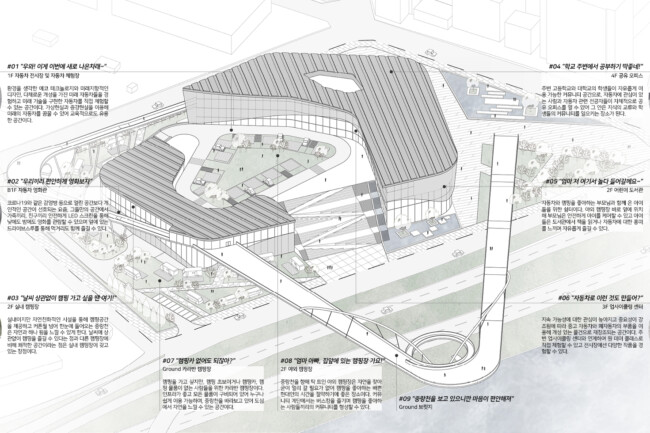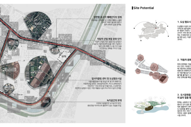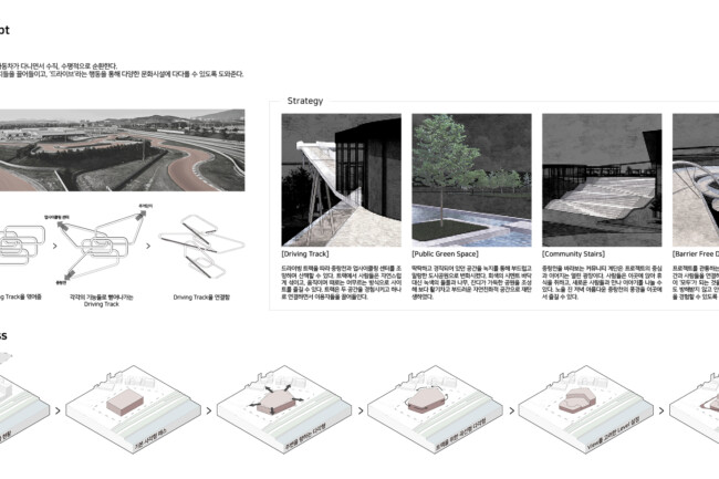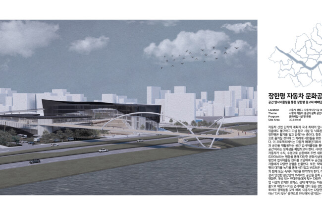 이 프로젝트에서는 자동차 매매단지로써 기존 활용도가 낮은 건물과 공간을 재활용하는 공간 업사이클링을 통해 장한평을 ‘자동차 문화 공간’이라는 정체성을 확립하고자 한다. 사이트 내의 “트랙”은 사람들과 자동차가 수직, 수평으로 순환하며 주변 새로운 가치들을 끌어당기고, 드라이브라는 행동을 통해 다양한 문화시설에 닿게 한다. 이 트랙은 중랑천과 업사이클링 센터를 조망하며 두 공간을 사이트로 흡수하여 이용자들에게 다양한 경험을 선물한다. 또한, 딱딱하고 경직되어 있던 장한평의 대지를 녹지를 통해 생기있고 부드러운 공간으로 변화시켜 중랑천과 함께 도심 속에서 자연을 만끽하게 한다.