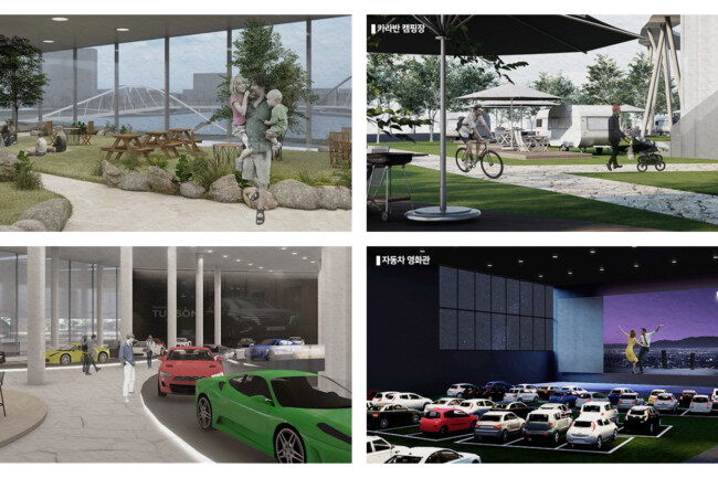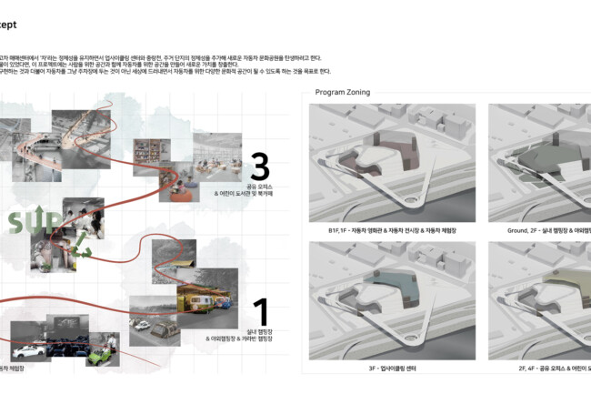 미래지향적인 자동차 전시장과 안전한 본인만의 프라이빗 공간을 문화 공간으로 바꿔주는 자동차 영화관, 개성 있는 현대인들에게 맞는 다양한 스타일의 캠핑장, 주변 학업 시설과 연계한 오피스, 실제 폐기되는 자동차의 부품을 자신만의 물품으로 재창조시키는 업사이클 센터 등은 장한평이 자동차 문화 공간으로써의 정체성을 갖게 하며, 이용자는 다양한 시설을 즐기고 일회성이 아닌 ‘다시 찾는’ 공간으로 인식하여 생기있는 공간이 된다.