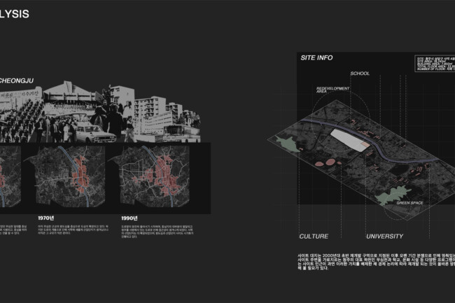 청주는 무분별한 도심의 팽창으로 인해 원도심의 쇠퇴가 지속적으로 이루어지고 있다. 이로 인해 역설적으로 청주의 가장 중심부는 가장 낙후된 곳으로 슬럼화 현상이 나타나게 되었다. 본 프로젝트에서는 이러한 청주의 원도심 중 경제적 이유로 인해 재개발마저 이루어지지 못하는 곳에 어떤 방향의 개발이 이루어져야 하는지를 탐구하는 것을 목적으로 한다.