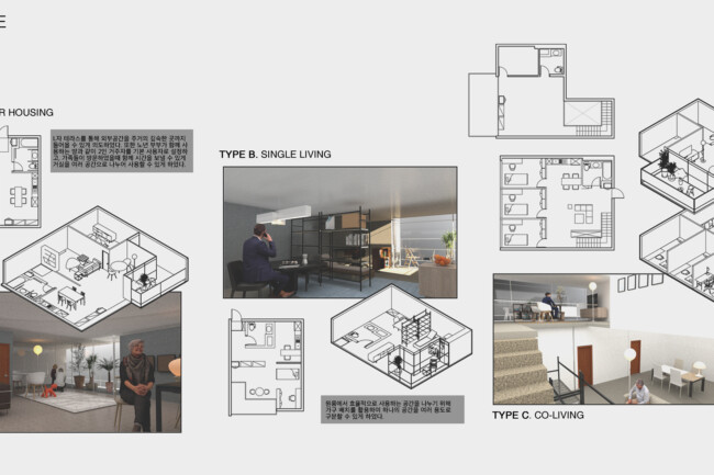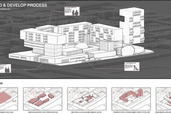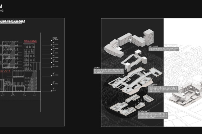 따라서 해당 프로젝트를 통해 첫 번째로 주거 단지가 도시에게 제공하는, 도시가 주거 단지에게 영향을 끼치는 행위가 어떻게 이루어질 수 있는지를 탐구하고자 한다. 두 번째로는 변화하는 도시의 구성원들을 포용할 수 있는 주거 단지는 어떤 주거를 구성원들에게 제공할 수 있는지 제안하고자 한다.