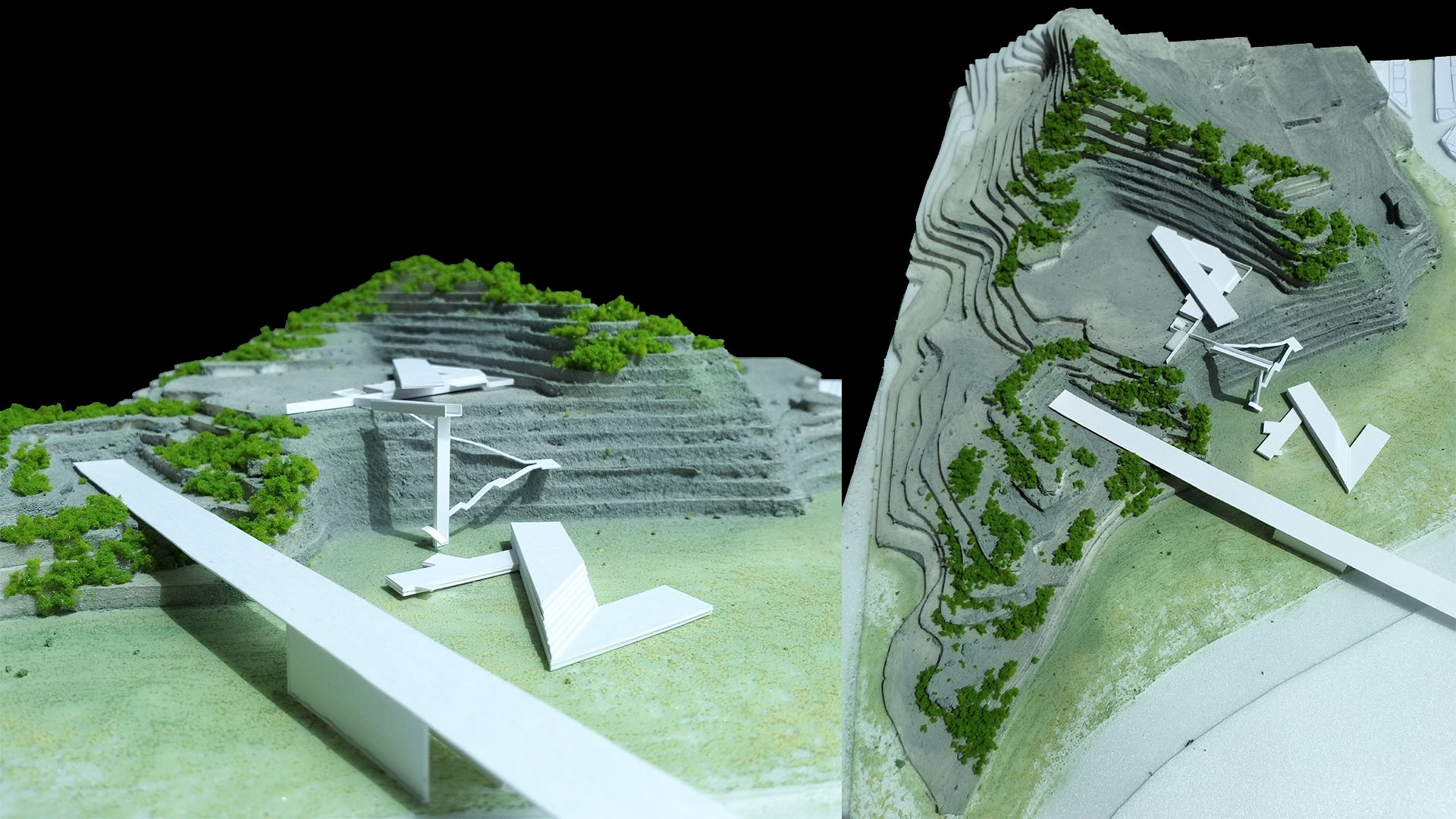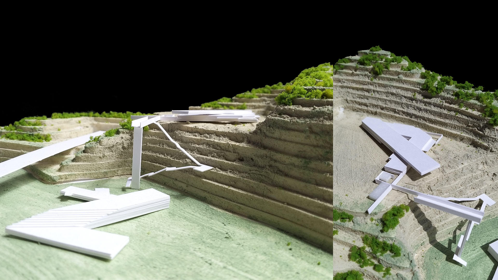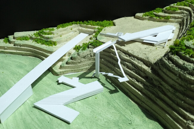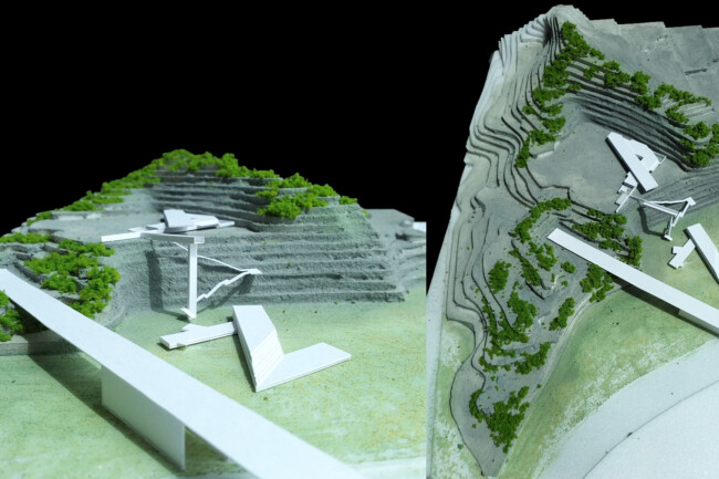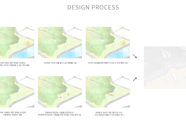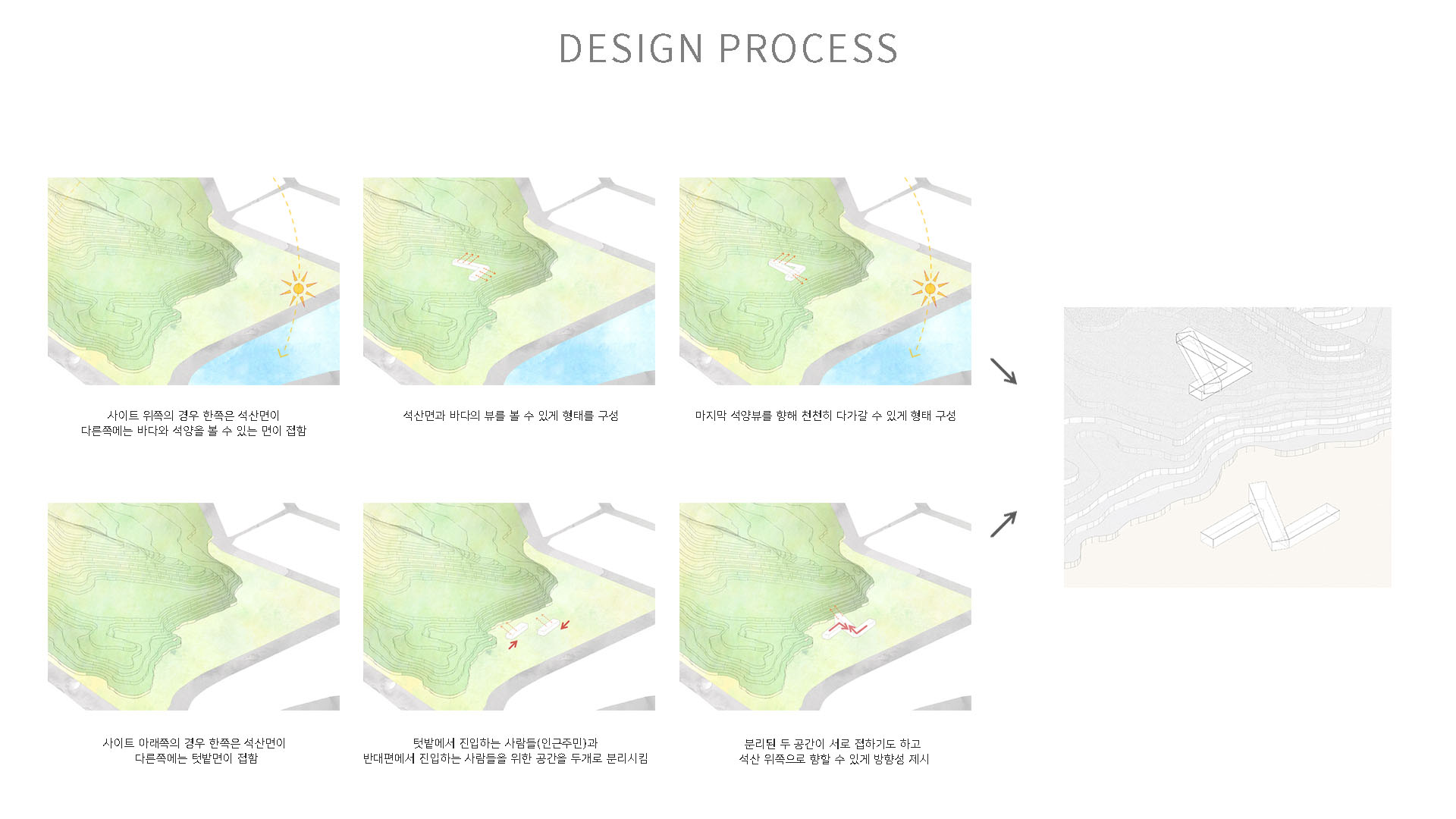 디자인 방식은 석산의 면과 주변 자연요소의 큰축들을 서로 교차시켜 빈 공간에 형태를 완성시켰나갔습니다. 아래쪽에는 기존 땅에 있는 텃밭과 함께 사용할 수 있는 공용공간과 이곳에 처음 온사람들에게 이 공간을 알려주는 표지판같은 역할로써의 갤러리를 두었습니다. 위쪽은 좀 더 산책에 집중시켜서 천천히 주변경관을 보면서 다닐 수 있게 계획하였고 중간중간 자연요소를 활용한 작품들을 볼 수 있는 갤러리를 두었습니다.