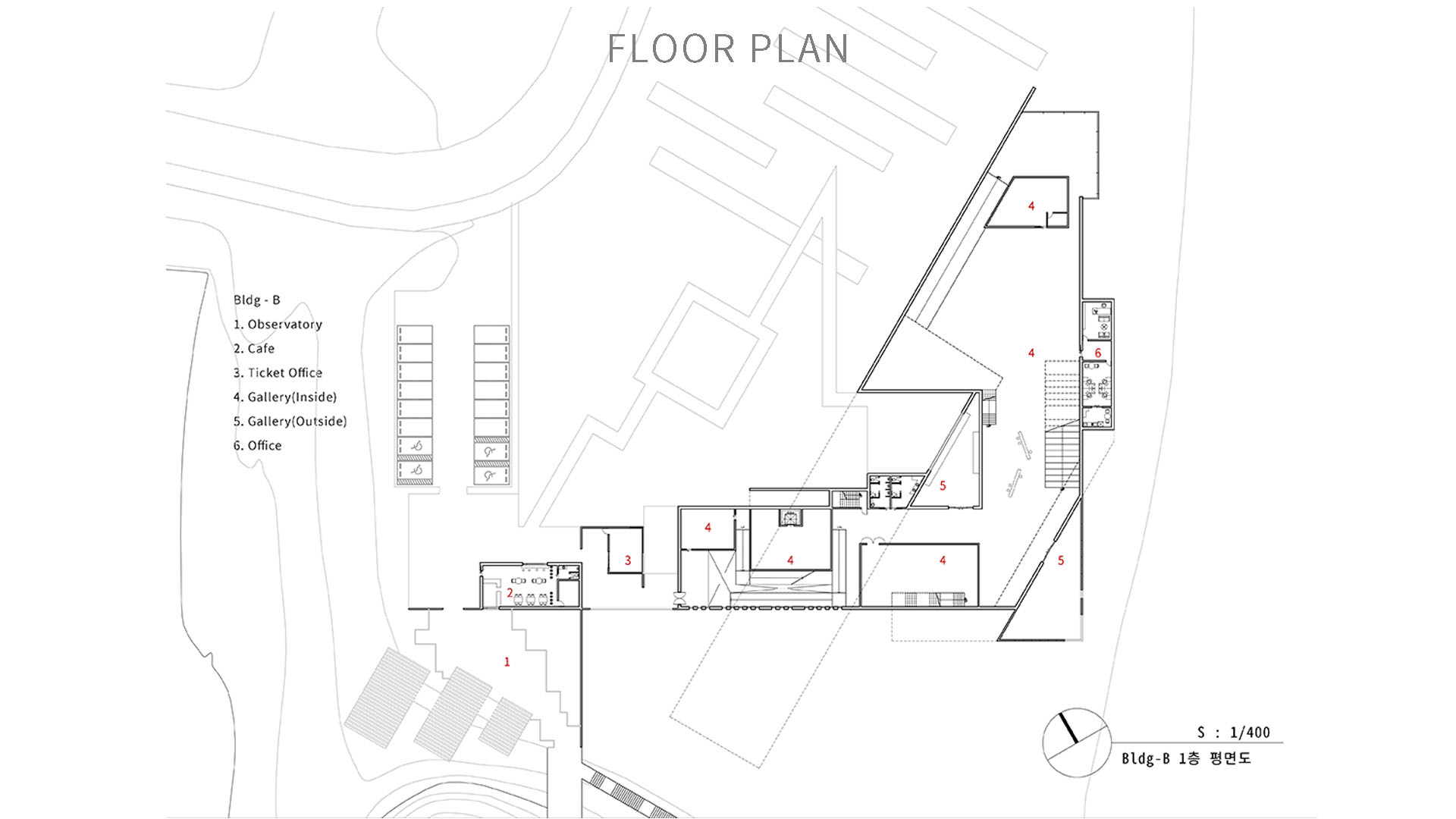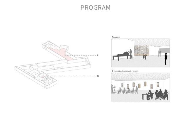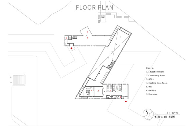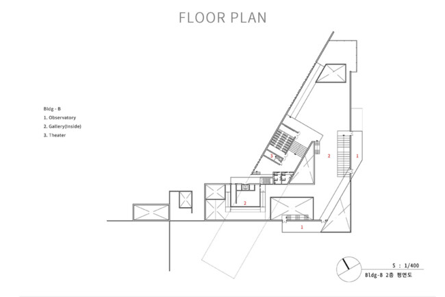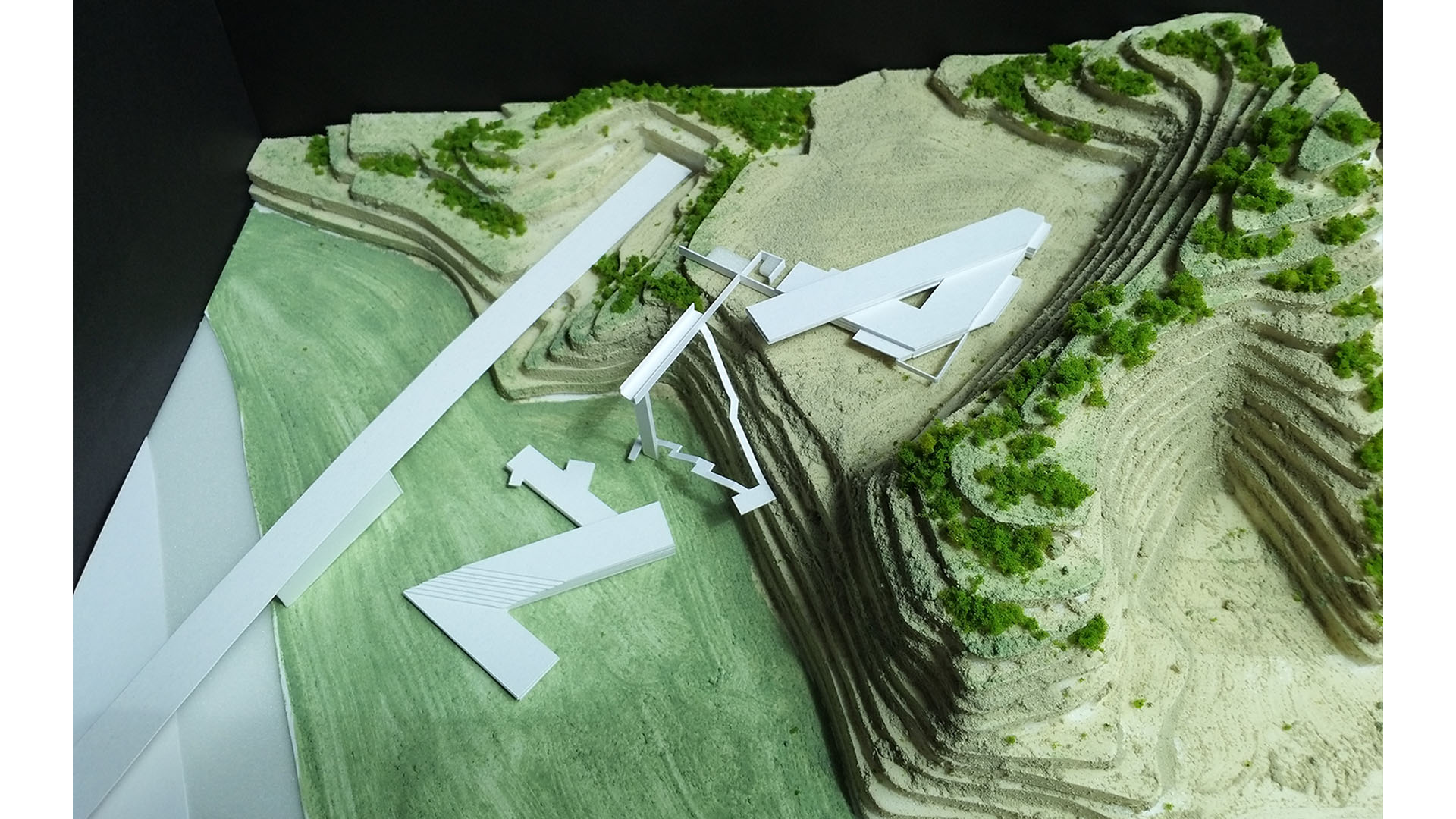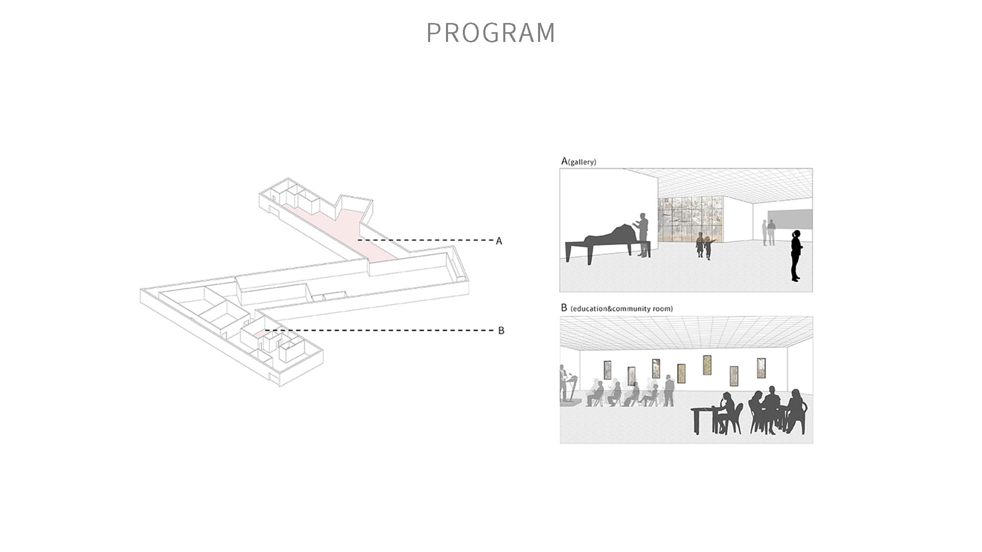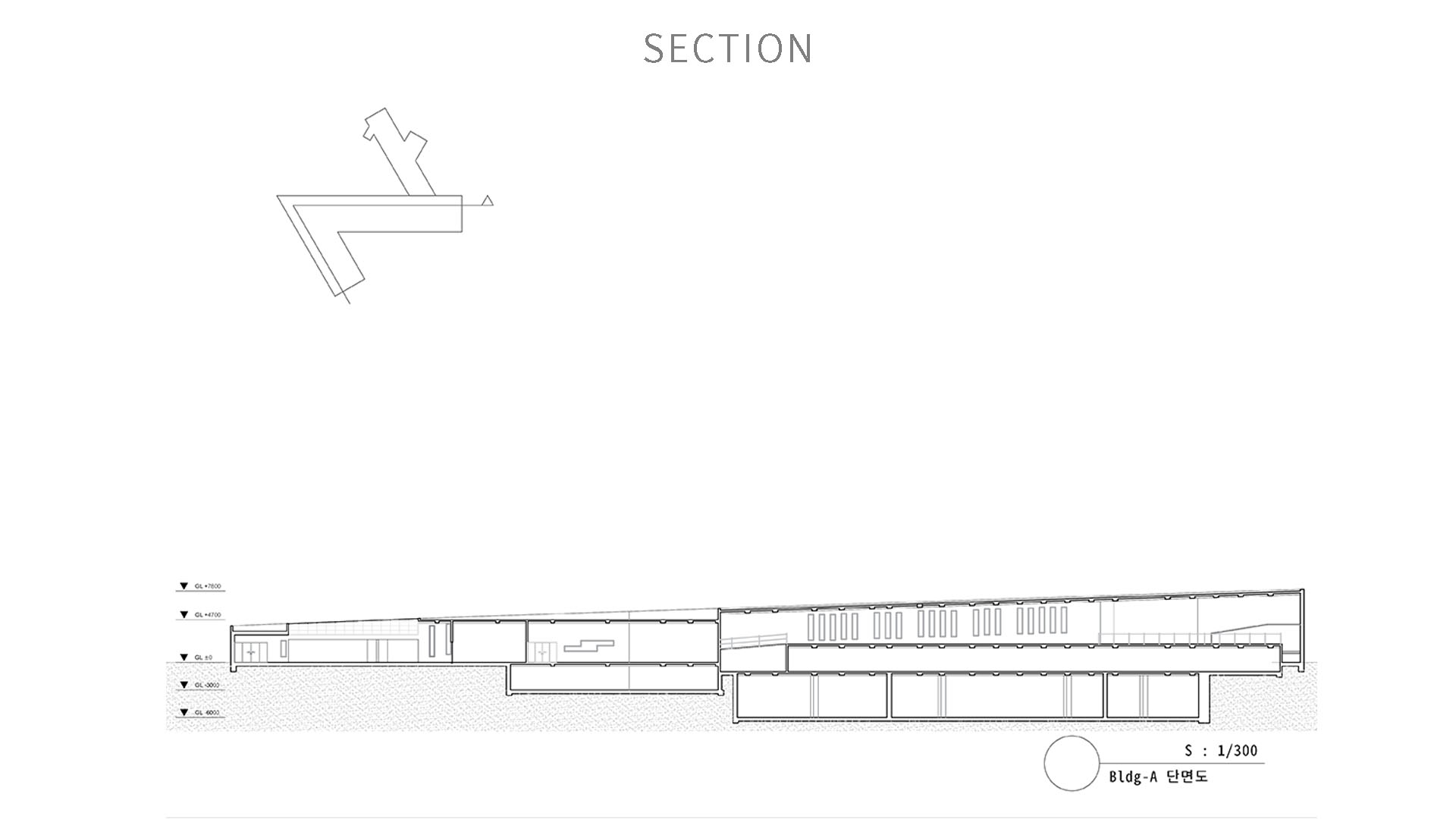 디자인 방식은 석산의 면과 주변 자연요소의 큰축들을 서로 교차시켜 빈 공간에 형태를 완성시켰나갔습니다. 아래쪽에는 기존 땅에 있는 텃밭과 함께 사용할 수 있는 공용공간과 이곳에 처음 온사람들에게 이 공간을 알려주는 표지판같은 역할로써의 갤러리를 두었습니다. 위쪽은 좀 더 산책에 집중시켜서 천천히 주변경관을 보면서 다닐 수 있게 계획하였고 중간중간 자연요소를 활용한 작품들을 볼 수 있는 갤러리를 두었습니다.