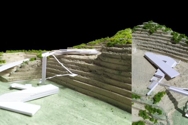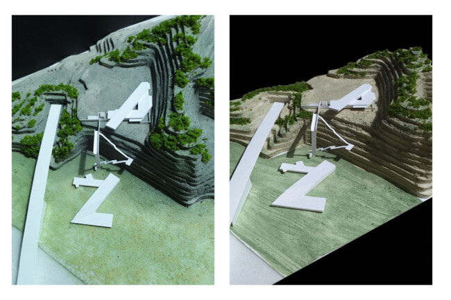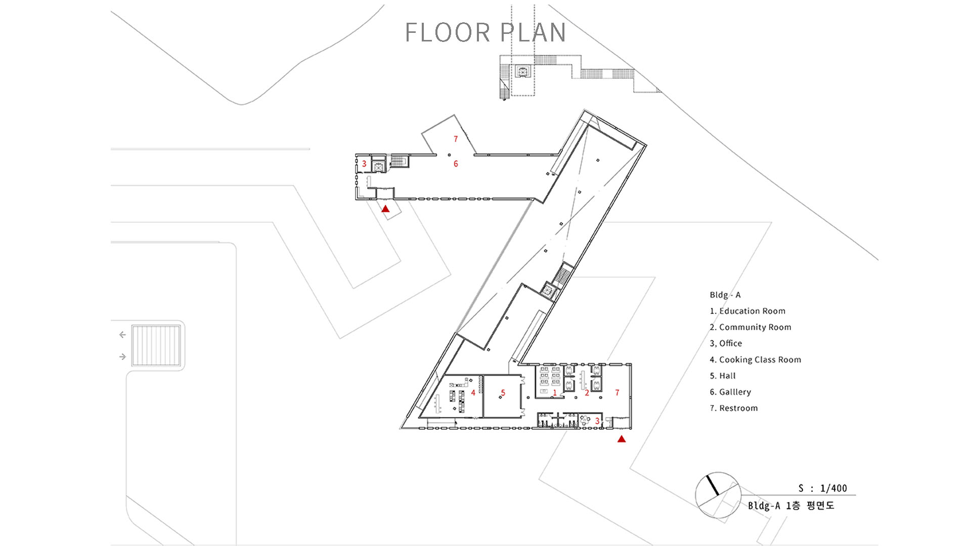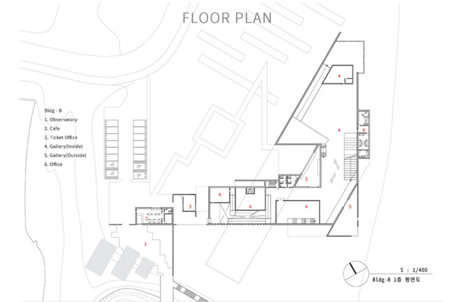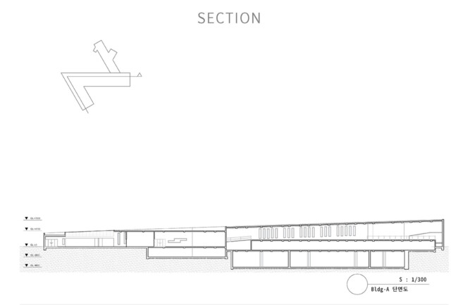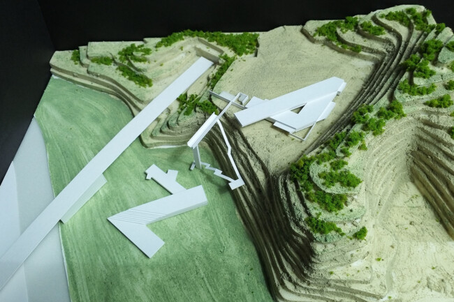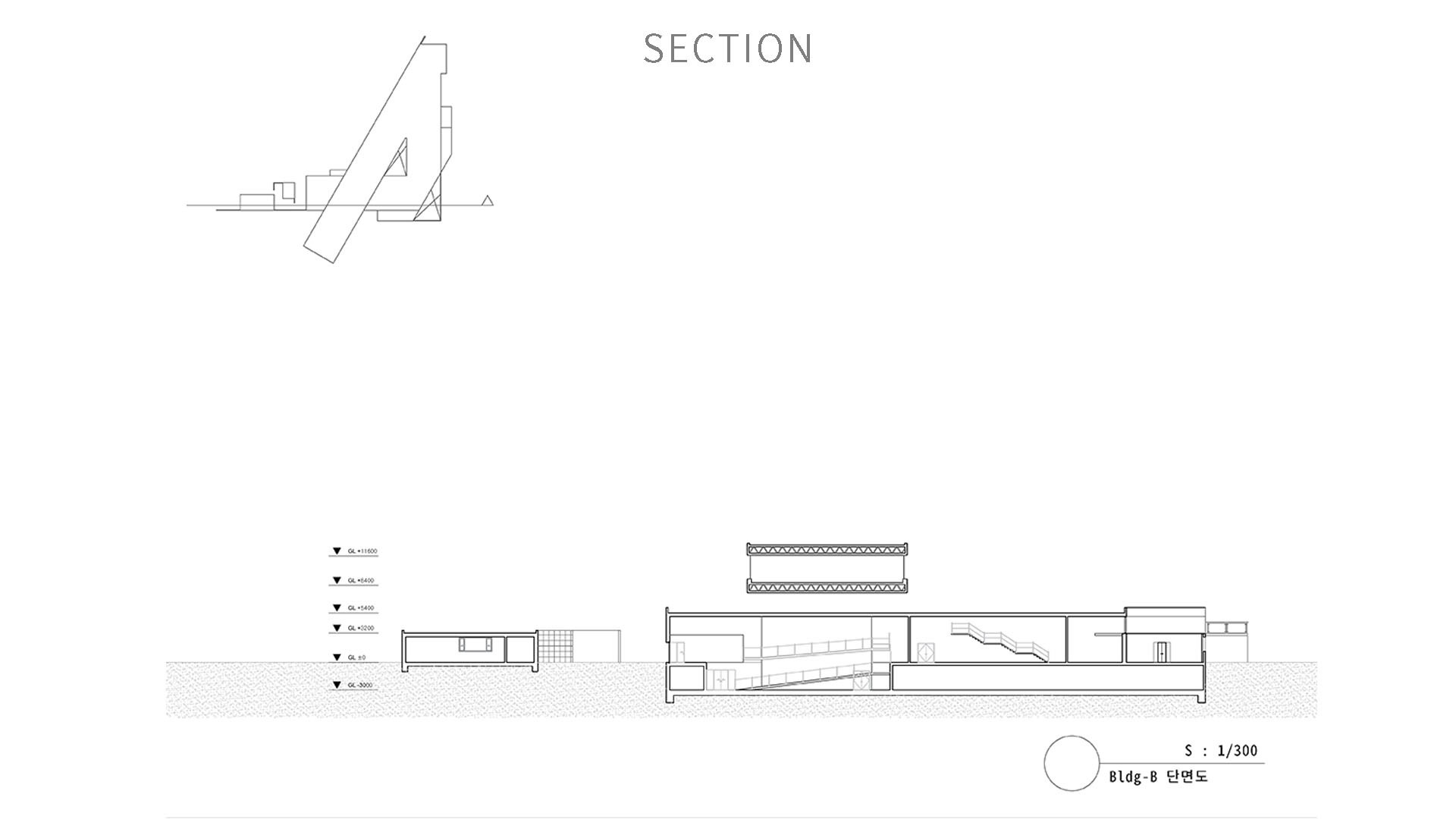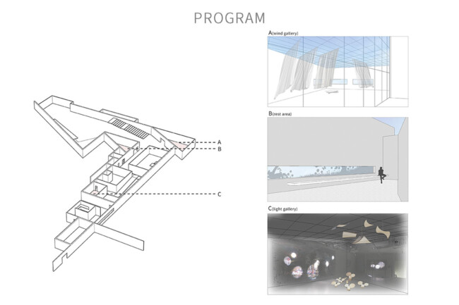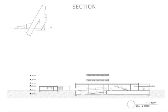 디자인 방식은 석산의 면과 주변 자연요소의 큰축들을 서로 교차시켜 빈 공간에 형태를 완성시켰나갔습니다. 아래쪽에는 기존 땅에 있는 텃밭과 함께 사용할 수 있는 공용공간과 이곳에 처음 온사람들에게 이 공간을 알려주는 표지판같은 역할로써의 갤러리를 두었습니다. 위쪽은 좀 더 산책에 집중시켜서 천천히 주변경관을 보면서 다닐 수 있게 계획하였고 중간중간 자연요소를 활용한 작품들을 볼 수 있는 갤러리를 두었습니다.