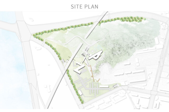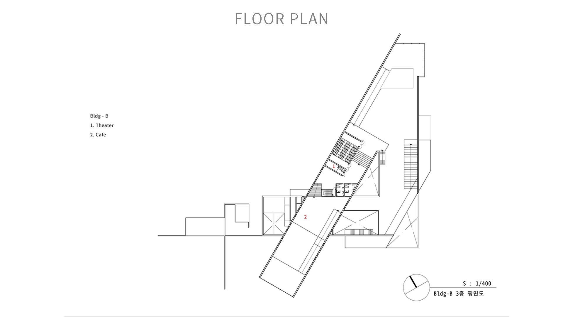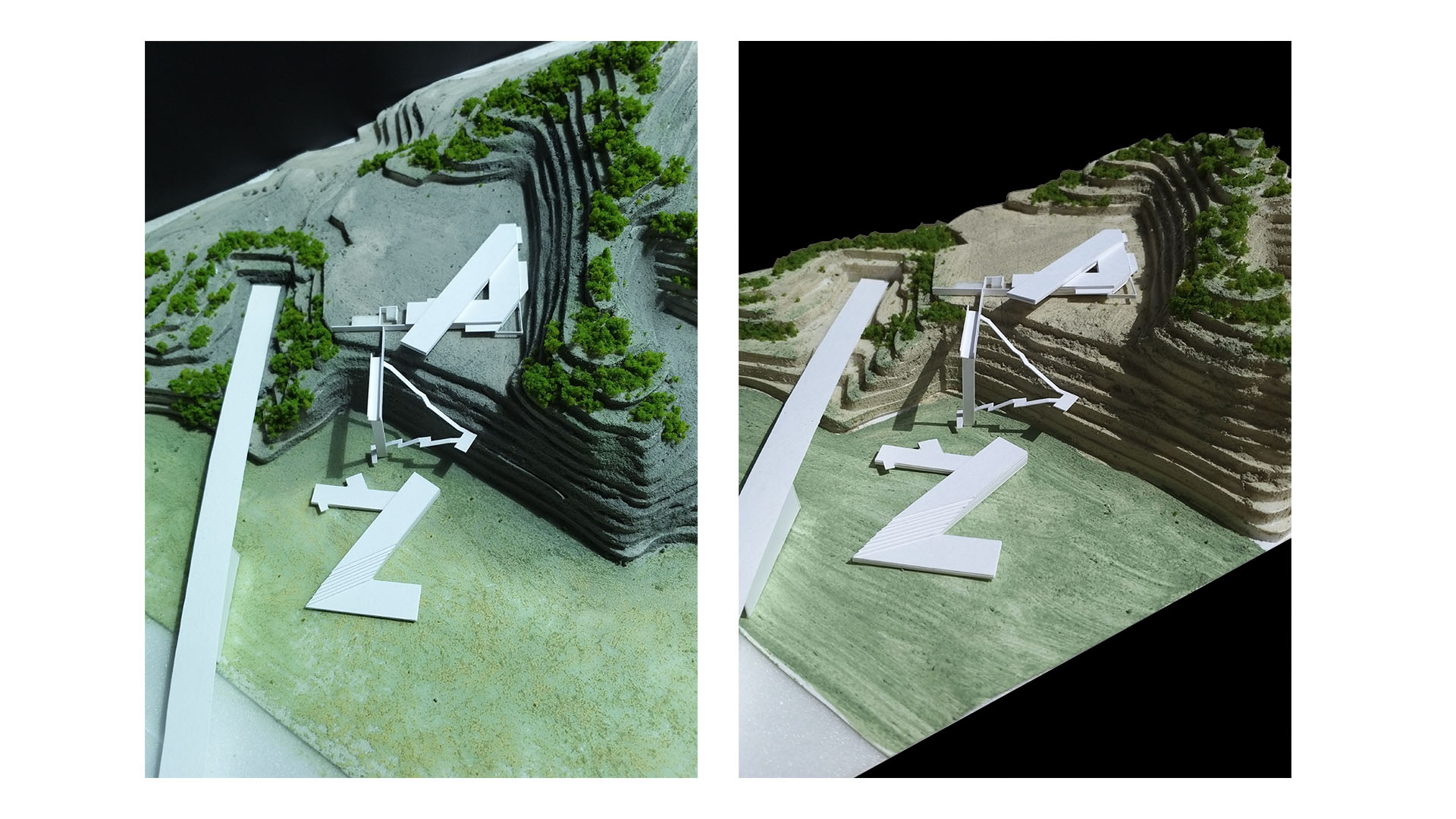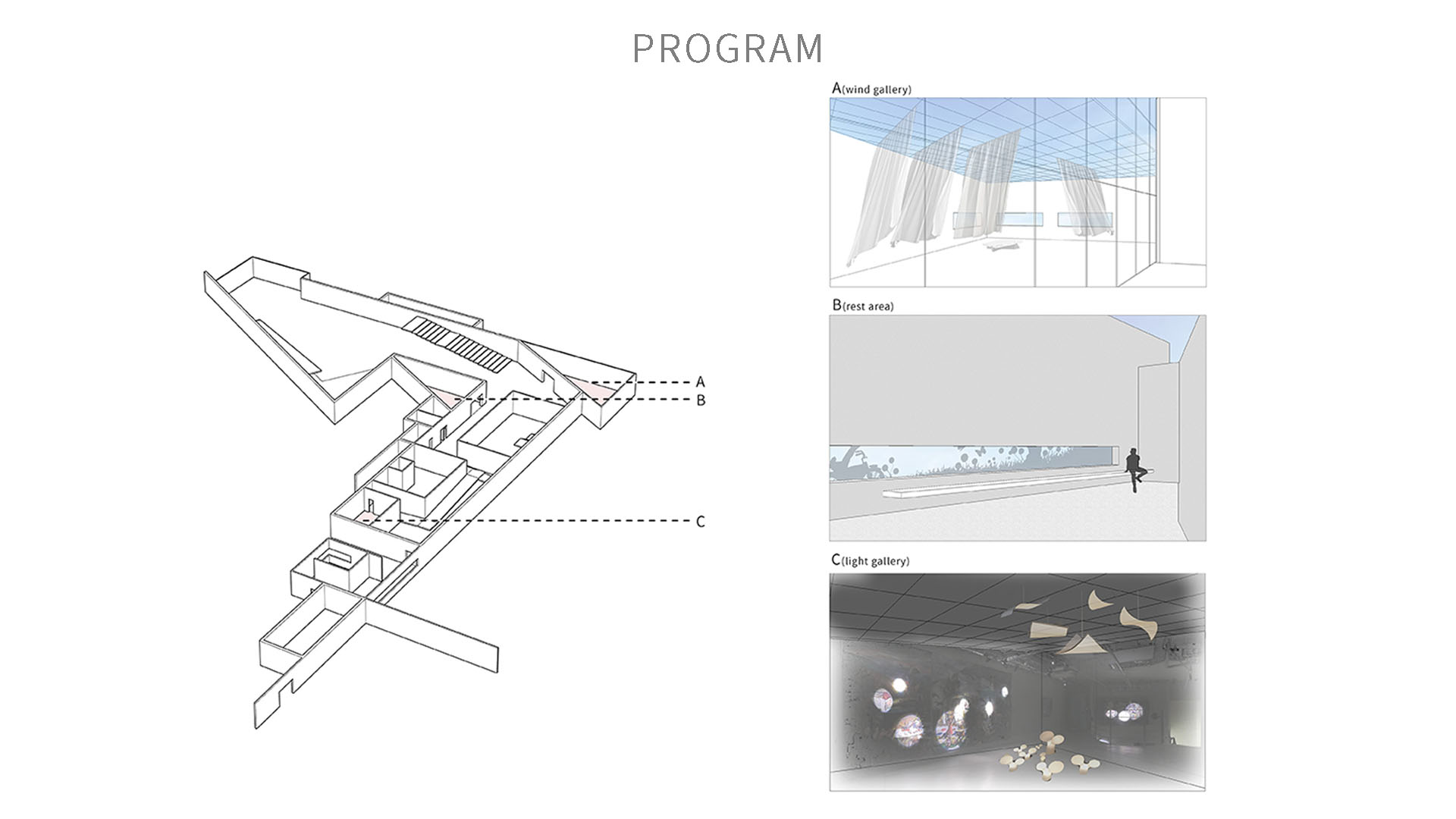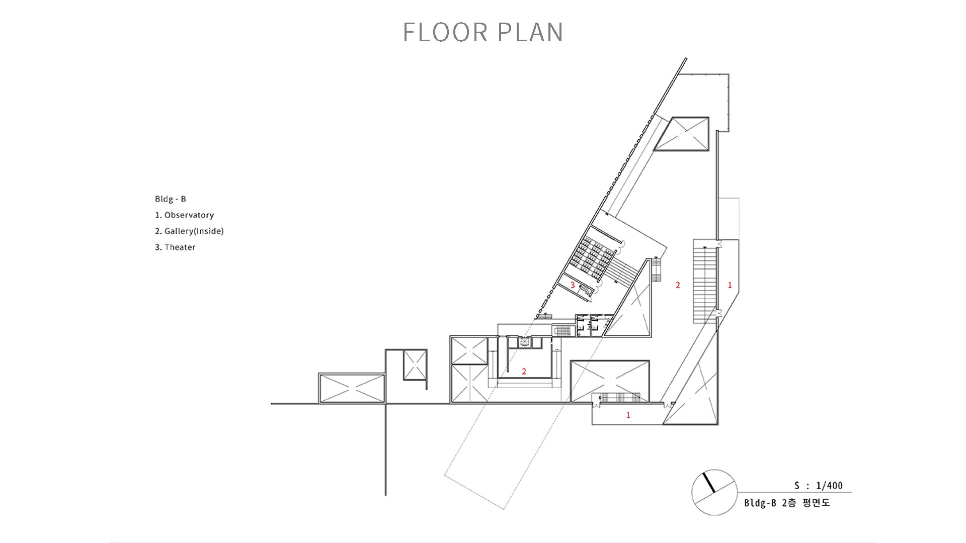 디자인 방식은 석산의 면과 주변 자연요소의 큰축들을 서로 교차시켜 빈 공간에 형태를 완성시켰나갔습니다. 아래쪽에는 기존 땅에 있는 텃밭과 함께 사용할 수 있는 공용공간과 이곳에 처음 온사람들에게 이 공간을 알려주는 표지판같은 역할로써의 갤러리를 두었습니다. 위쪽은 좀 더 산책에 집중시켜서 천천히 주변경관을 보면서 다닐 수 있게 계획하였고 중간중간 자연요소를 활용한 작품들을 볼 수 있는 갤러리를 두었습니다.