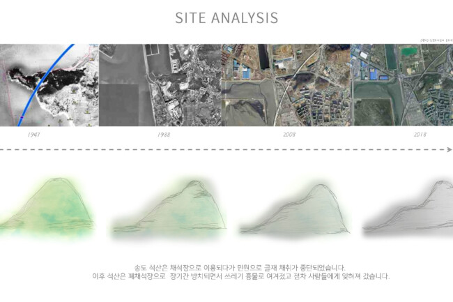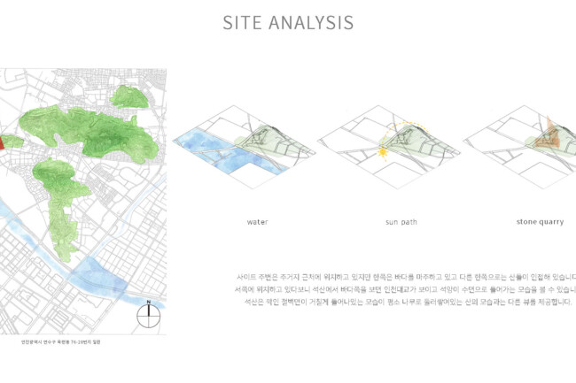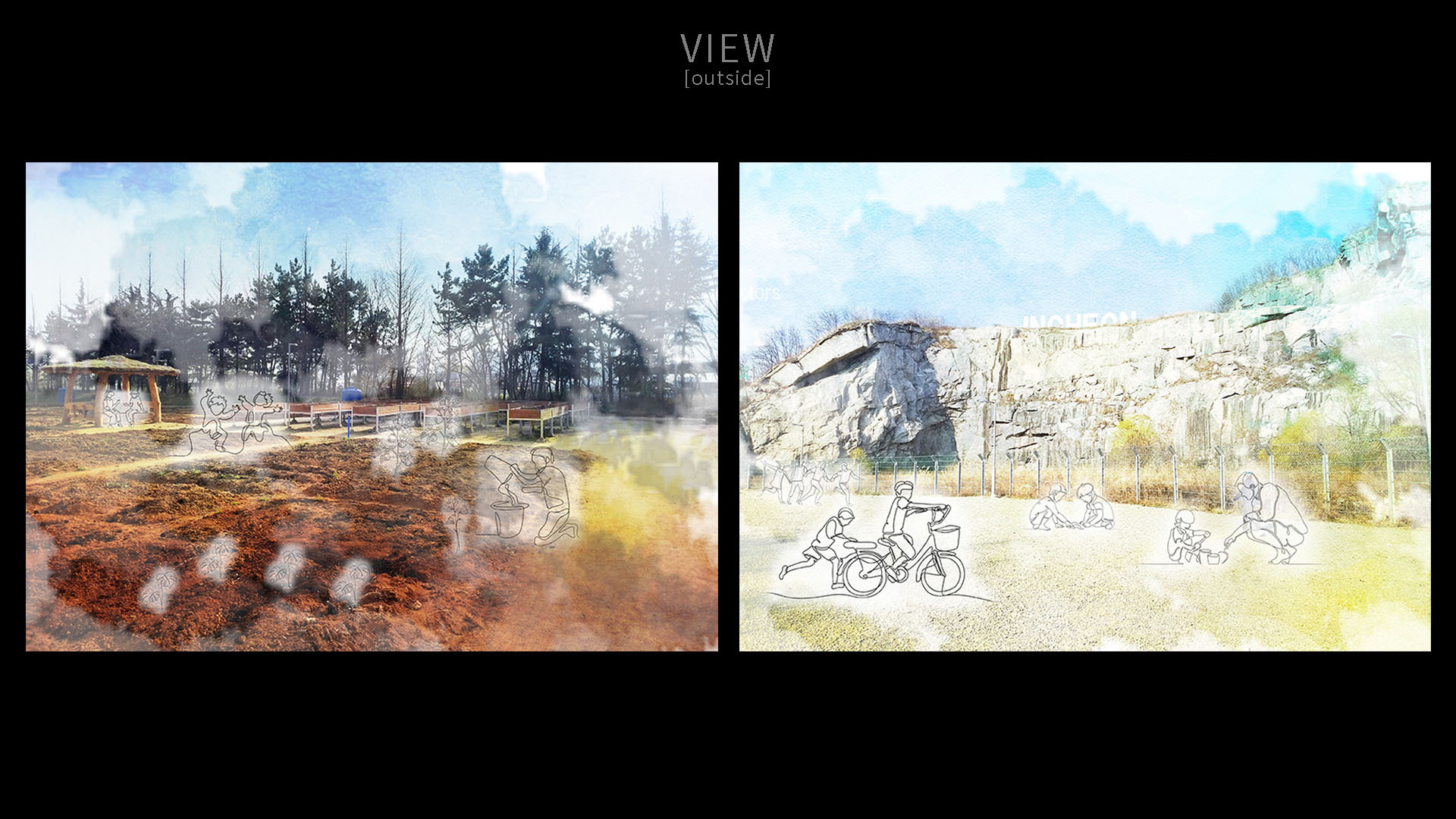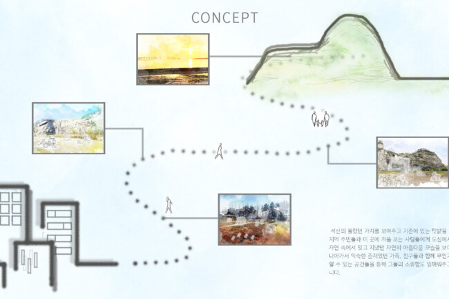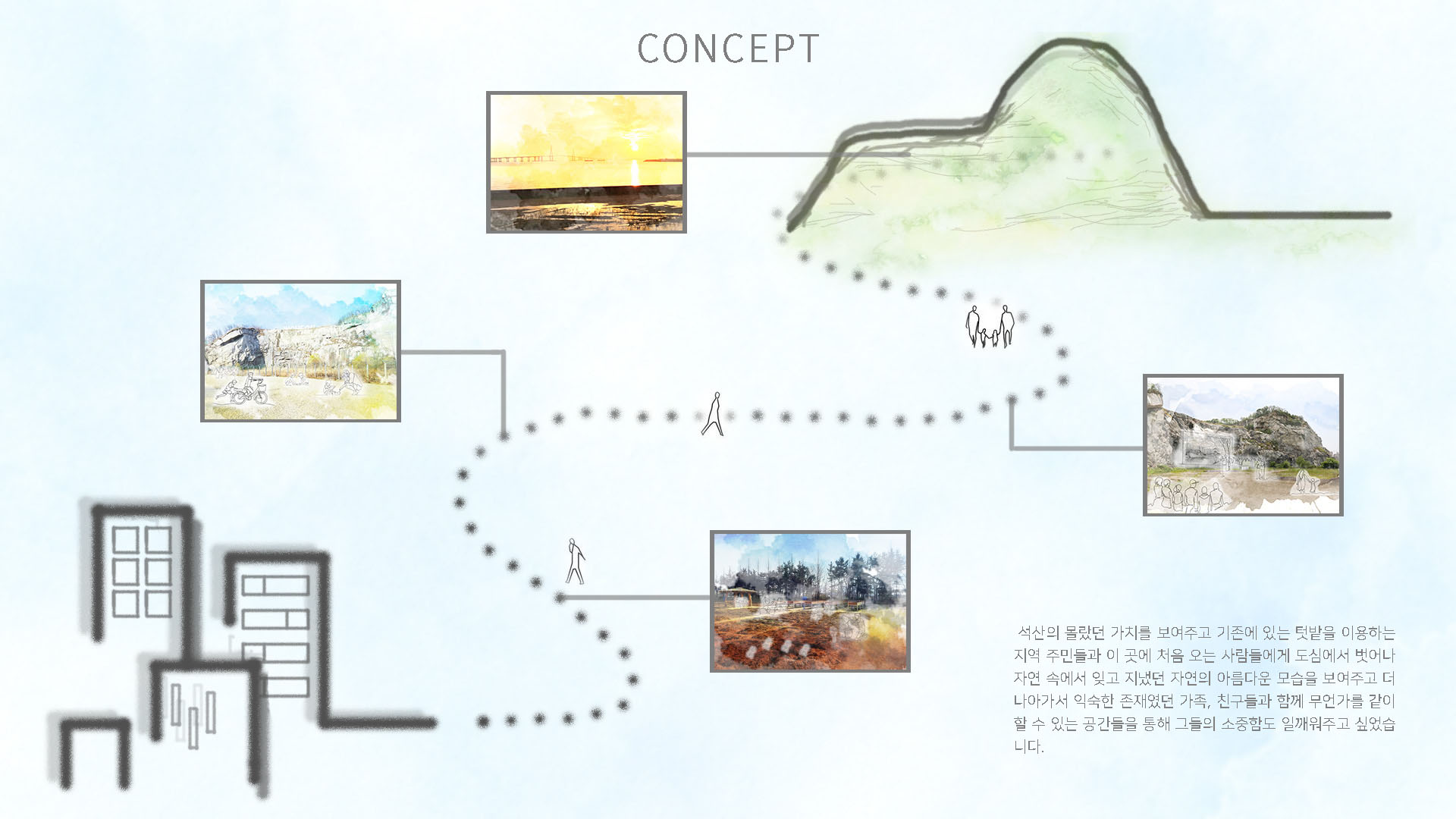 저는 화강암 채석장으로 쓰이다 버려진 석산을 사이트로 선정해 그공간의 가치를 다시 보여주고 싶었습니다. 그래서 주변요소중 평소 익숙해서 그냥 지나칠만한 자연적인 요소들을 석산과 함께 다시 보면서 산책할 수 있는 공간을 만들게 되었습니다.