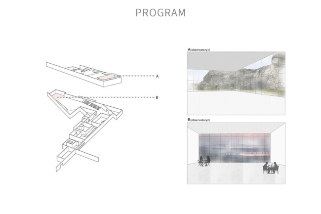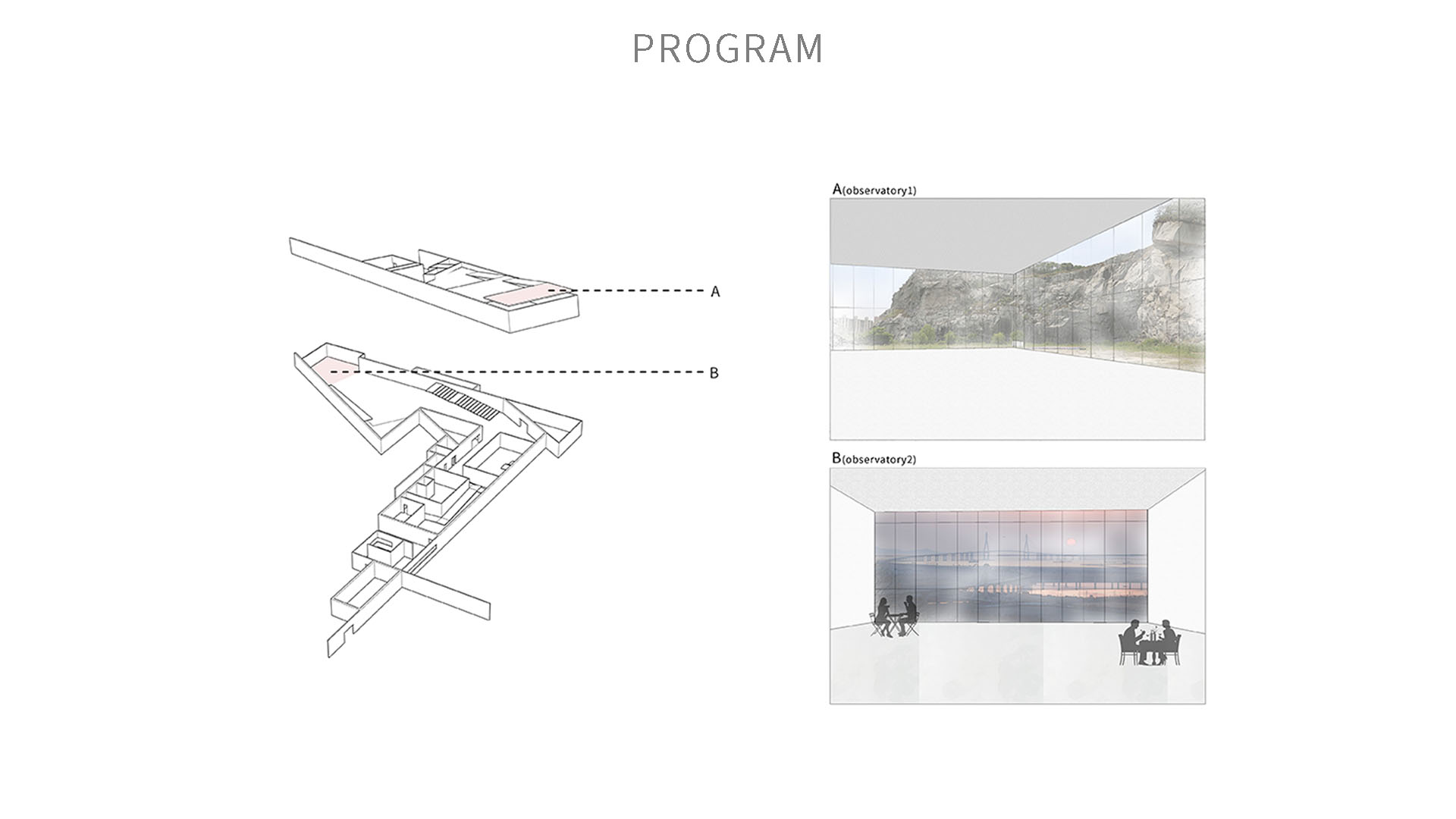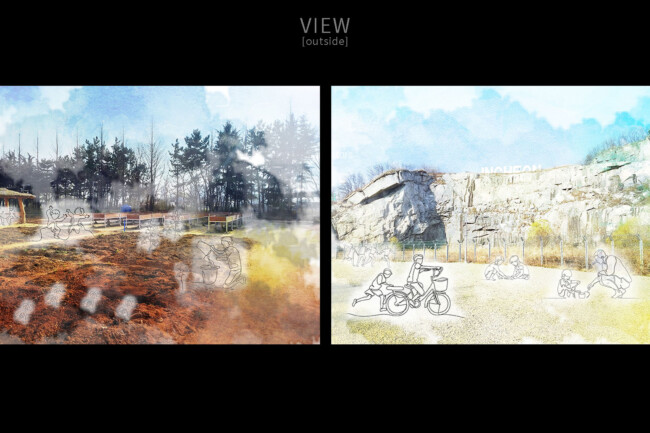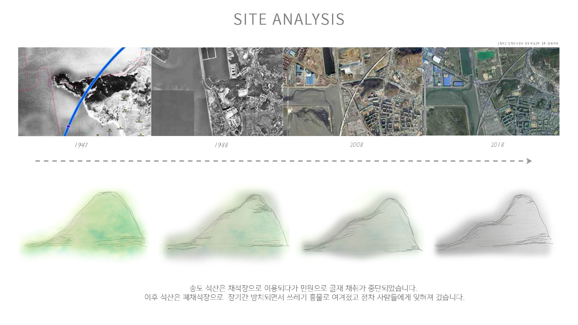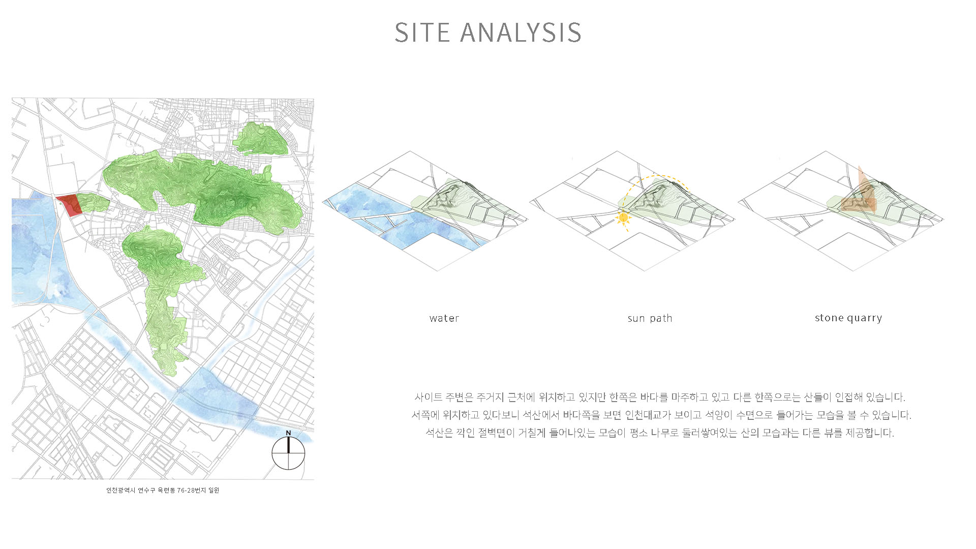 저는 화강암 채석장으로 쓰이다 버려진 석산을 사이트로 선정해 그공간의 가치를 다시 보여주고 싶었습니다. 그래서 주변요소중 평소 익숙해서 그냥 지나칠만한 자연적인 요소들을 석산과 함께 다시 보면서 산책할 수 있는 공간을 만들게 되었습니다.
