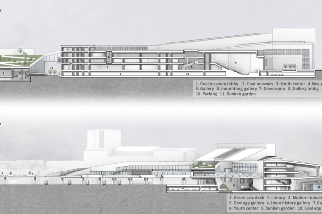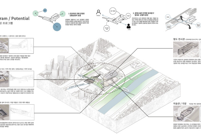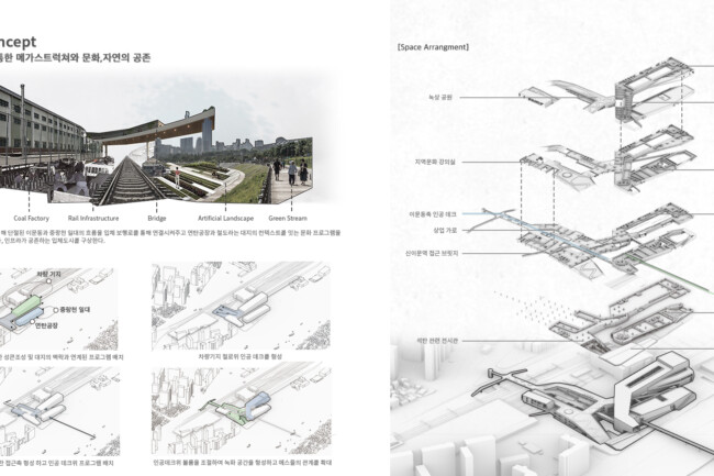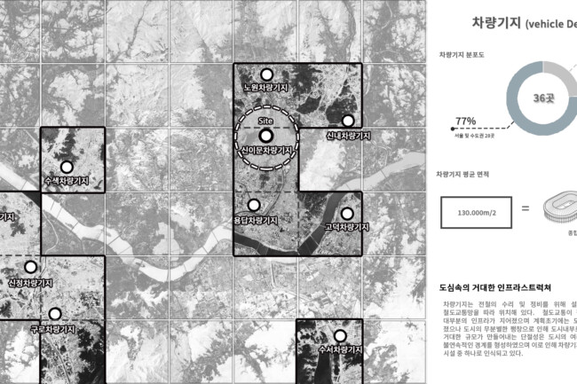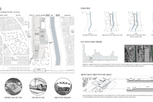본 사이트는 이문차량기지와 연탄공장부지에 위치해 있다. 석탄을 중심으로 한 과거 산업화시기에 중랑천을 따라 놓인 경원선을 중심으로 연탄공장들이 들어서기 시작했고 이문동 역시 수많은 연탄공장들이 들어섰다. 그러나 연탄산업의 사양화로 인해 서울의 연탄공장이 도시 외부로 빠져나가기 시작했고 이문동의 연탄공장은 서울에 위치한 마지막 연탄공장이 되었다. 연탄공장이 빠져나간 자리에는 차량기지 인프라가 자리 잡았으며 이들은 이문동에서 중랑천으로 이어지는 도시 맥락을 단절한 채로 부유하고 있다. 이전이 확정된 이문동 연탄공장과 지속적으로 언급되고 있는 중정비동 설비 이전 시나리오를 중심으로 입체도시구성을 통해 차량기지와 자연, 문화가 공존하는 복합문화공간을 제안한다.