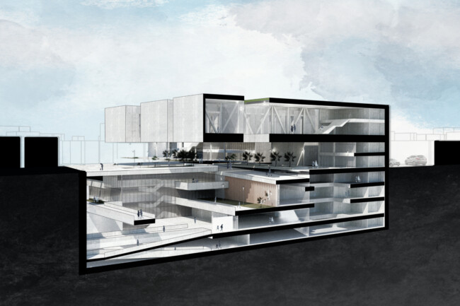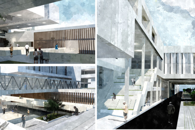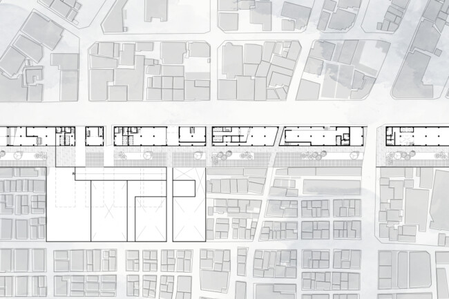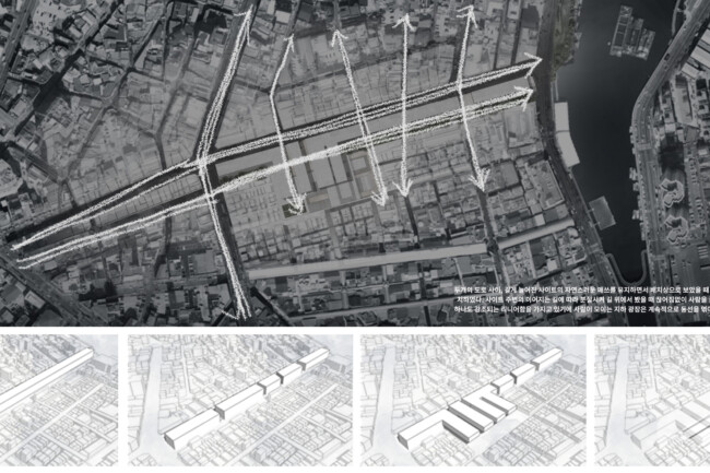 도시는 항상 많은 사람들을 이끌어들이기 위해 변화한다. 포항 또한 마찬가지이다. 철강 도시에서 시작된 포항은 인공운하, 전통시장, 청계천을 모방한 중앙상가, 구 포항역사를 이용한 공원등을 통해 관광도시로 나가가려 한다. 이렇게 많은 돈을 들여 모방하거나 확장된 랜드마크들은 특이하게도 옛 기찻길을 따라 길게 늘어서 있다. 마치 계획적으로 도시 위에 하나의 선을 그어둔 것처럼. 그러나 길 위로 들어선 나는 도시의 선을 하나도 읽을 수 없었다. 차가 달리는 도로 위 사람이 걸어다닐 곳이 없음은 결국 랜드 마크는 사람에 의해 만들어진다는 것을 간과한 것처럼 보인다. city line은 단순하다. 배치상으로만 보이는 도시의 선을 사람들의 시선으로 내려왔을 때도 보이게 해주는 것이다. 세운 상가가 공중 보행로를 추구했다면 city line은 사람들이 걸을 수 없는 도로를 길로 만들어 준다. 특이한 형태나 조형적인 미보다는 리니어한 사이트의 매력을 그대로 살려 담백한 매쓰를 추구한다. 일방향적인 매쓰의 강한 느낌을 계속해서 동선이 겹쳐지는 지하 광장과 연결함으로 더 강조하면서 균형을 잡아준다. 4차선 도로와 상업시설, 보행로와 야외무대를 가진 지하 공간의 연결로 단순히 보행로만의 역할을 넘어 사람들이 머물게 만든다.