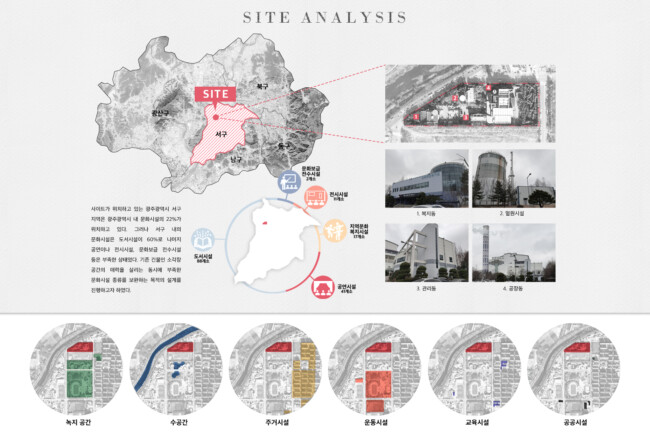 사이트인 광주광역시 서구에는 총 159개의 문화기반시설이 존재하고 있지만, 그 중 도서 시설이 88개소로 대부분을 차지하고 있었다. 그에 비해 상대적으로 공연전시시설과 문화보급전수시설은 부족한 상황이었다. 이를 보완할 수 있는 프로그램을 소각장 내에 추가하여 주민들에게 문화복지시설을 제공하는 방향으로 진행하였다.