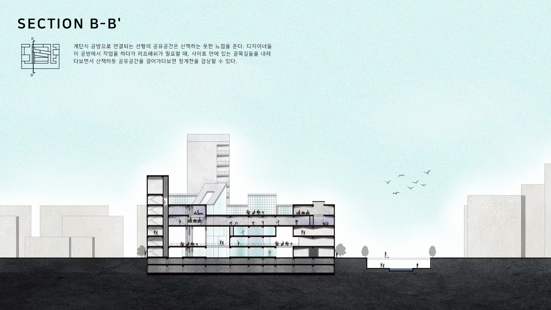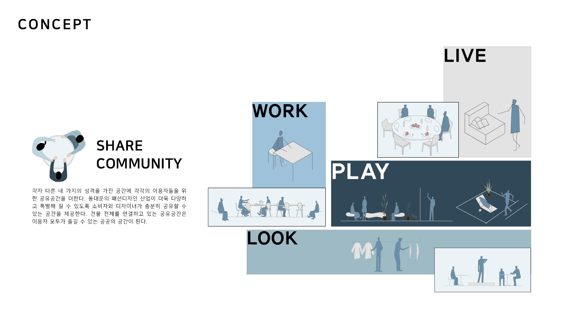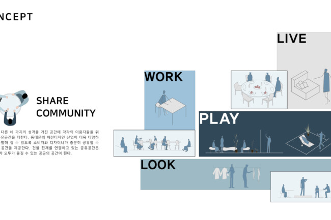 이 곳은 LOOK, LIVE, WORK, PLAY의 네 가지의 테마를 통해, 다양한 사람들이 모일 수 있는 공간을 제공한다. 이는 방문객들의 흥미를 끌 수 있는 소비공간, 디자이너들을 위한 주거공간, 디자이너 간의 활발한 소통을 위한 공유공방, 그리고 누구나 방문할 수 있는 공공의 놀이공간으로 이루어진다.