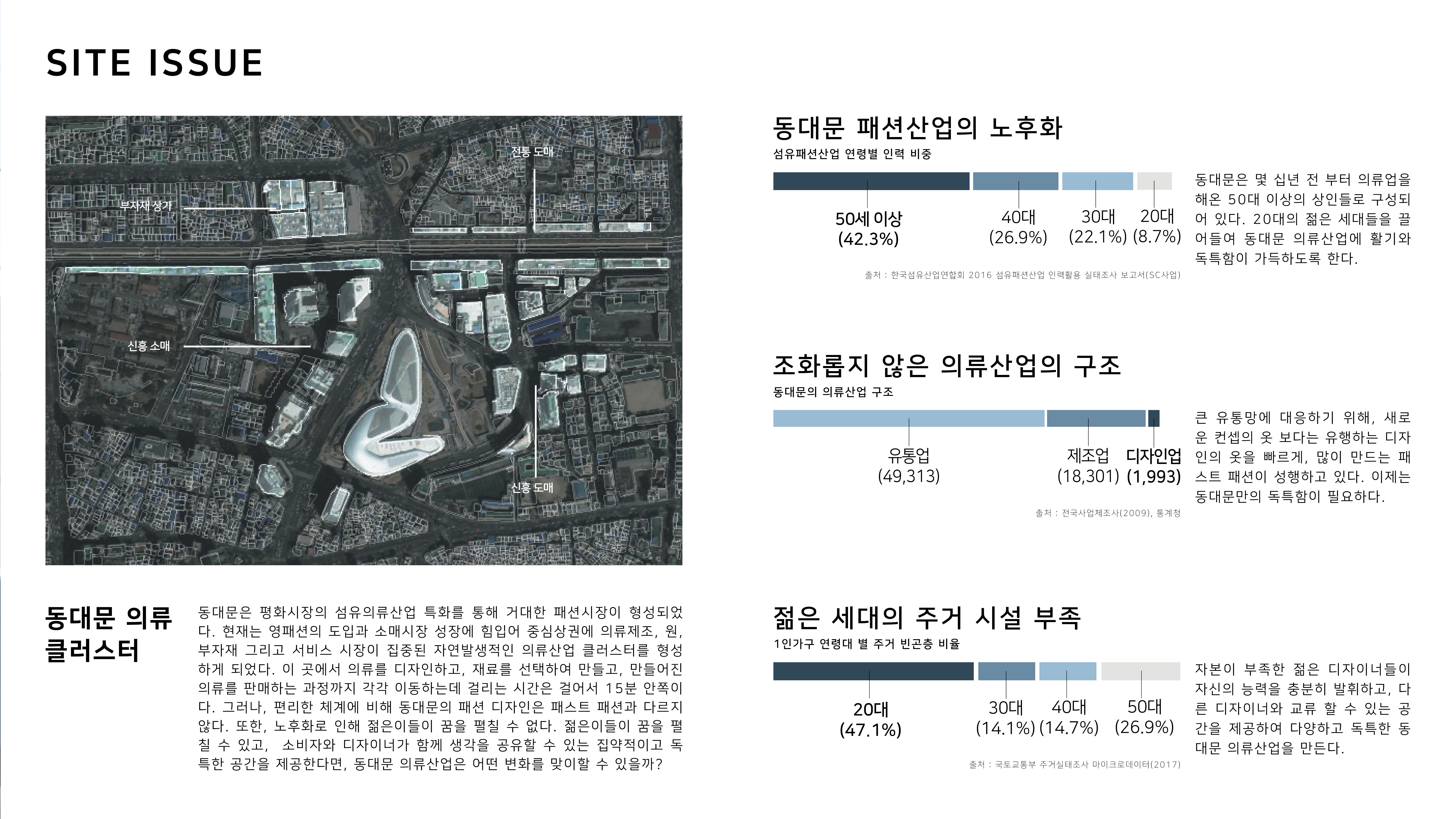 동대문은 우리나라의 대표적인 패션관광특구이다. 그러나, 특색있는 디자인의 패션보다는 패스트 패션이 동대문의 의류산업을 구성하고 있어 기대를 가지고 방문한 소비자들에게 실망감을 안겨주었다. 또한, 동대문은 노후화로 인해 희망을 가지고 패션산업에 뛰어든 젊은이들의 활기를 앗아간다는 문제점을 가지고 있었다.