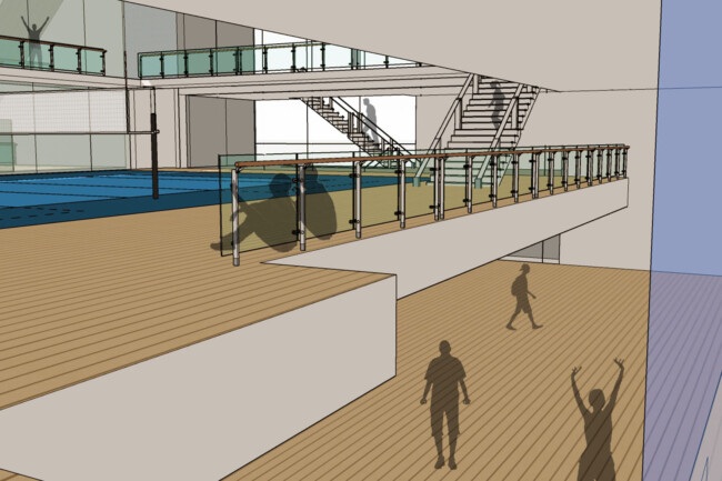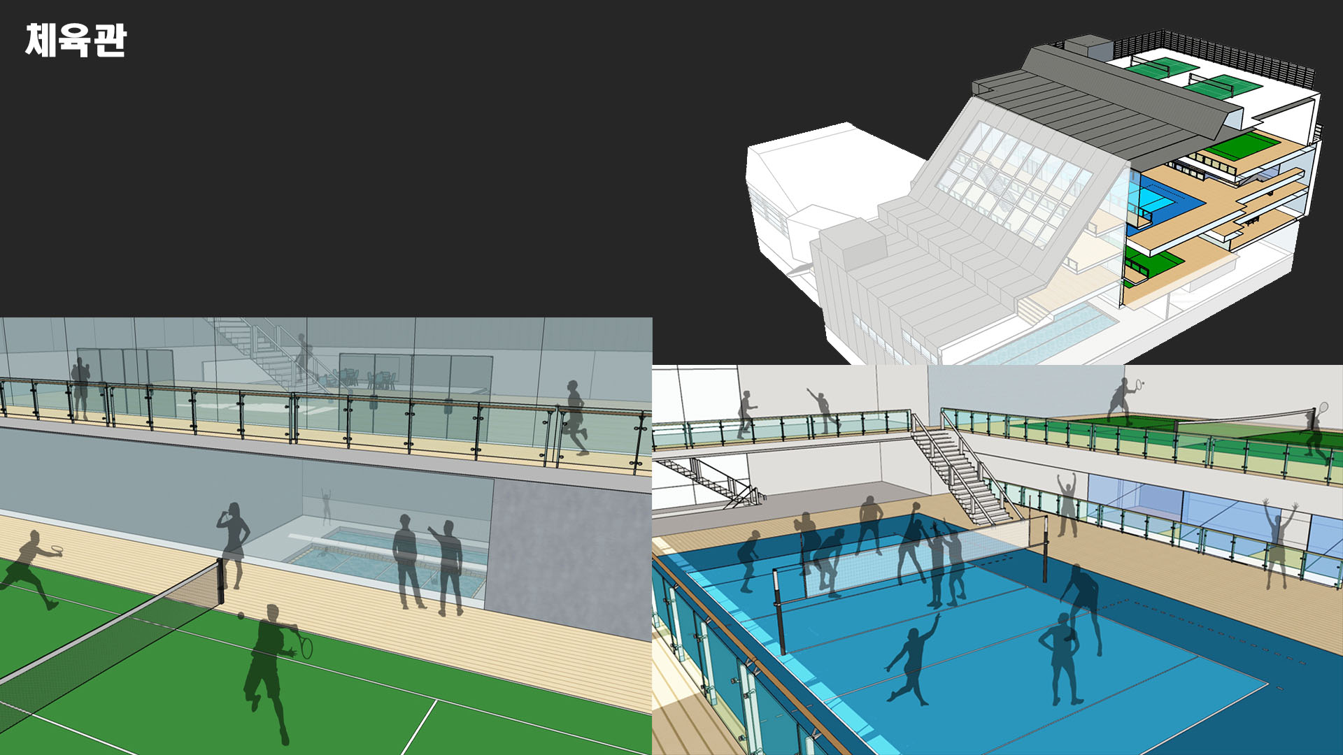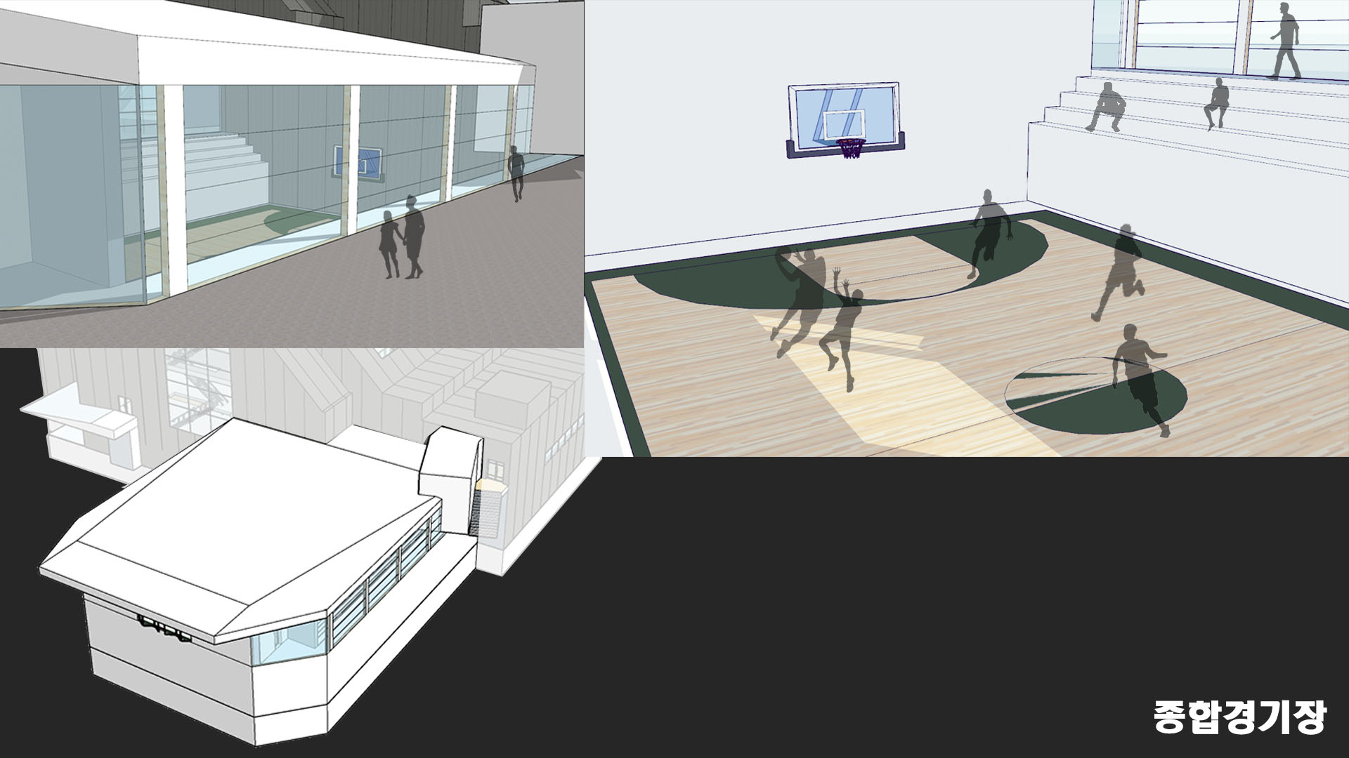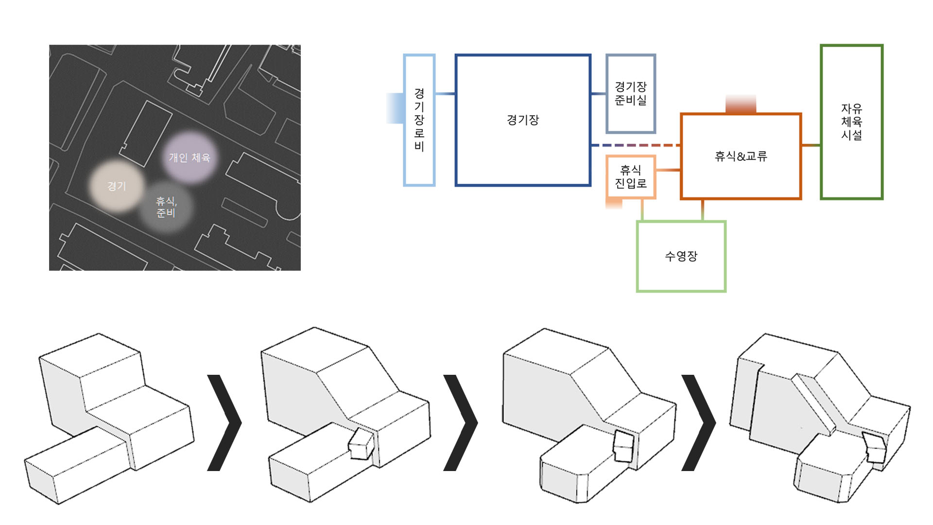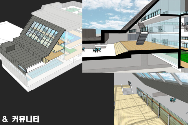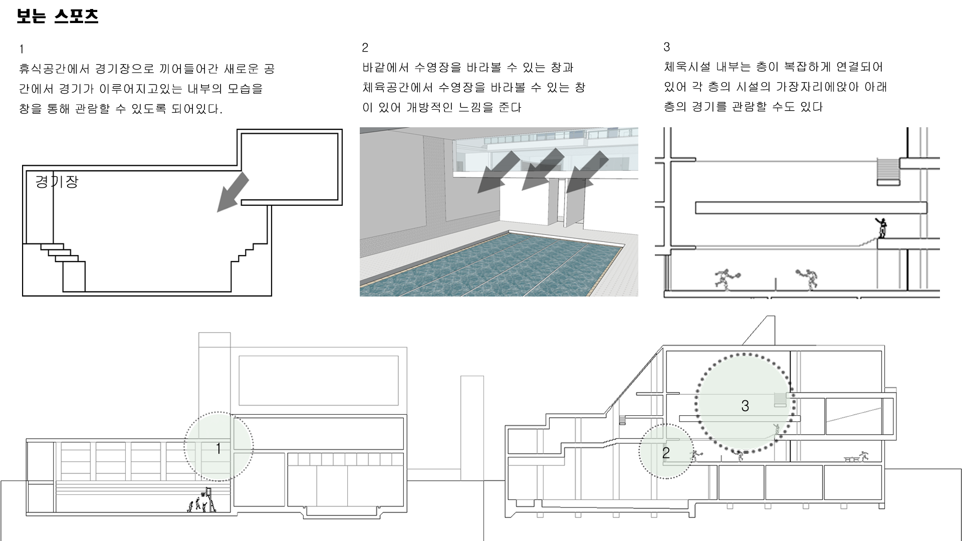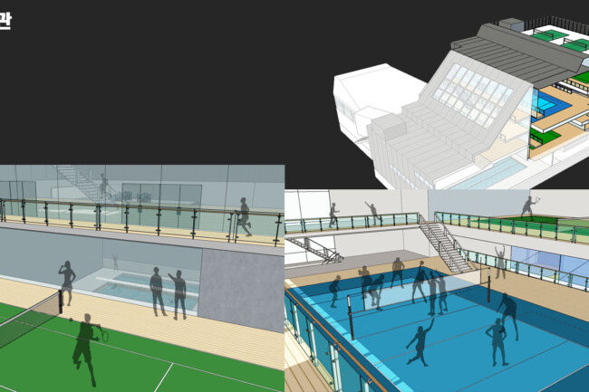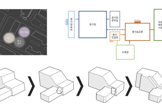 체육 경기를 진행하는 것 뿐만 아니라 많은 사람들이 다양한 체육활동을 즐길 수 있는 공간을 만드는 것을 목표로 삼았다. 또한 직접 참여하는 사람뿐만 아니라 다음 순서를 위해 기다리는 사람들, 참여 후에 휴식을 하는 사람, 그리고 단순히 관람을 하는 사람들까지 모두 가까이에서 시각적인 체험을 할 수 있는 공간이 필요하다고 판단했다.