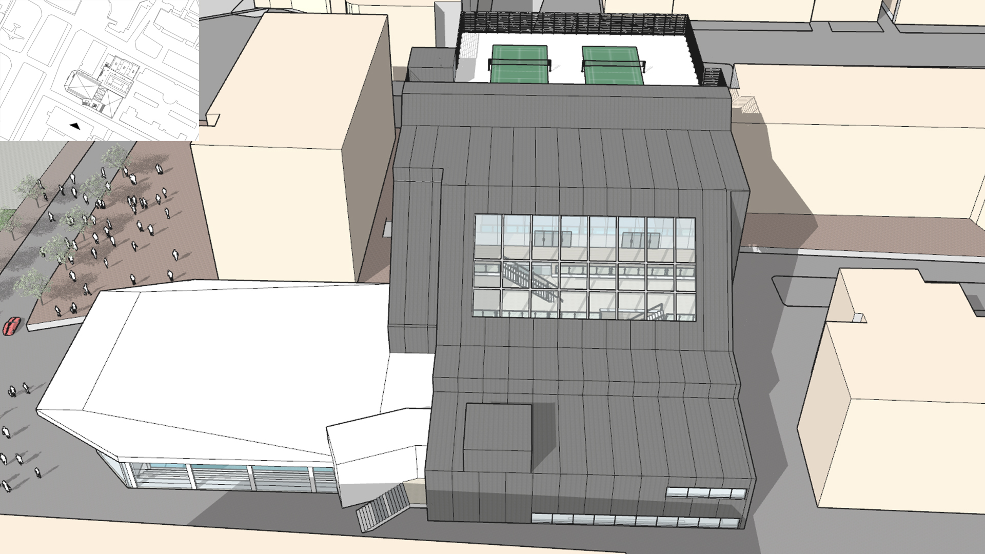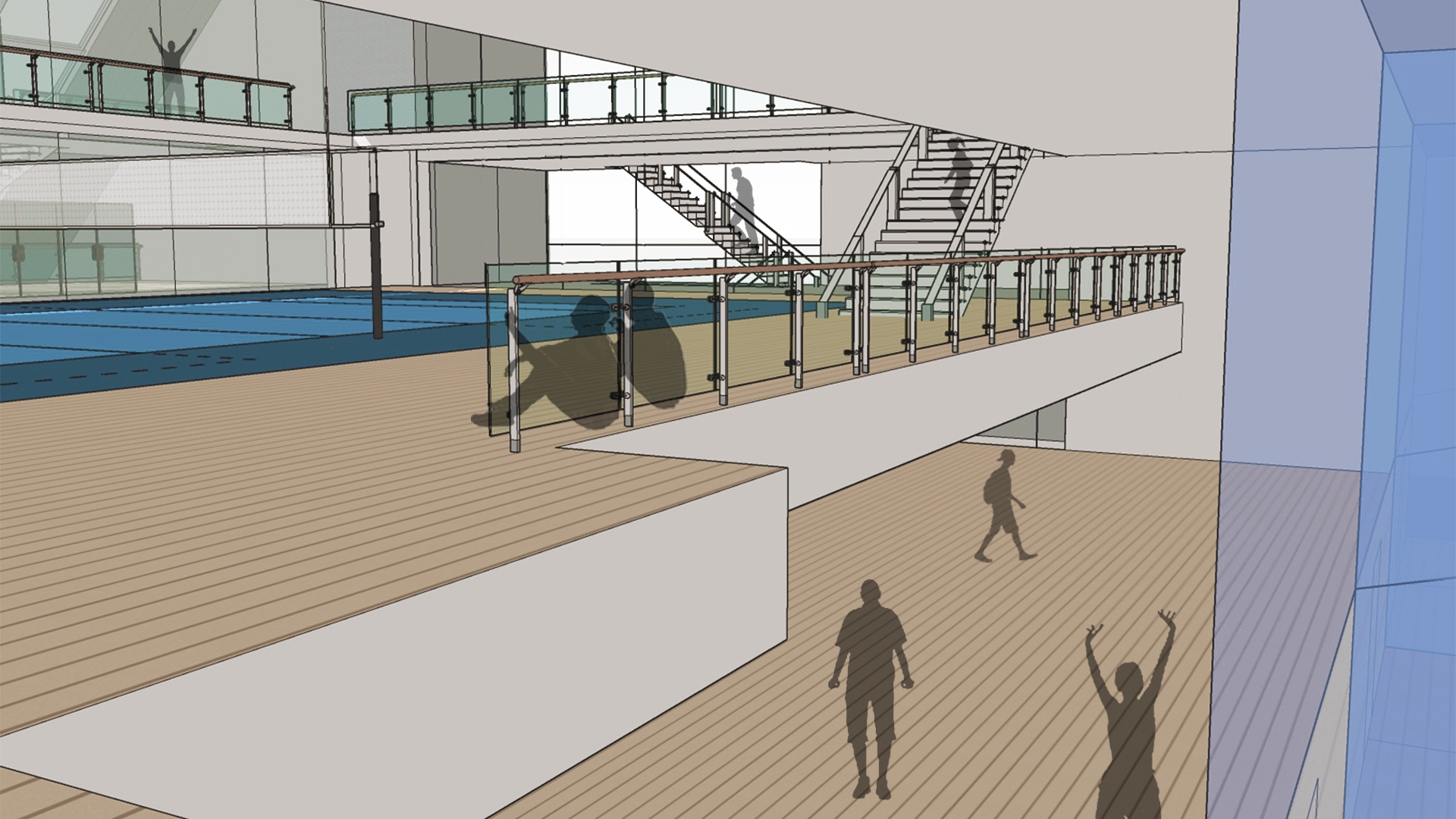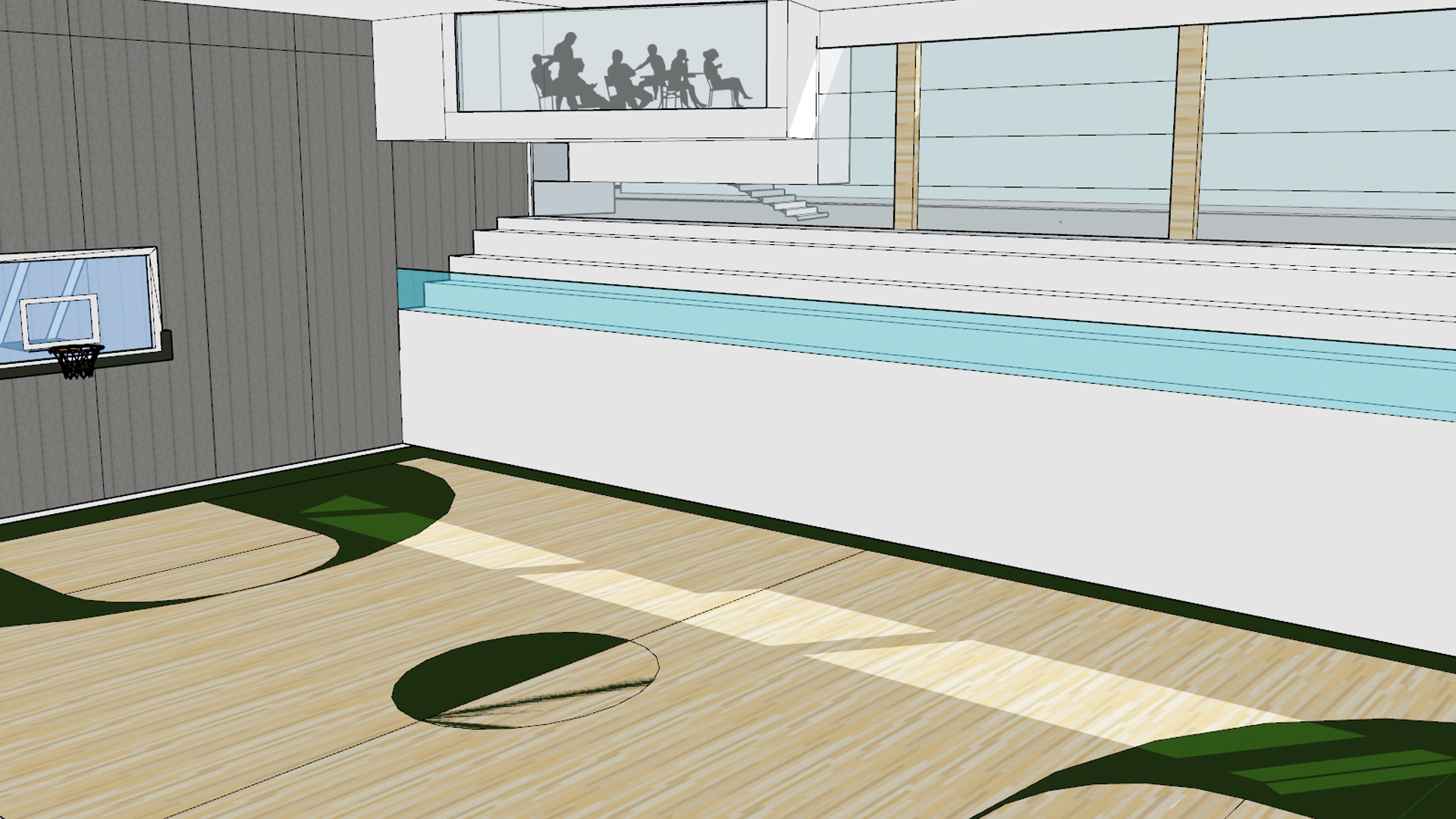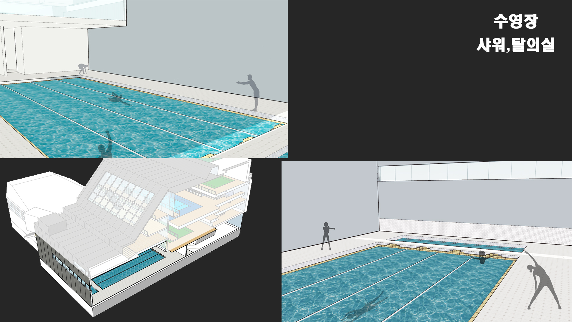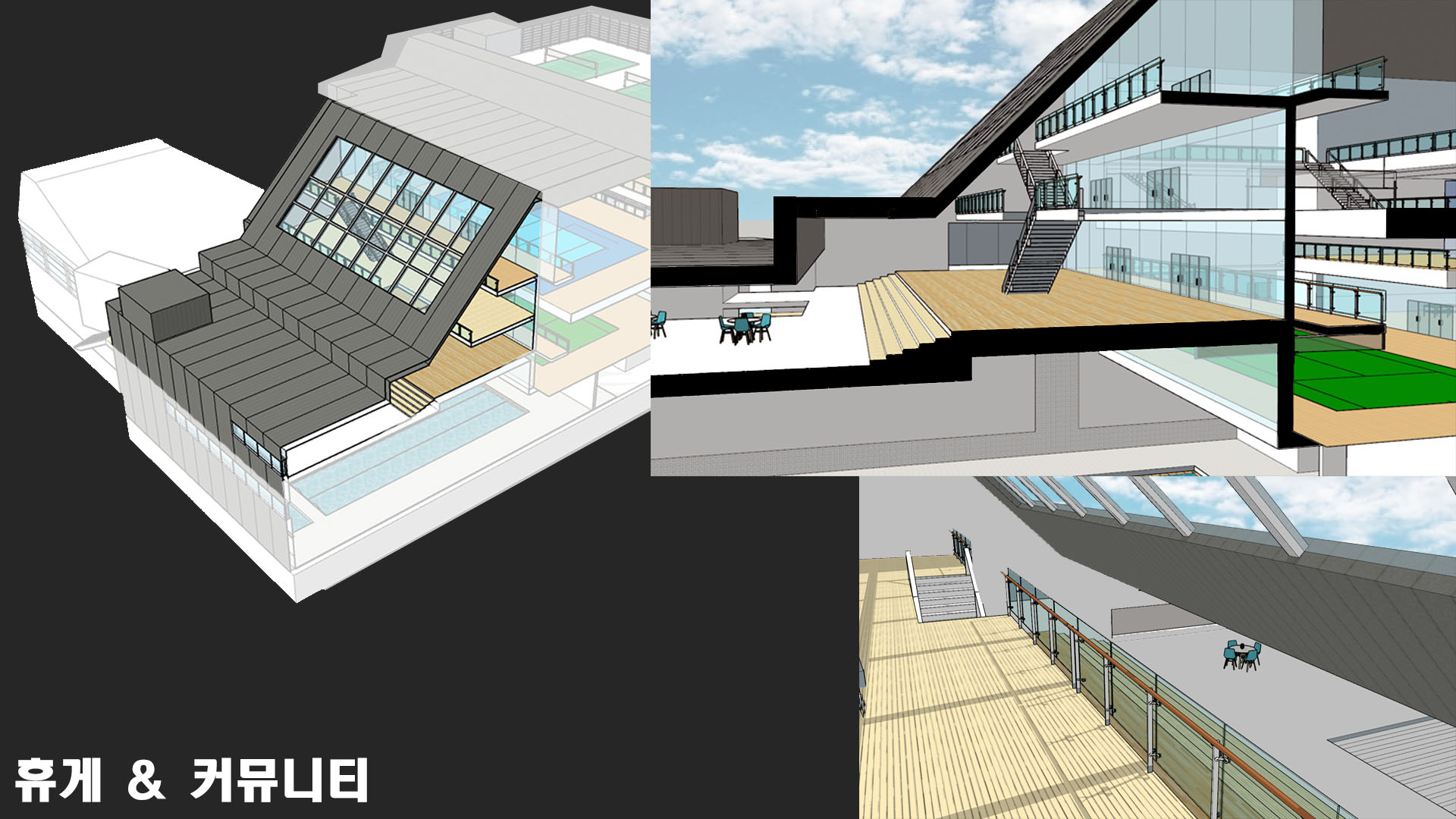 체육 경기를 진행하는 것 뿐만 아니라 많은 사람들이 다양한 체육활동을 즐길 수 있는 공간을 만드는 것을 목표로 삼았다. 또한 직접 참여하는 사람뿐만 아니라 다음 순서를 위해 기다리는 사람들, 참여 후에 휴식을 하는 사람, 그리고 단순히 관람을 하는 사람들까지 모두 가까이에서 시각적인 체험을 할 수 있는 공간이 필요하다고 판단했다.
