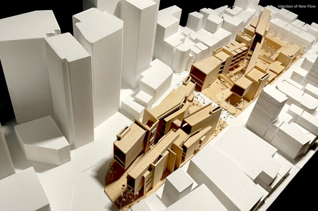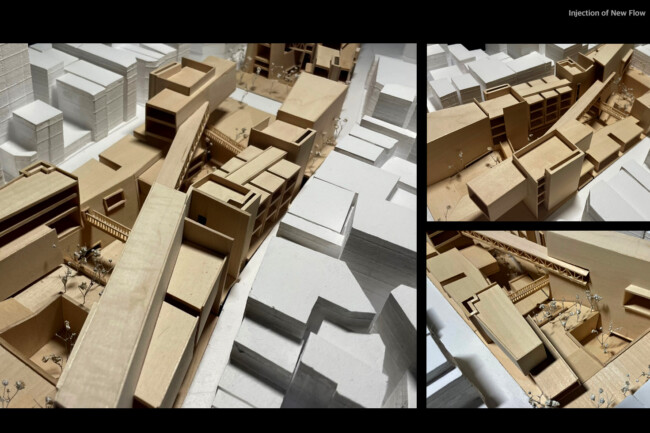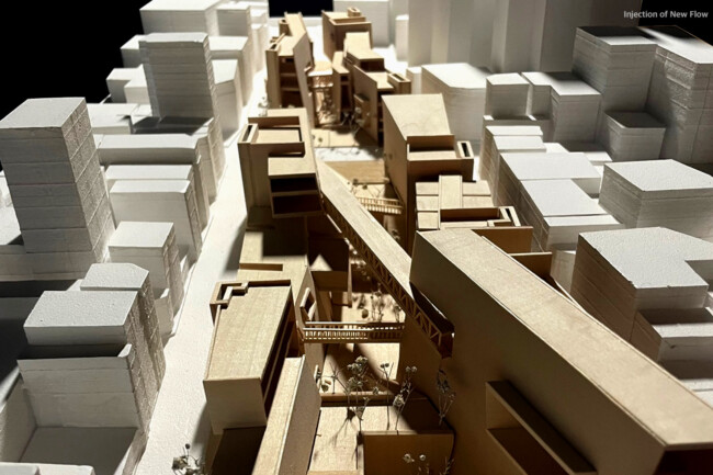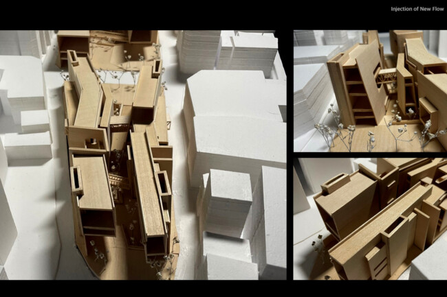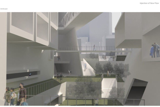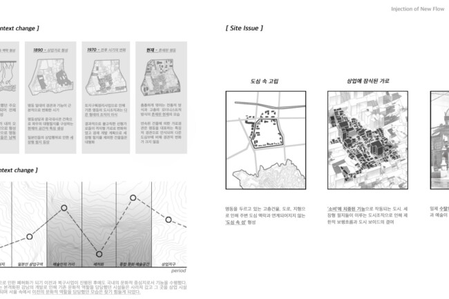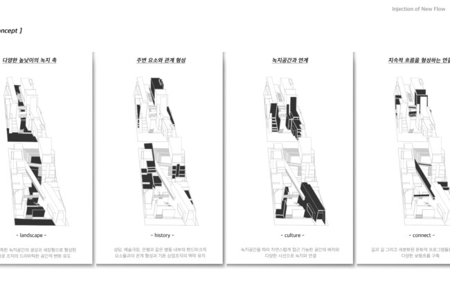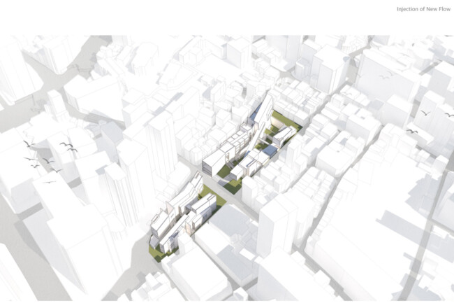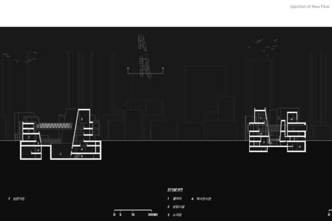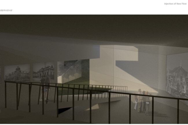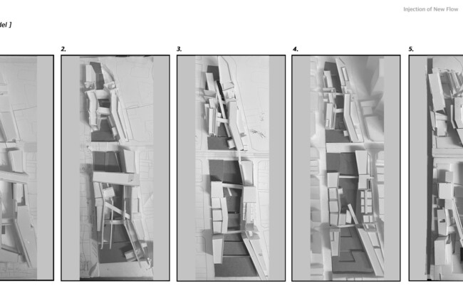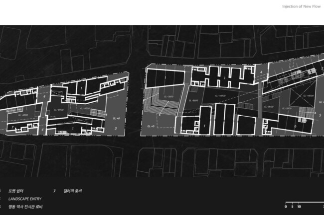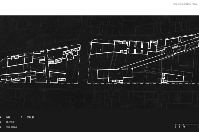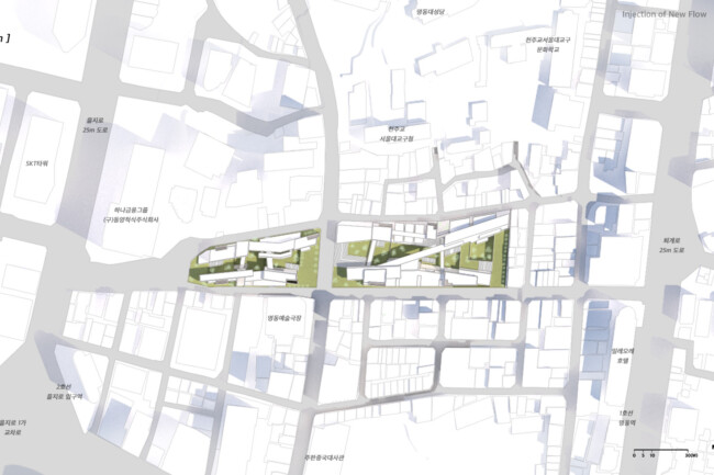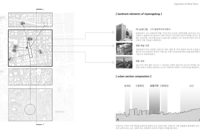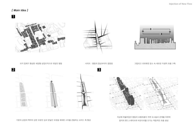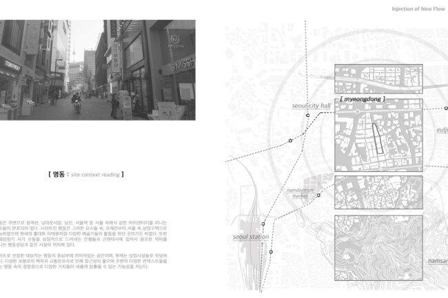 이처럼 일제가 형성하고 현재까지 존재하는 고착화된 세장형의 상업조직을 부정적인 관점으로 바라보고 그곳에 새로운 흐름을 주입시킴을 통해 기존의 공간 속 변화를 만들며 개선시키고자 한다. 기존의 명동이 지니고 있던 보행 가로 조직을 역동적이고 대비적으로 변화시키며 그렇게 변화시킨 공간은 명동 내부의 컨텍스트들과 새로운 관계성을 구축하고 이를 통해 밀도 높은 상업 레이어로 덮혀 있던 공간은 다양한 가치들이 창출될 수 있는 공간이 될 것이다. 또한 상업의 기능만 지니고 있던 공간에 주입한 공적 영역은 다양한 흐름들을 생성하고 수용하고 재분배하여 명동이라는 도시를 변화시킬 수 있는 단초가 될 것이다.