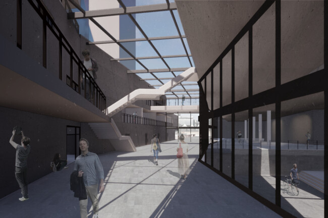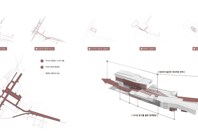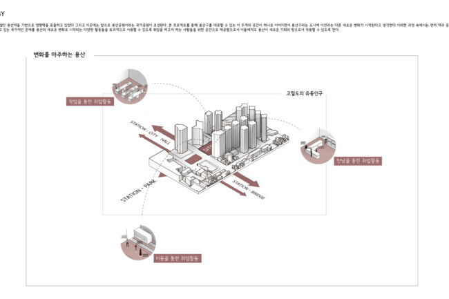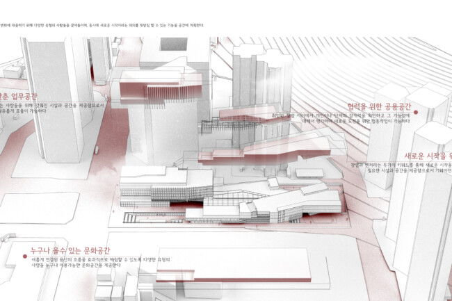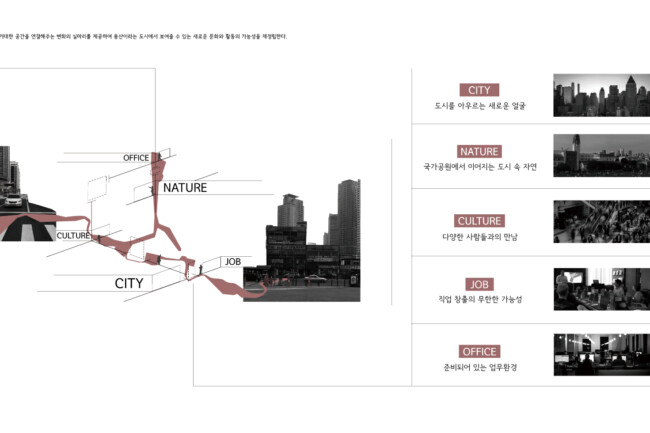 이러한 조건을 고려했을 때 두개의 인프라 사이에 위치하고 있지만 정해진 활용계획도 없이 방치되어 있었던 대상지에서 앞으로 변화하게 될 도시의 모습을 도울 수 있는 변화의 실마리와 같은 역할의 공간을 계획함으로써 동일한 위계를 기반으로 두개의 인프라를 연결하여 변화하는 도시에 가장 필요한 공간을 제안한다. 먼저 두개의 거대한 인프라시설을 연결할 수 있도록 길의 역할을 수행하는 건축적 동선을 마련하고, 이것을 기반으로 저층부에서는 도시를 구성하고 있는 사람들의 접근을 유도하는 문화공간을 제안한다 도시 구성원들의 적극적인 이용은 자연스럽게 인프라들간의 연계를 만들어내고 더 이상 그 둘을 구분 짓지 않도록 만든다 그리고 국가적으로 끊임없이 문제가 되고 있는 취업이라는 문제에 대해 이를 돕는 실용적인 프로그램들을 상층부에 제공하여 도시의 변화에 대응하는 새로운 시작이라는 의의와 더불어 갈 수 있는 공간으로서 당위성을 강하게 만들어 내고자 한다.