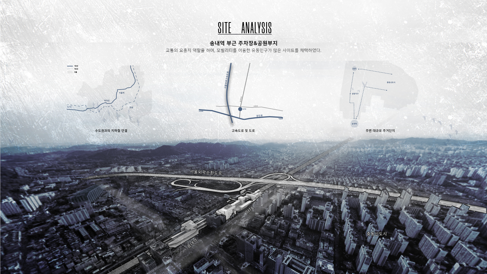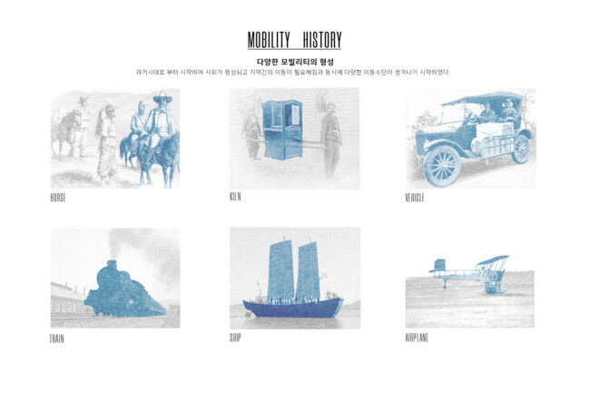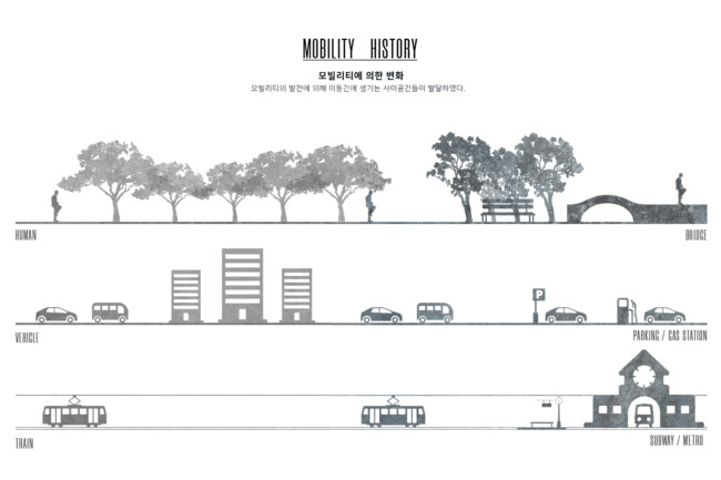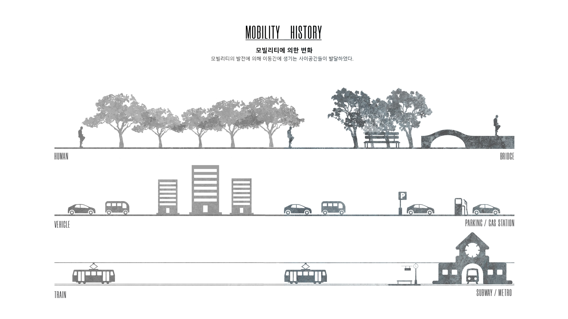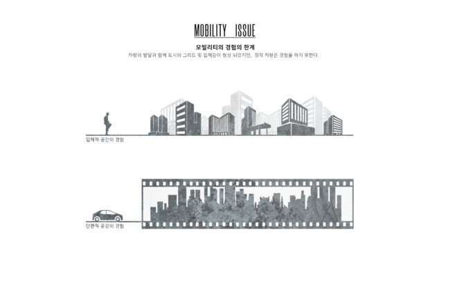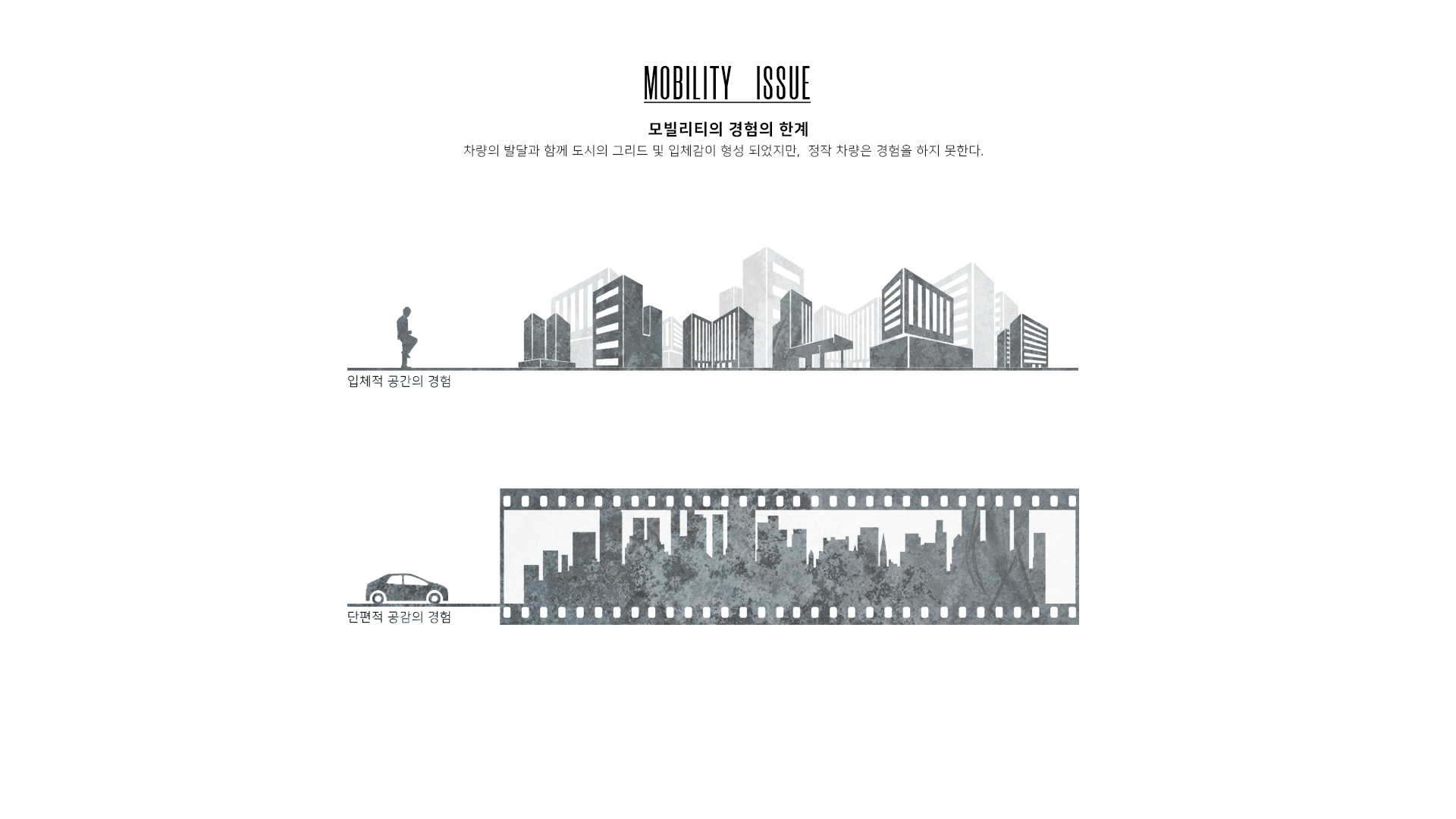 사회체계가 구축됨에 따라 거리간의 이동이 불가피해졌고, 그로 인해 다양한 이동수단들이 나타나게 되었다. 또한 다양한 이동수단 즉, 모빌리티들의 사용량이 지속적으로 증가함에 따라 그 중요성이 높아지기 시작하였다. 그 예시로 지역간의 거리가 가까워져 전세계적인 이동이 가능하게 되었고, 또한 도시간의 그리드가 형성되고 공간이 입체적으로 변하게 되었으며 동시에 사람들의 생활에 영향을 미치게 되었다. 하지만 정작 인도와 차도가 분리로 인하여 모빌리티 속에서는 도시의 입체적인 공간감을 경험할 수 없게 되었다. 따라서 입체적 공간감을 모빌리티를 통해서도 경험할 수 있게 해줘야 한다.