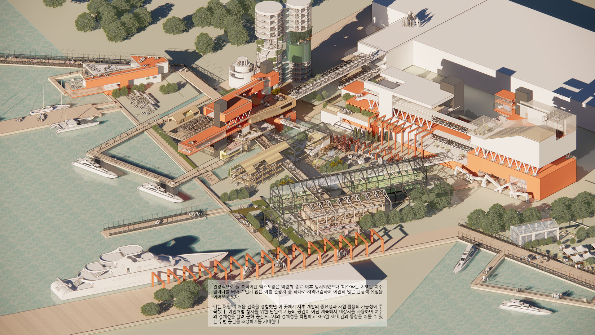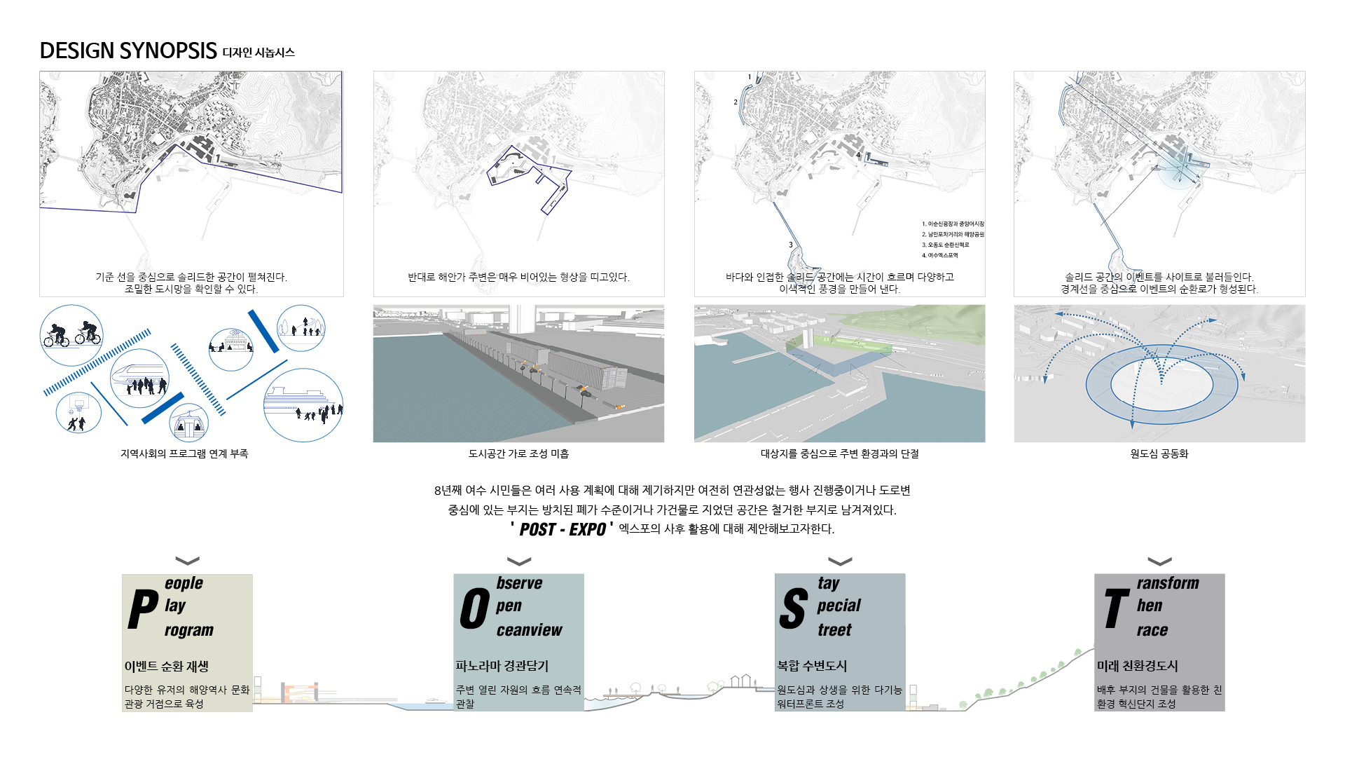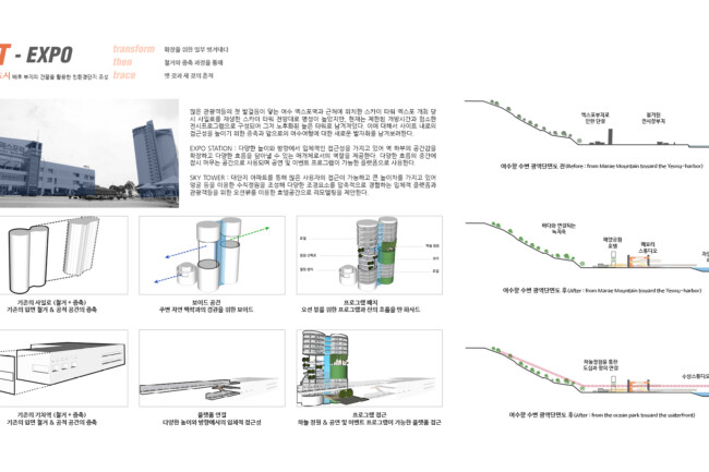나는 어릴 적 처음 건축을 경험했던 이 곳에서 사후 개발의 중요성과 자원 활용의 가능성에 주목했다. 이전처럼 행사를 위한 일회성 공간이 아닌 계속해서 대상지를 사용하며 여수의 정체성을 살려 문화 공간으로서의 정체성을 확립하고 365일 세대 간의 통합을 이룰 수 있는 수변 공간을 조성하기를 기대한다.