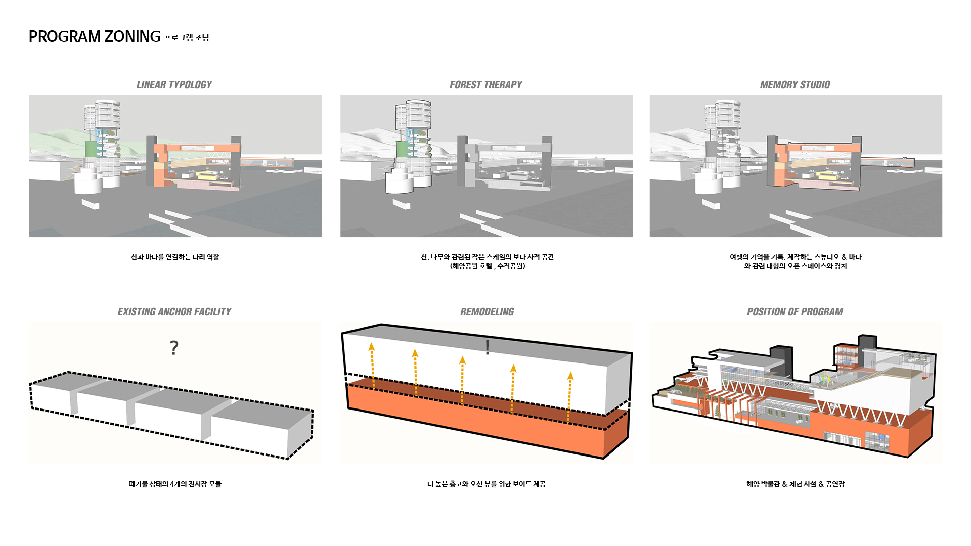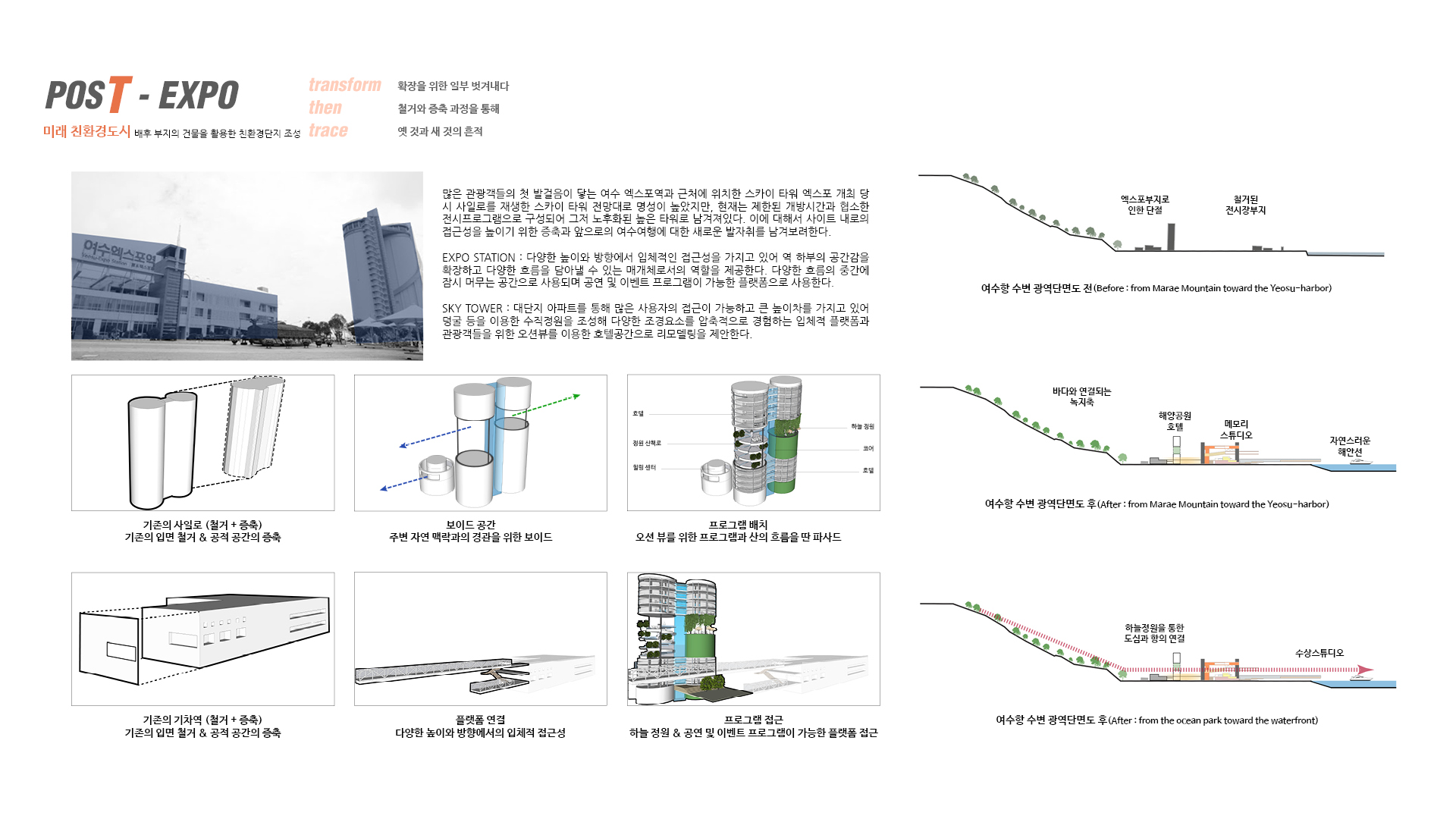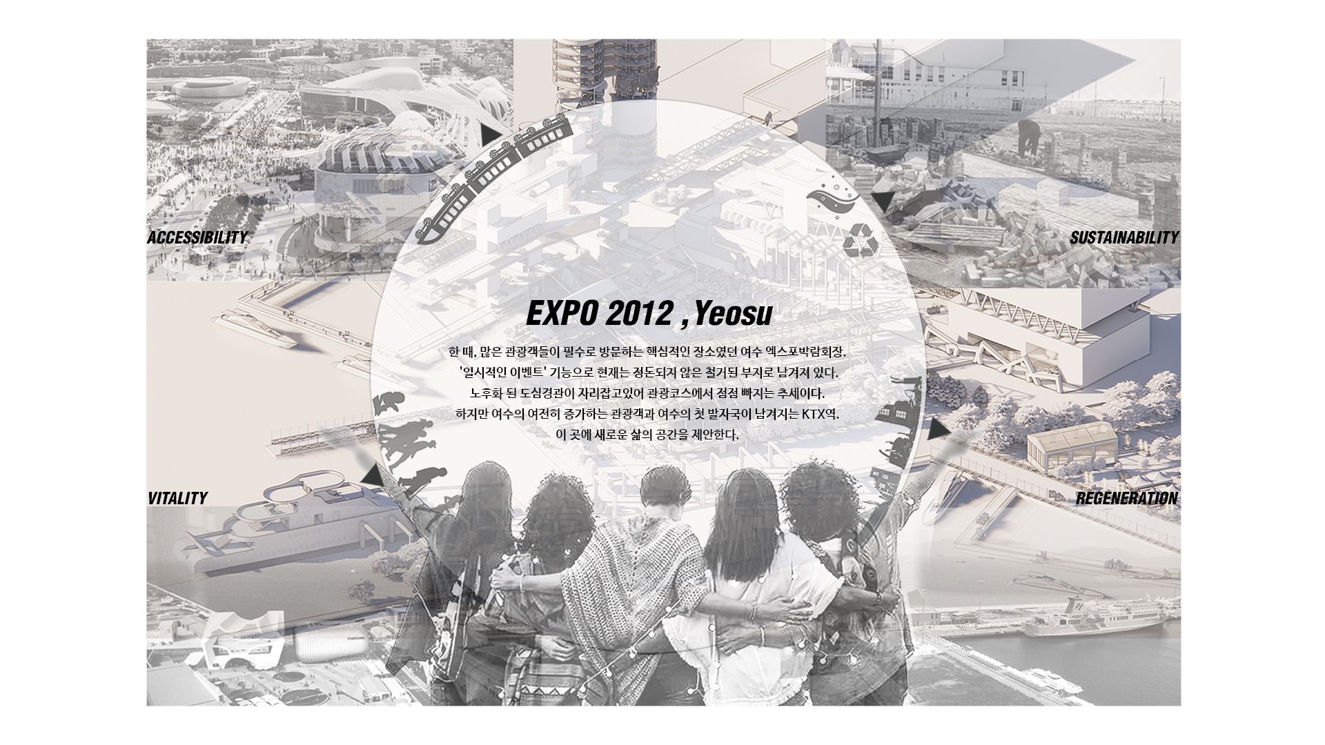 나는 어릴 적 처음 건축을 경험했던 이 곳에서 사후 개발의 중요성과 자원 활용의 가능성에 주목했다. 이전처럼 행사를 위한 일회성 공간이 아닌 계속해서 대상지를 사용하며 여수의 정체성을 살려 문화 공간으로서의 정체성을 확립하고 365일 세대 간의 통합을 이룰 수 있는 수변 공간을 조성하기를 기대한다.