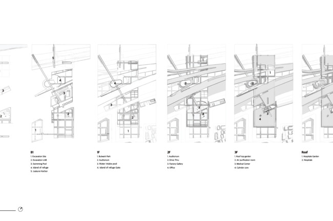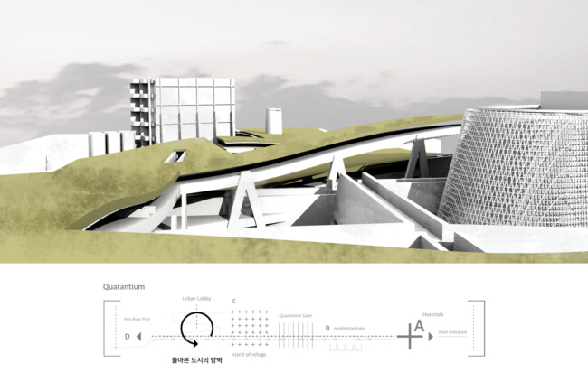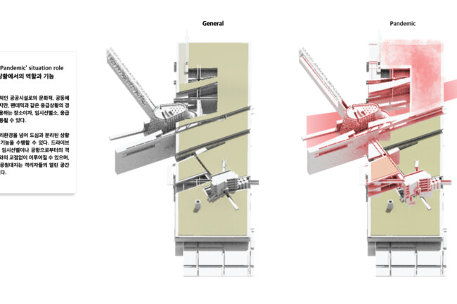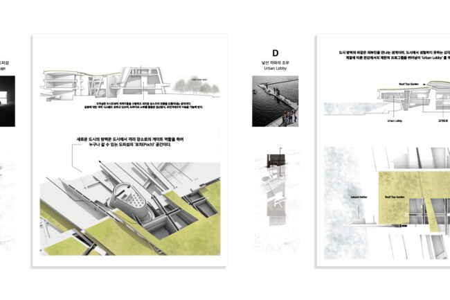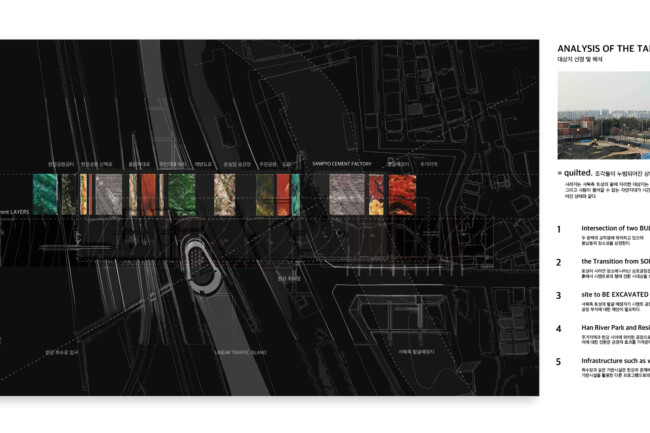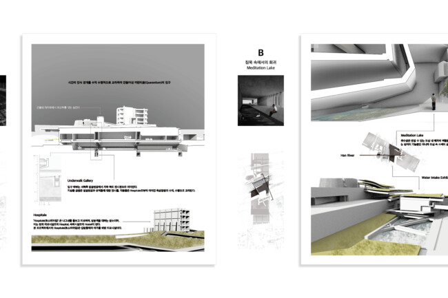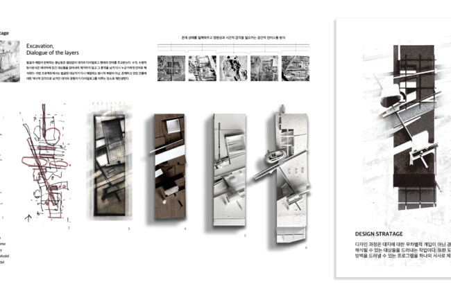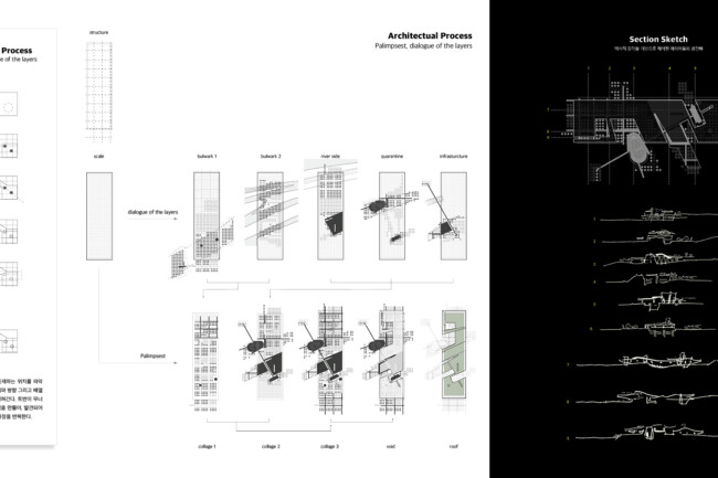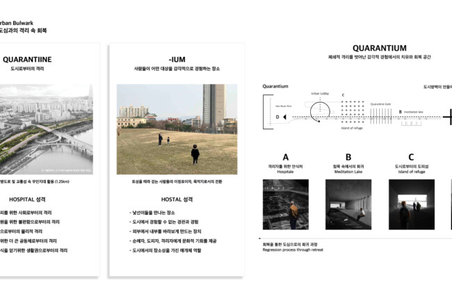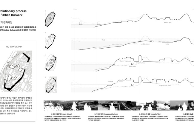 도시의 방벽(Bulwark)은 고대사회부터 현대까지 그 형태와 기능을 달리하며 존재해왔다. 프로젝트는 풍납동에 있는 풍납토성과 제방 도로를 `도시에서의 방벽(Urban Bulwark)`으로 해석하는 것으로부터 시작된다. 외세의 침략으로부터 방어의 수단이었던 고대 백제의 토성은 백제 도시의 멸망과 함께 사라졌다. 한강의 홍수로부터의 침식을 막기 위한 올림픽대로는 제방 도로가 되어 근대 도시를 부활시켰다. 시대 속 방벽은 토성과 제방 도로처럼 도시가 요구하는 바에 의해 생성되었지만, 원시적 기능에 집중된 방벽은 변화될 필요에 따라 소멸하거나 흔적만을 남겼다. 결국 경계로만 인식되어온 과거 방벽의 흔적들은 풍남동 도심 내에 구석구석 `무인지대(No man`s land)`를 만들어냈다. 고대 백제 토성의 자리는 유적발굴 대상지로 지정되며 이미 생성된 도심을 파편화시켰고, 근대 도시의 제방 도로는 풍납동을 3면이 폐쇄된 도시로 만들었다. 프로젝트는 경계부에 대한 새로운 해석 없이 내부 프로그램의 원시적 치환만을 반복하는 풍납동 경계부에 도시 방벽으로의 공간(space)을 제안한다. 도시는 현재 새로운 방벽을 요구받고 있다. 도시로부터의 격리는 더는 질병으로부터의 격리는, 도피성으로의 치유 공간을 제공한다. 문화와 여가, 회복의 공간이며 필요시 물리적 격리의 공간이 되어야 한다. 세 가지 도시 방벽은 팔렌프세스트 이론을 적용한 `발굴`을 통해 그 존재를 드러내고 공간화된 장소에서 연결된다.