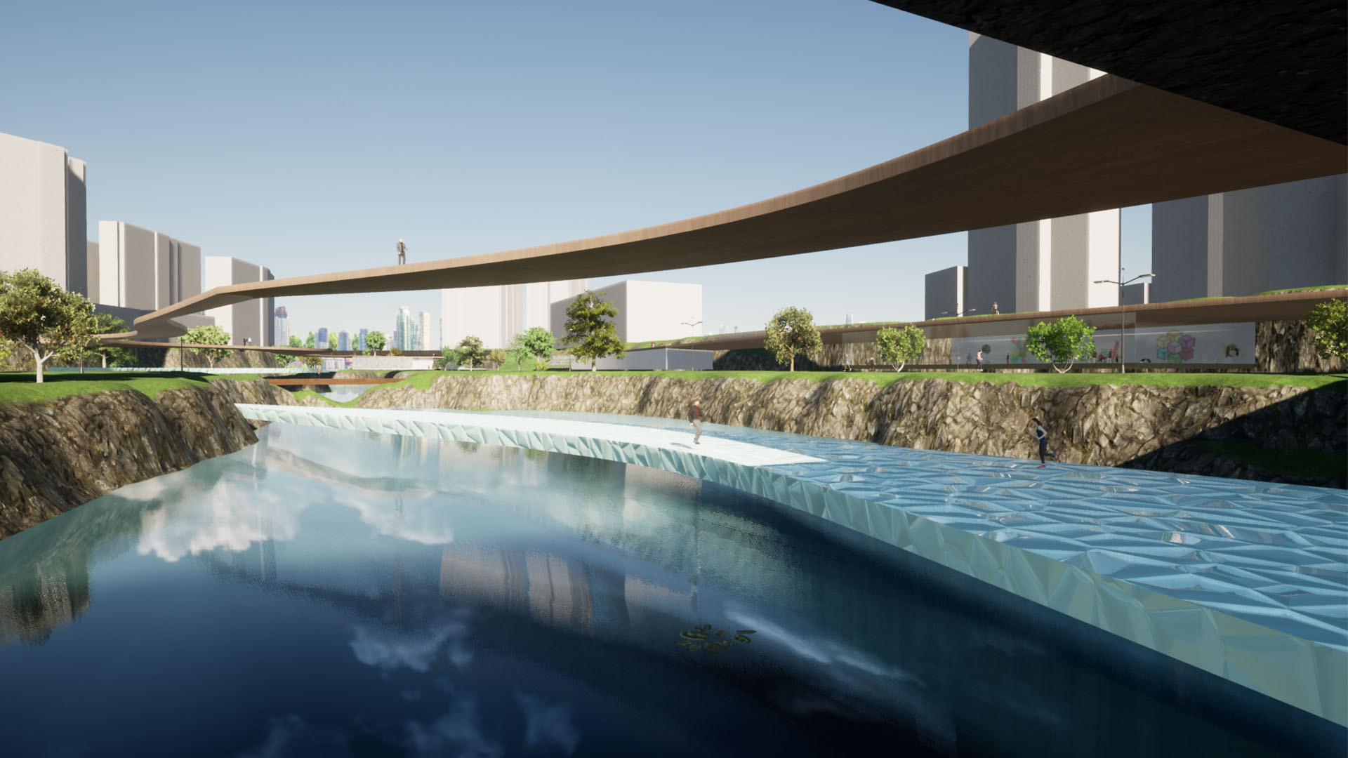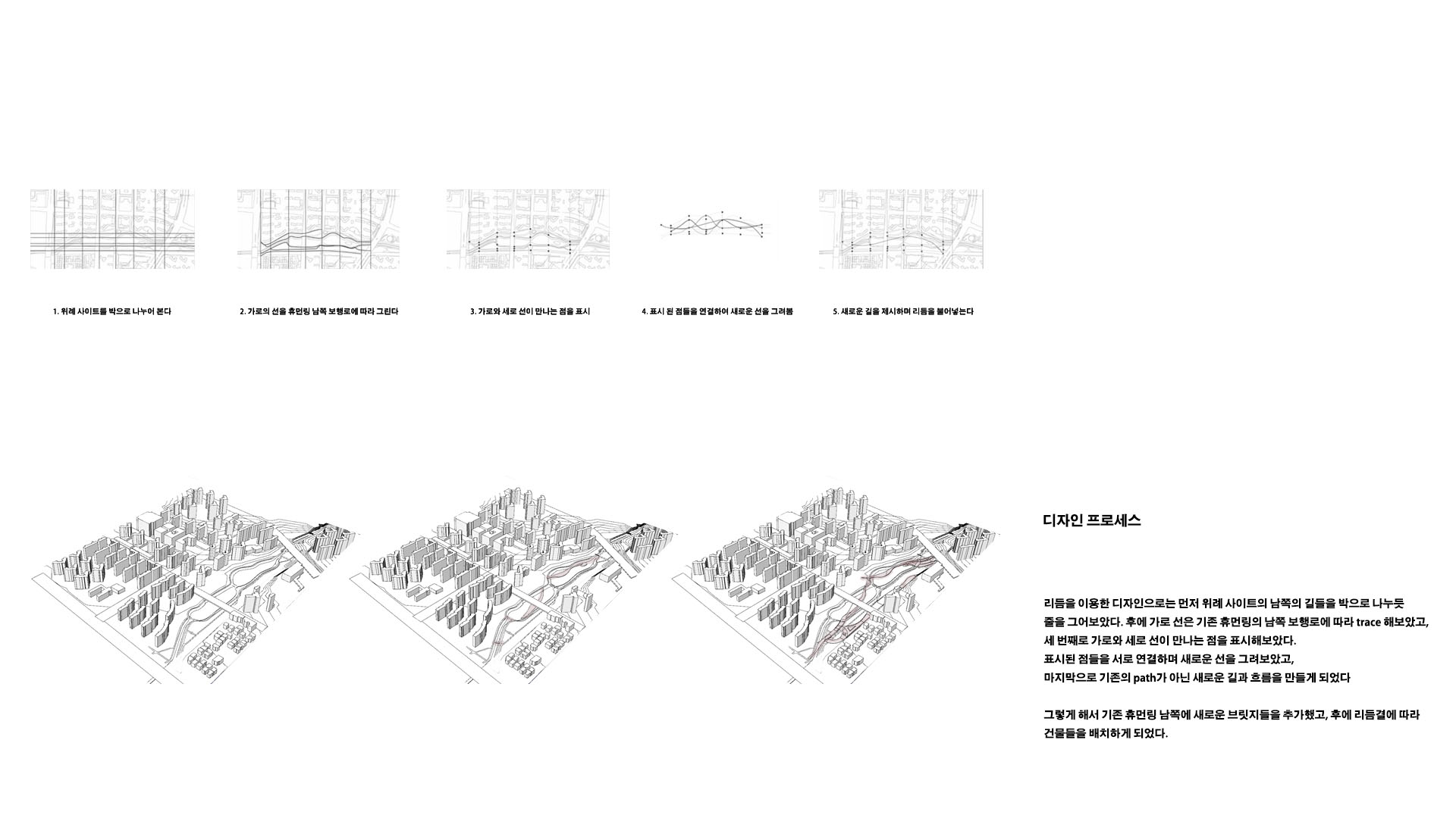 사람들이 휴먼링에서 걷거나 뛰는 수많은 액션들은 서로 스피드가 다르며, 그들은 서로 다른 박을 갖는다. 수많은 박이 모여 박자가 되고, 그 박자가 특별한 강세를 가져 리듬이 완성되듯 휴먼링에 새로운 리듬을 더해주어 더욱 재밌는 path로 변화시키고자 했다. 또한 기존에 존재하던 길에서 새로운 길인 브릿지들을 더하며 더욱 더 variety한 path가 되길 바랐다. 그러기 위해 휴먼링 남쪽에 있는 기존의 길들을 박으로 나누어 선을 그려 보고, 가로와 세로 선이 만나는 점들을 표시하여 또다른 새로운 길을 만들어냈다.