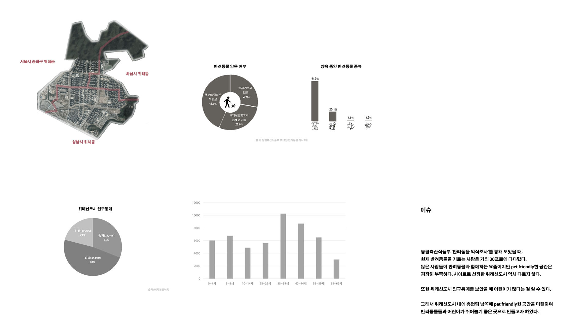 많은 사람들이 반려동물과 함께하는 요즘이지만 pet friendly한 시설은 한없이 부족하다. 사이트로 선정한 위례신도시 내에 휴먼링 남쪽에 pet friendly한 공간을 주어 반려동물들과 어린이가 뛰어놀기 좋고 다양한 세대를 아우르는 위례신도시를 만드는 게 목표이다.