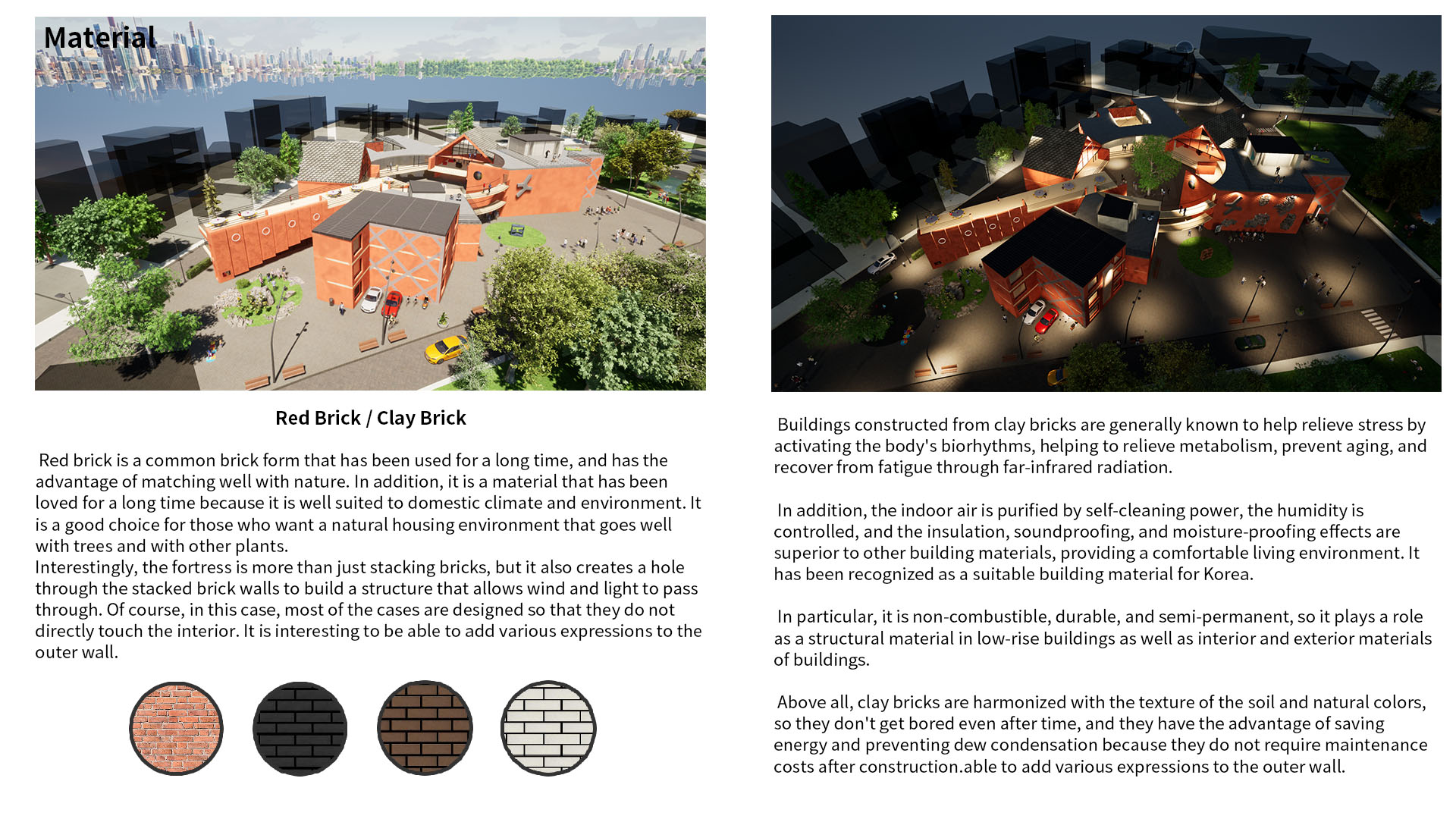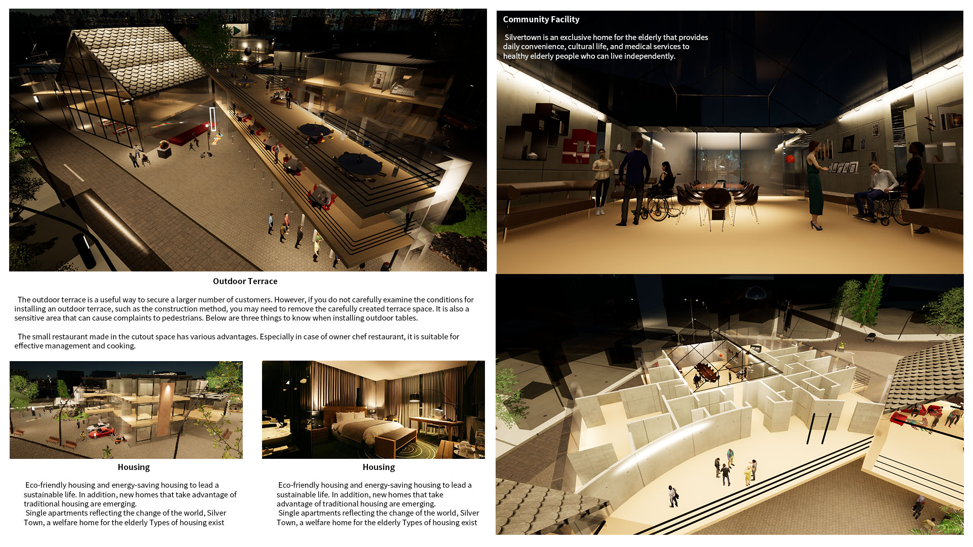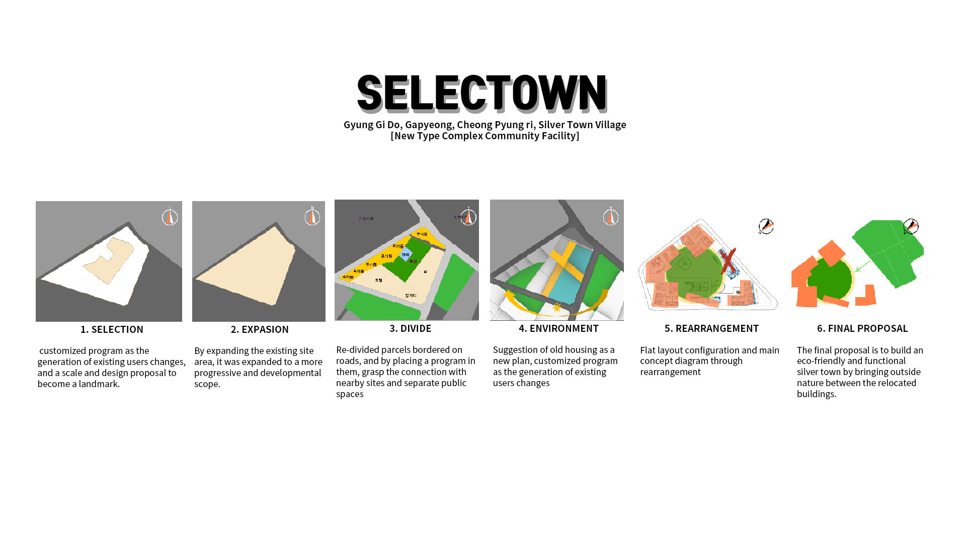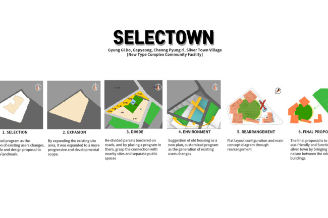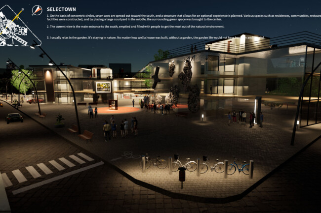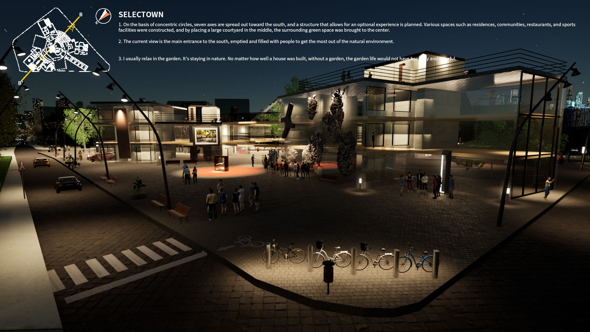 1. On the basis of concentric circles, seven axes are spread out toward the south, and a structure that allows for an optional experience is planned. Various spaces such as residences, communities, restaurants, and sports facilities were constructed, and by placing a large courtyard in the middle, the surrounding green space was brought to the center.