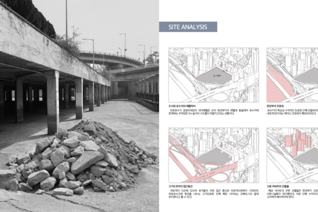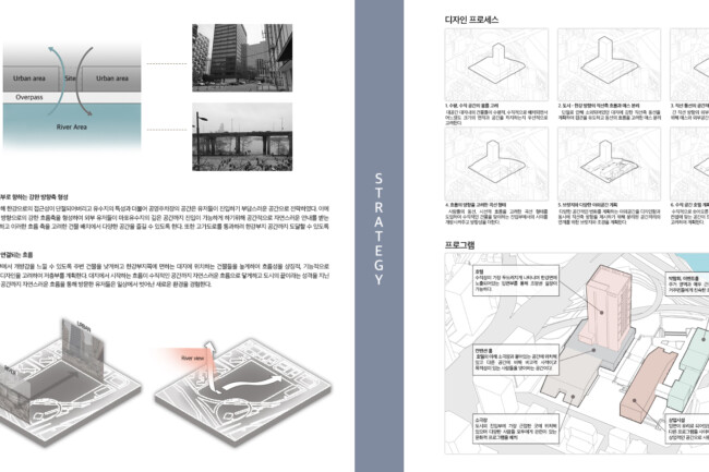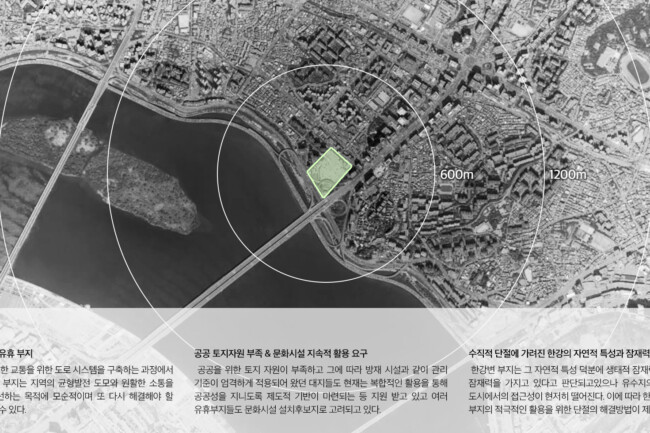 사이트의 특성을 분석하고 경계의 성격을 지닌 공간 재디자인을 통해 한강과 맞닿아 있으나 소외받고 있는 대공간의 재활용 가능성을 찾아 분석 및 활용한다. 넓은 유수지의 공간이 잃어버린 접근성을 직관적인 직선길을 제시함으로서 새로운 유저들의 발길을 끌어들이고 대지와 사람, 조망권의 원활한 흐름을 생성한다. 이러한 흐름의 연계를 통해 시민들이 요구하는 도심 속 쉼터의 공간을 계획하고 시민들이 참여 및 머무를 수 있는 공간을 제공하여 소외된 부지에 활력을 불어넣고자 한다.