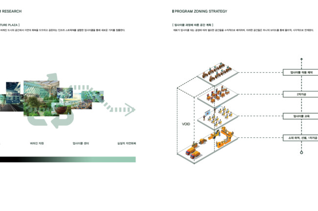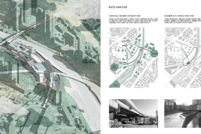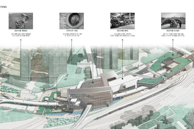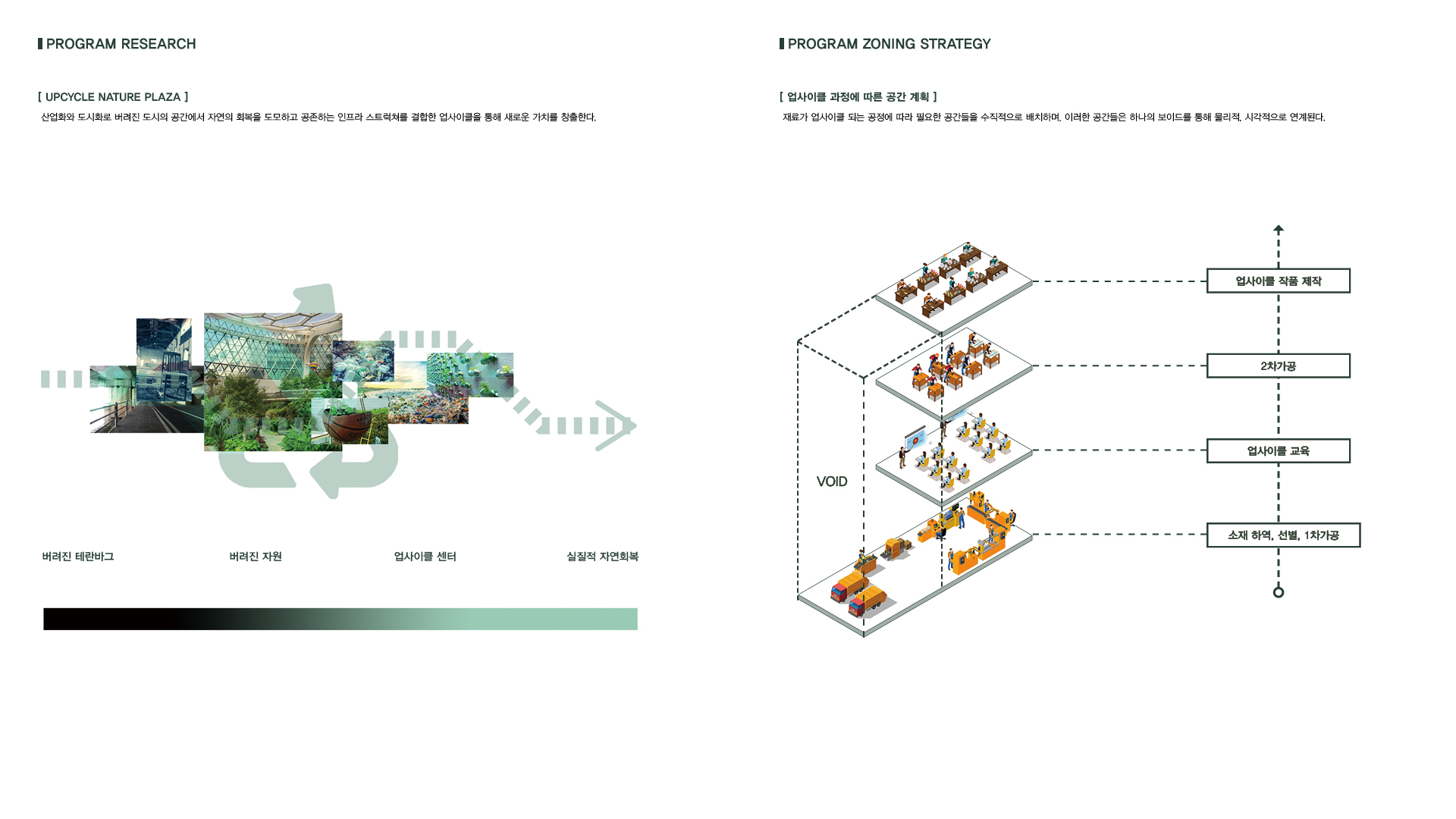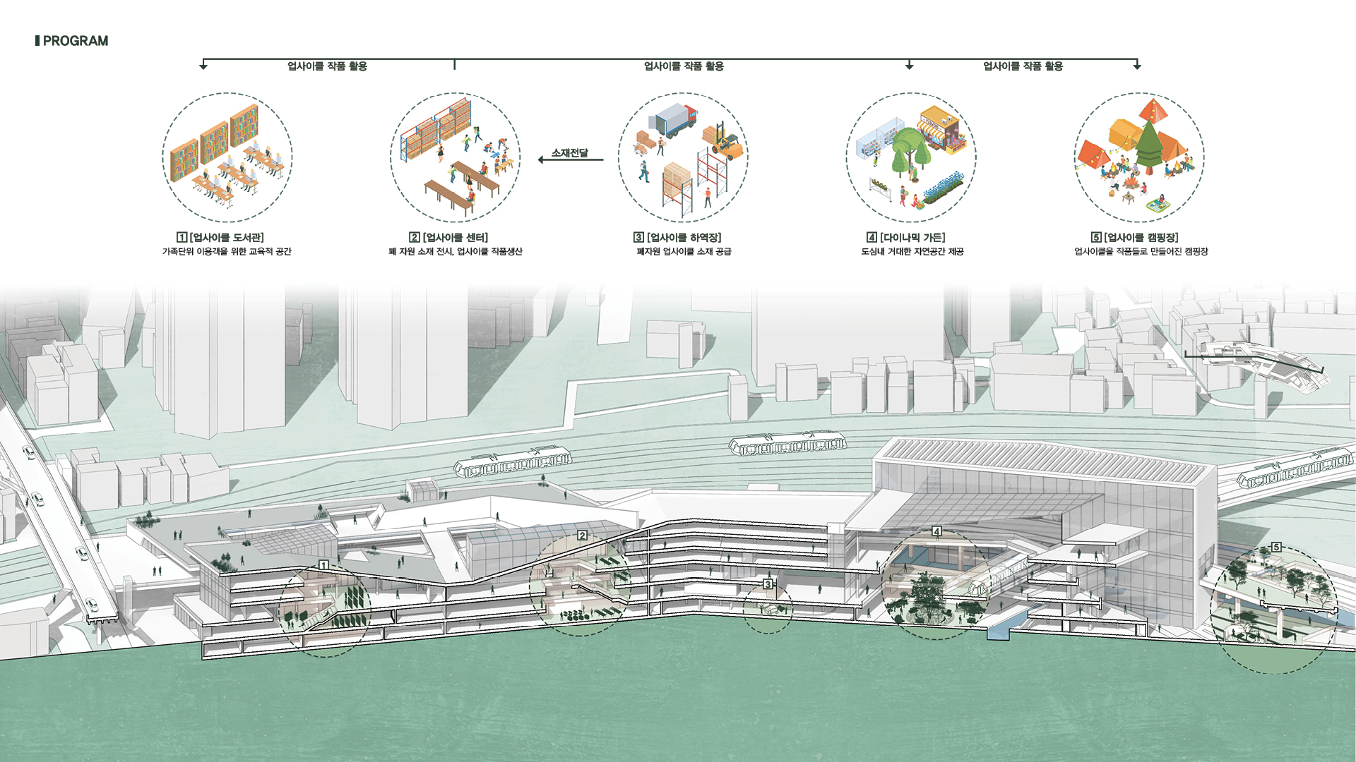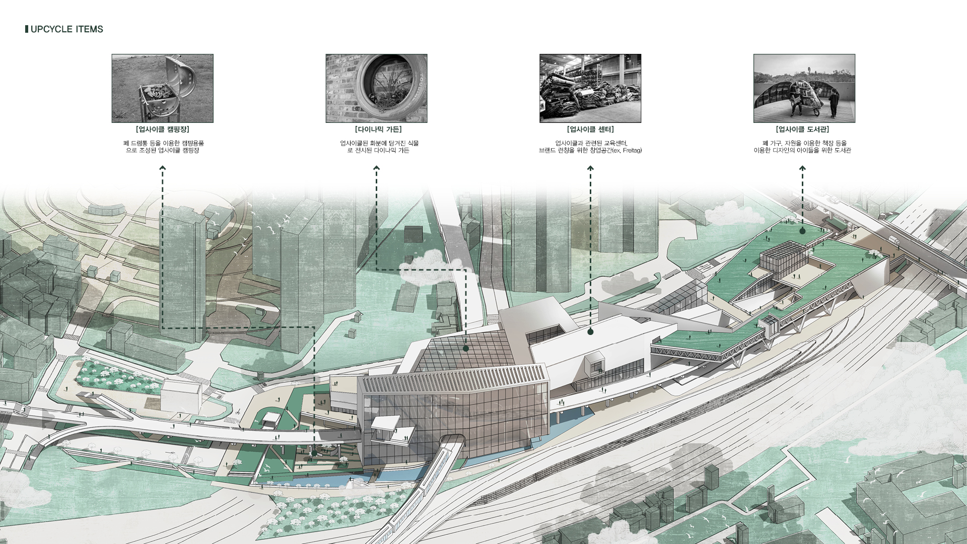 산업화와 도시화로 생겨난 테란바그, 즉 버려진 공간이 많은 용산 지역 중 각종 인프라 시설로 인해 테란바그의 경계에 위치한 사이트에서 단순히 버려진 공간의 재사용이 아닌 새로운 가치를 부여하는 업사이클을 통해 아이디어를 교류하며 지역사회를 통합하여 엮을 수 있는 교육 및 문화공간을 제안한다.