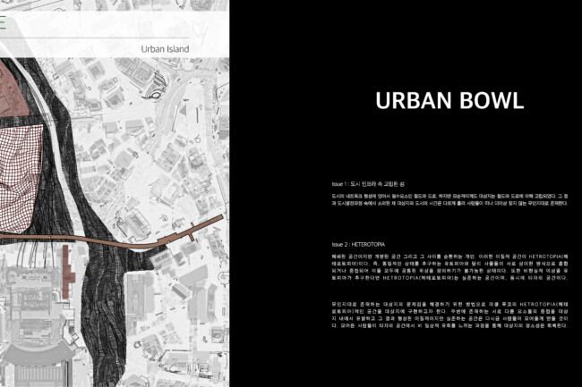 무인지대로 존재하는 대상지의 문제점을 해결하기 위한 방법으로 미셸 푸코의 HETROTOPIA(헤테로토피아)적인 공간을 대상지에 구현하고자 한다. 주변에 존재하는 서로 다른 요소들의 중첩을 대상지 내에서 유발하고 그 결과 형성된 이질적이지만 실존하는 공간은 다시금 사람들이 모여들게 만들 것이다. 모여든 사람들이 타자의 공간에서 비 일상적 유희를 느끼는 과정을 통해 대상지의 장소성은 회복된다.