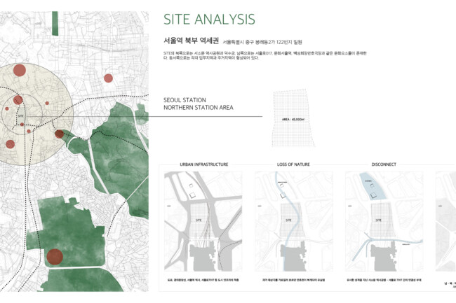 도시의 네트워크 형성에 있어서 필수요소인 철도와 도로. 하지만 모순적이게도 대상지는 철도와 도로에 의해 고립되었다. 그 결과 도시발전과정 속에서 소외된 채 대상지와 도시의 시간은 다르게 흘러 사람들이 떠나 더이상 찾지 않는 무인지대로 존재한다.