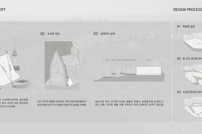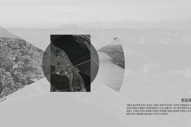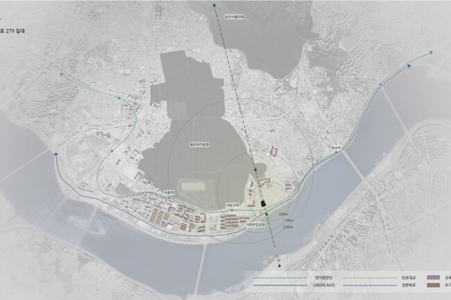 현재는 대상지에 아파트가 들어설 것으로 계획되어 있으나 이 구역을 일부 사람들만 이용하는 것이 아닌 시민들과 인근 주민들 모두가 이용할 수 있도록 내어주고 고가도로, 전철, 내선도로 등을 극복한 입체설계를 통해 대상지로부터 수공간(한강)으로의 접근을 용이하게끔 계획한다.