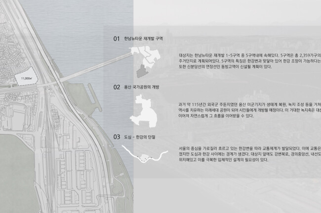 서울의 중심, 용산구 서빙고동에 위치하고 있는 대상지는 현재 한남 뉴타운 개발구역에 포함되어있다. 대상지 앞에 위치한 한강은 쾌적하고 안전한 보행로와 자전거 통행 길을 갖추고 있다. 하지만 한강은 수많은 광폭의 간선도로들과 교량들로 인해 도심과 단절되어 있는 상태이다. 더욱이 서빙고역은 지상철인 경의 중앙선이 지나감으로써 단절 문제를 심화시키고 있다. 이런 요소들로 인하여 한강과 도심 사이에는 경계가 생기게 되었고 그 결과 우리의 일상에서 한강은 잠재력을 제대로 발휘하지 못하는 경우가 빈번하다.