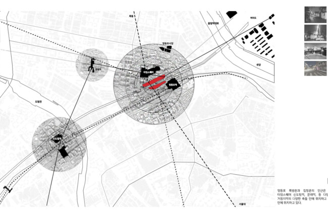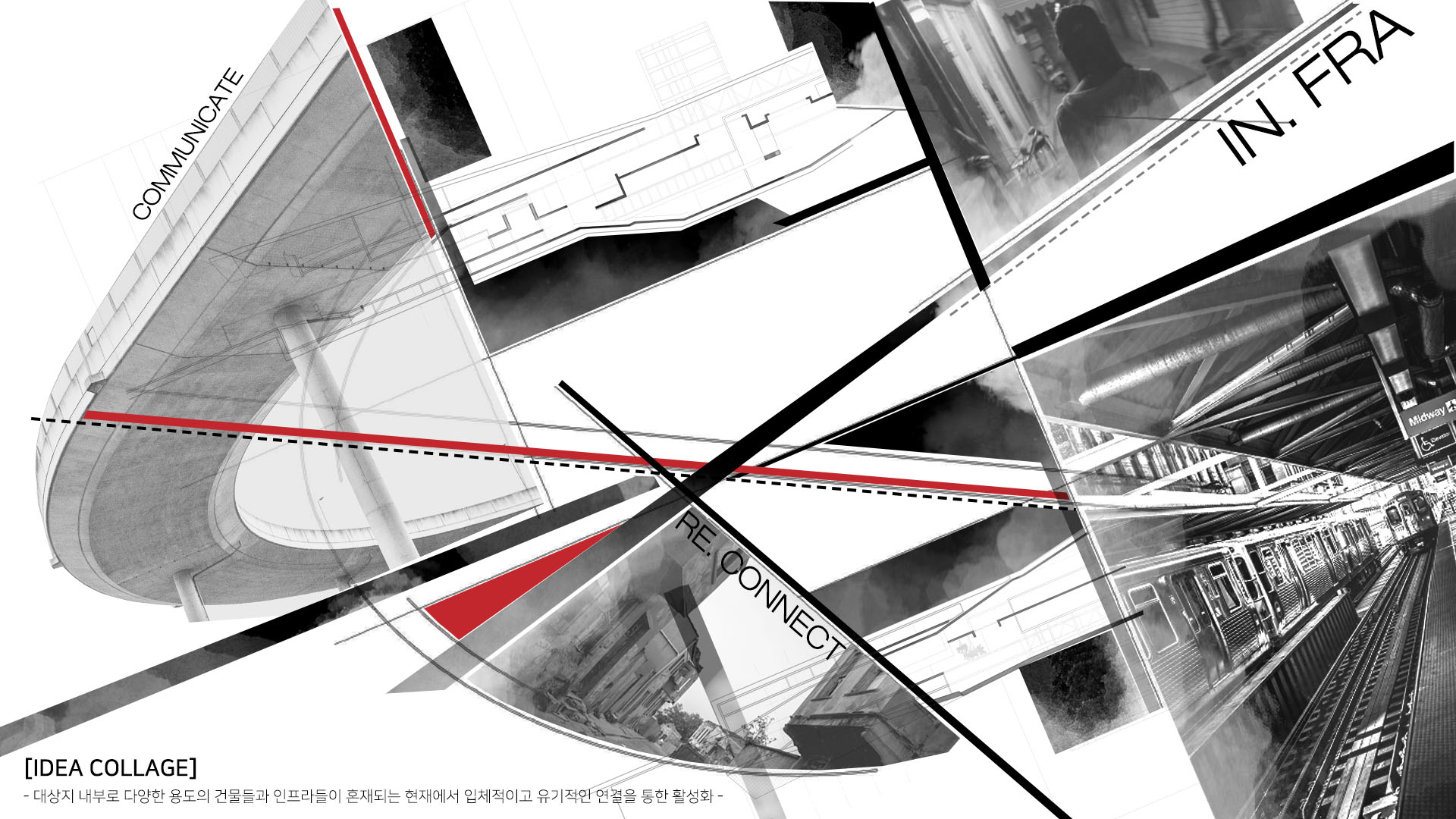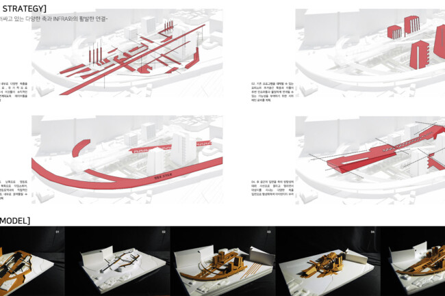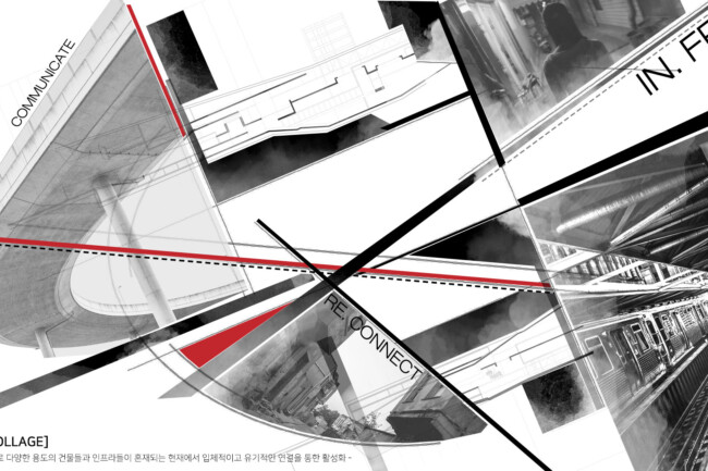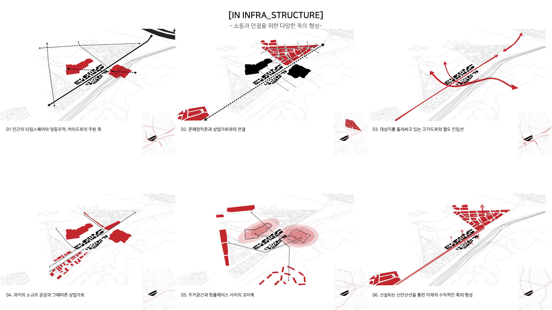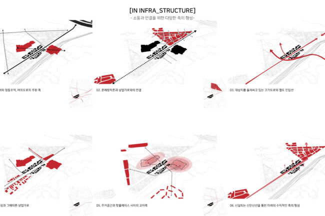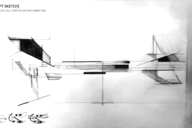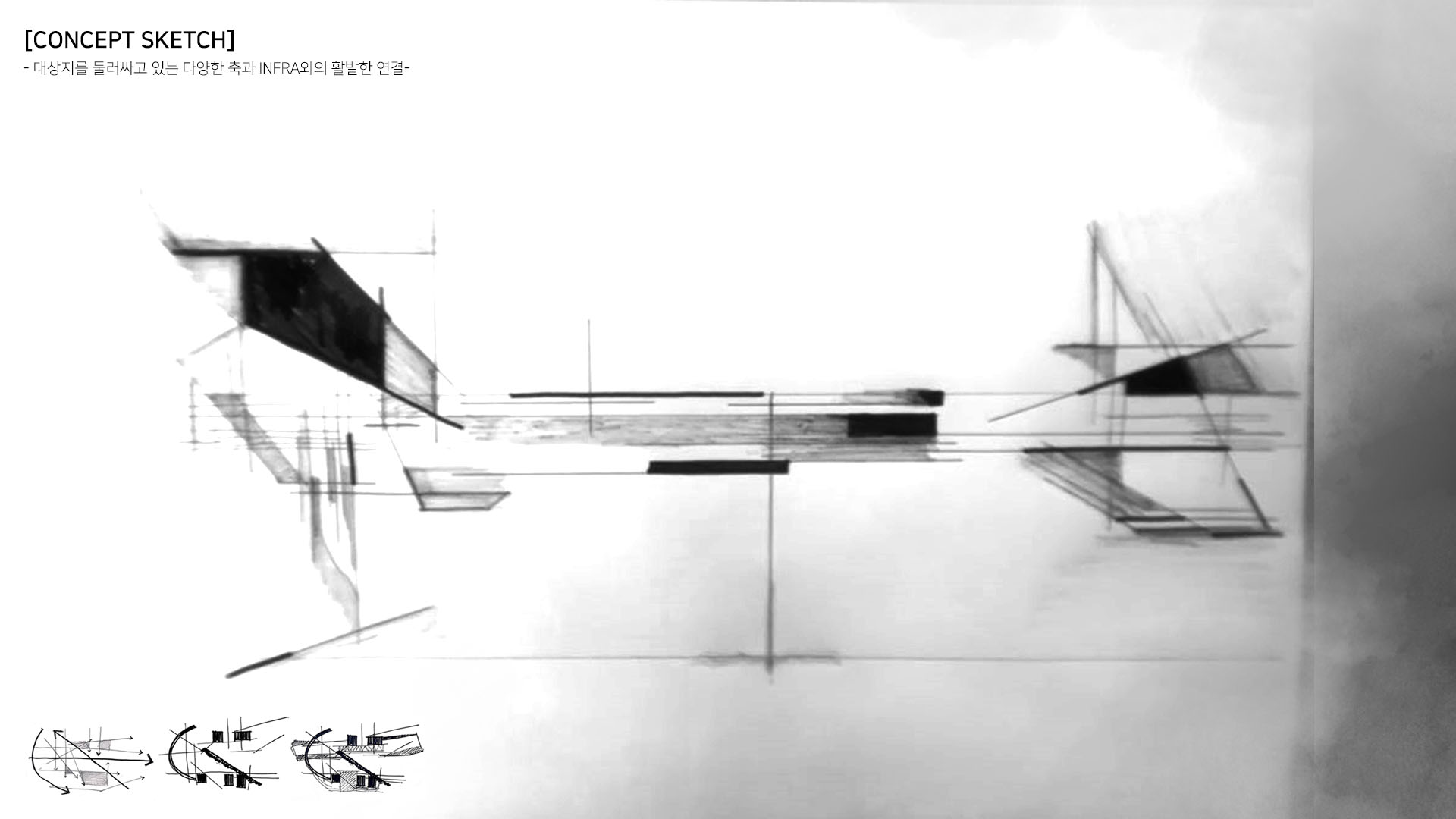 하지만 이 공간들은 도시적인 축에서 중요한 결절점에 위치하고 있다. 가시적인 도시형태의 선, 비가시적이고 추상적인 선들이 장소와 도시 사이의 경계를 약화시키고, 그만의 장소성을 만들어내어 도시적인 맥락들과 끊임없이 이어진다. 도시적인 컨텍스트들과, 과거의 흔적을 통한 비가시적인 축, 가시적인 도시의 형태들을 선들의 중첩과 교차를 주요 사회기반시설들과 함께 풀어내어 교류와 소통의 공간을 만들어내고자 한다.