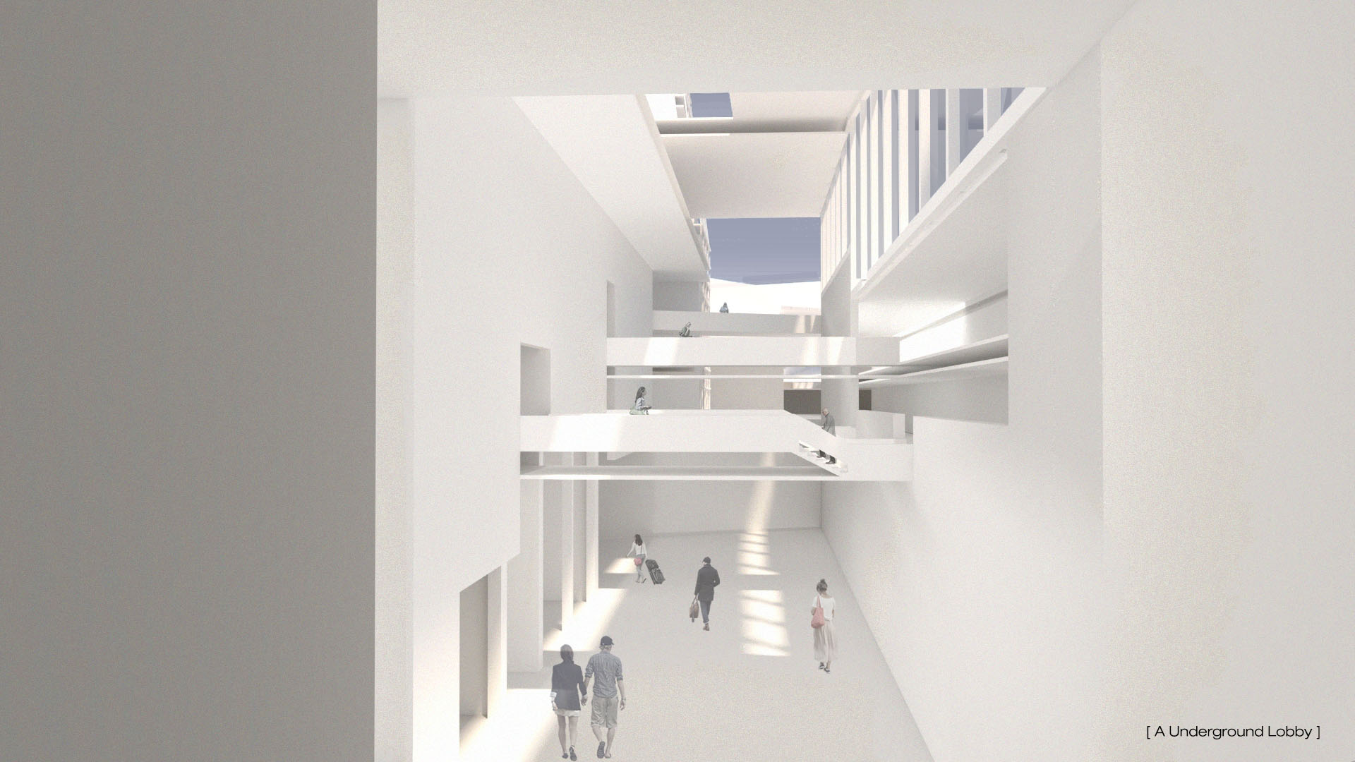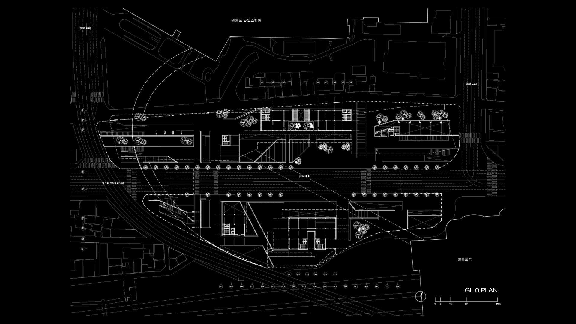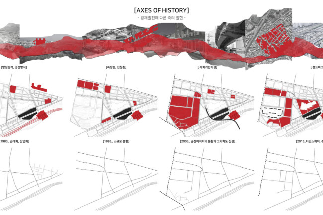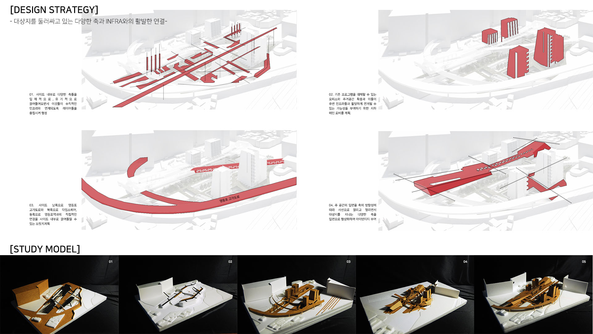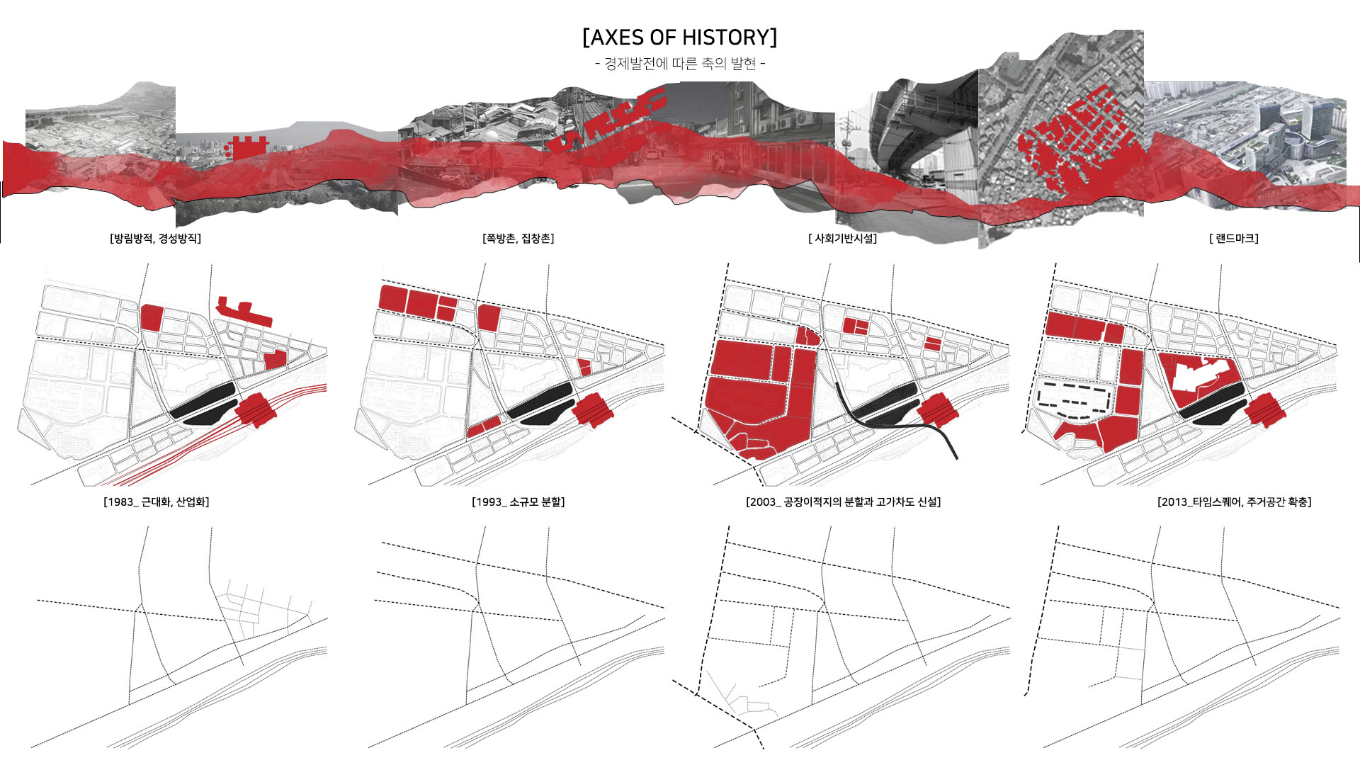 하지만 이 공간들은 도시적인 축에서 중요한 결절점에 위치하고 있다. 가시적인 도시형태의 선, 비가시적이고 추상적인 선들이 장소와 도시 사이의 경계를 약화시키고, 그만의 장소성을 만들어내어 도시적인 맥락들과 끊임없이 이어진다. 도시적인 컨텍스트들과, 과거의 흔적을 통한 비가시적인 축, 가시적인 도시의 형태들을 선들의 중첩과 교차를 주요 사회기반시설들과 함께 풀어내어 교류와 소통의 공간을 만들어내고자 한다.