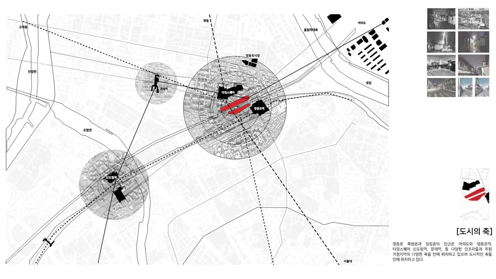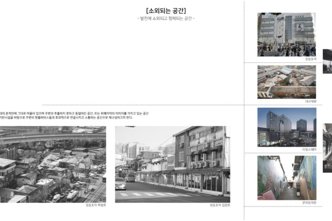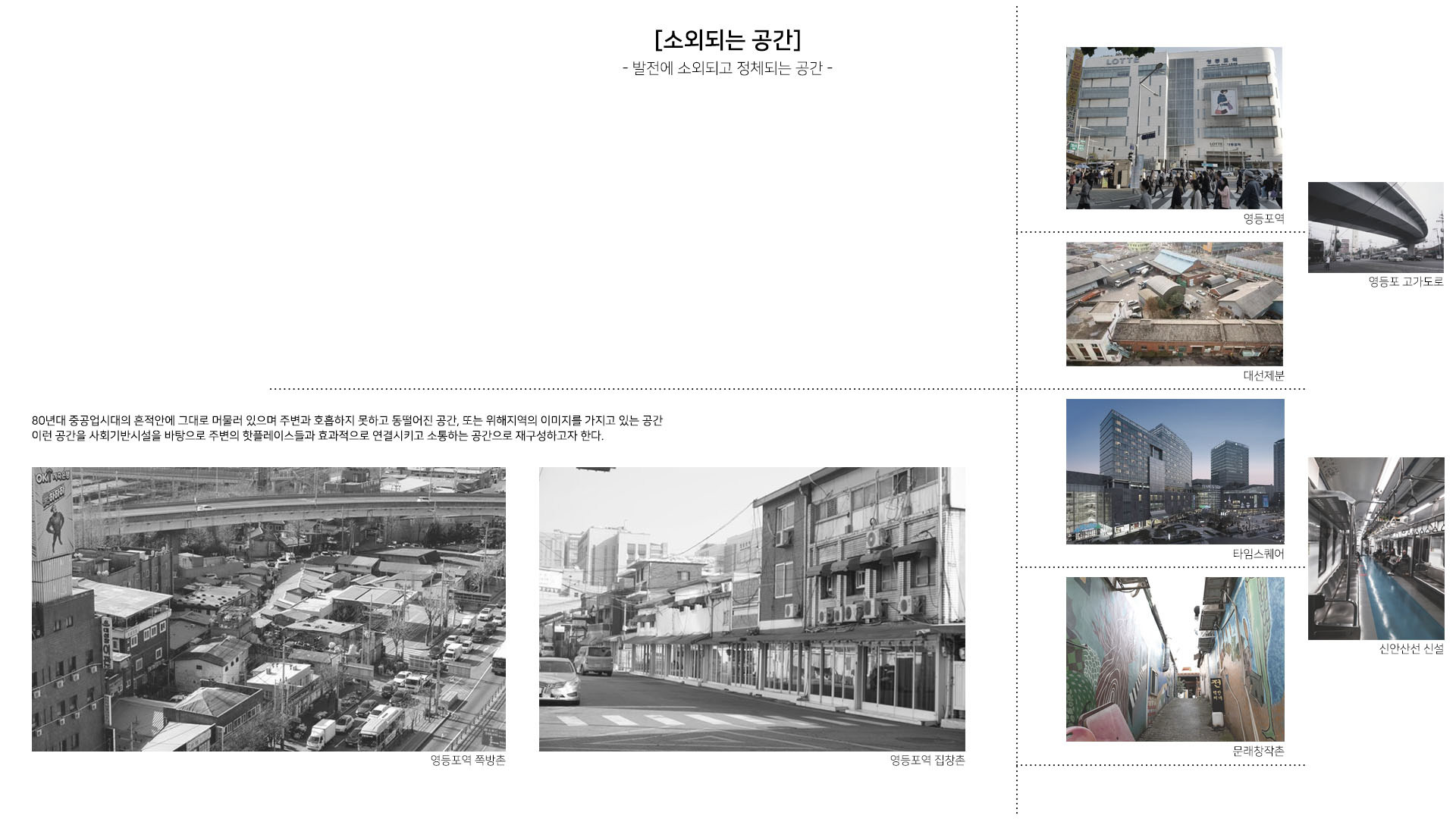 영등포 쪽방촌과 집창촌 역시 영등포 인근에서 위해지역, 혹은 청소년 출입금지구역으로 지정되어 도시미관을 해치고 있다. 또한 주변공간과 명백하게 단절되어 있을 뿐만 아니라, 연계가 되지 못하고 동떨어져 있다. 그리하여 점점 정체되어 가고 있는 것이다.